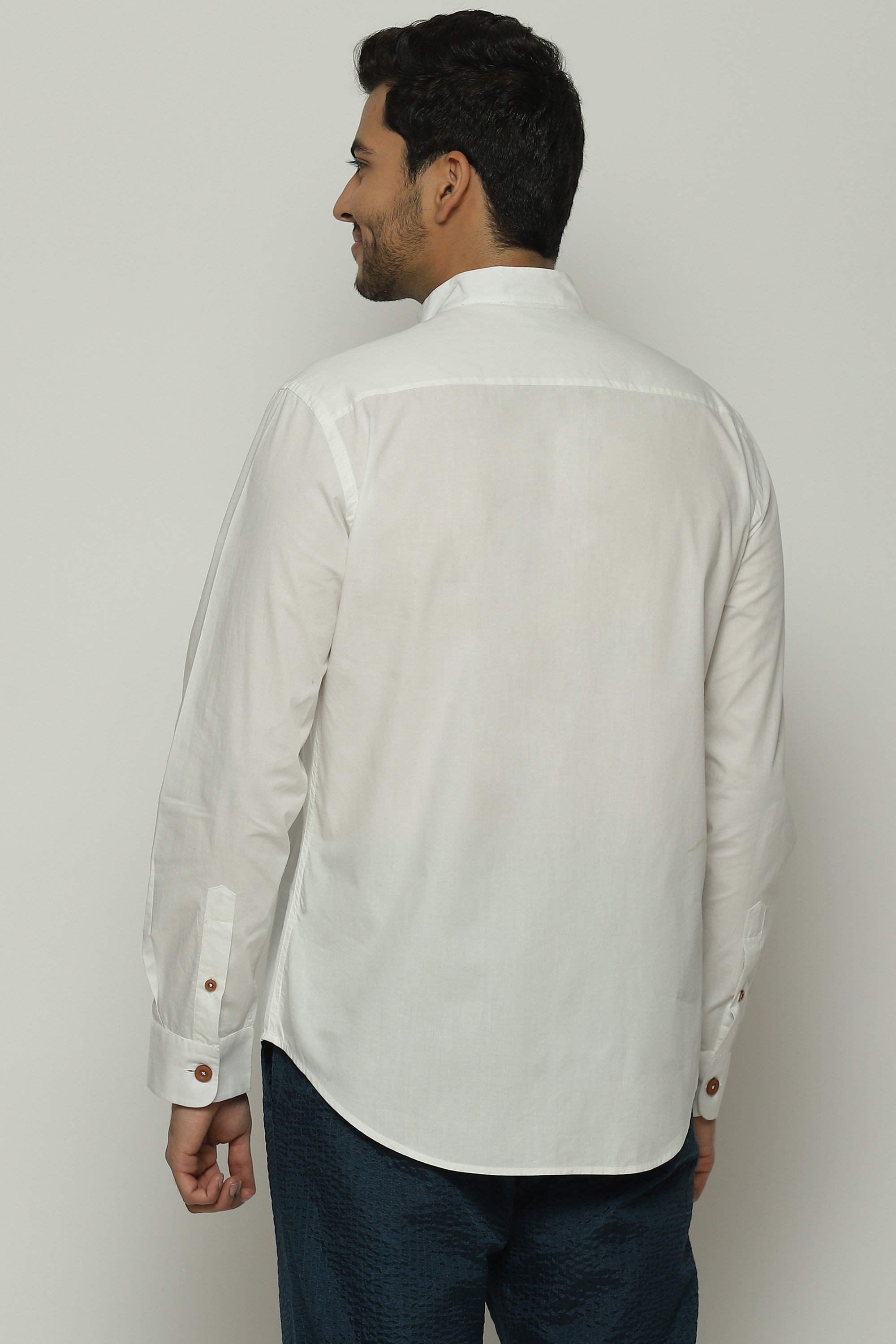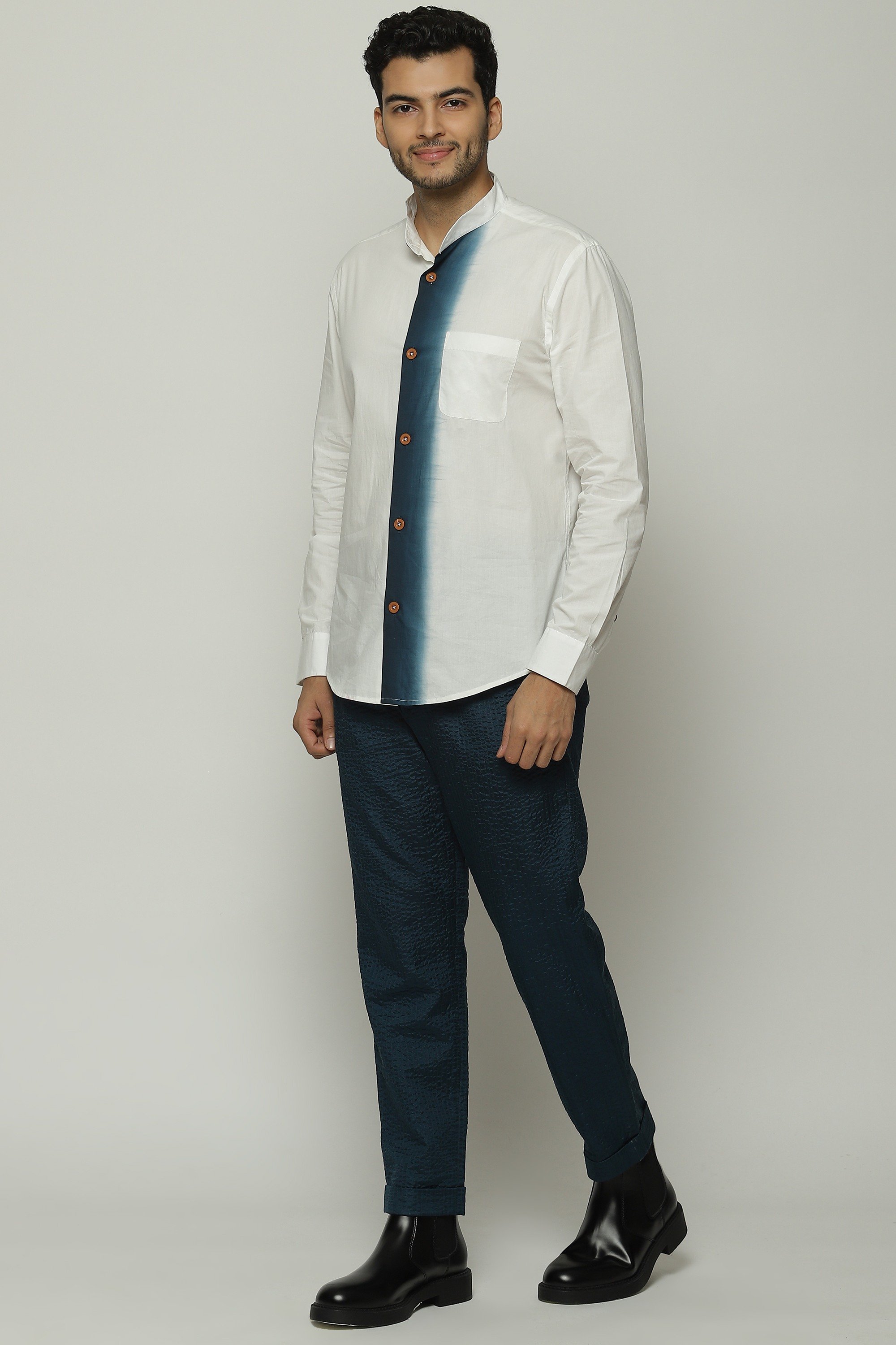 An ivory shirt with a denim-blue ombre. Part of Body Language — a collection that seeks to capture the intricacies of human connection in fabric — this piece is crafted from cotton poplin. Best paired with the collapse of binaries.