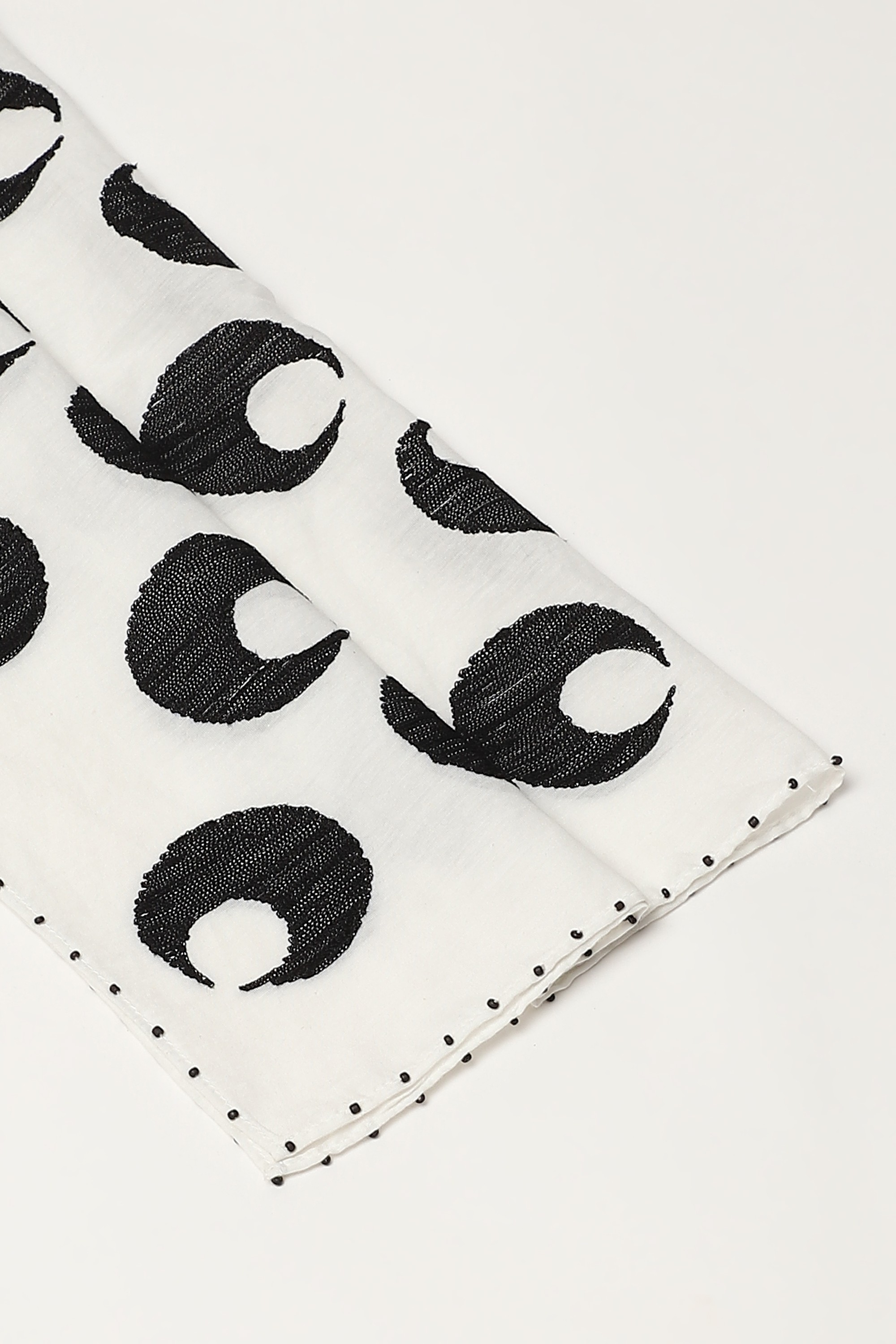 The Turkish moon, embroidered with silk on an ivory scarf. Body Language — the latest edit from Abraham & Thakore — explores humanity's connection with nature. Crafted in a blend of silk and cotton, the crescent moon motifs on this creation are crewel embroidered with silk yarn. Best paired with a hookah.