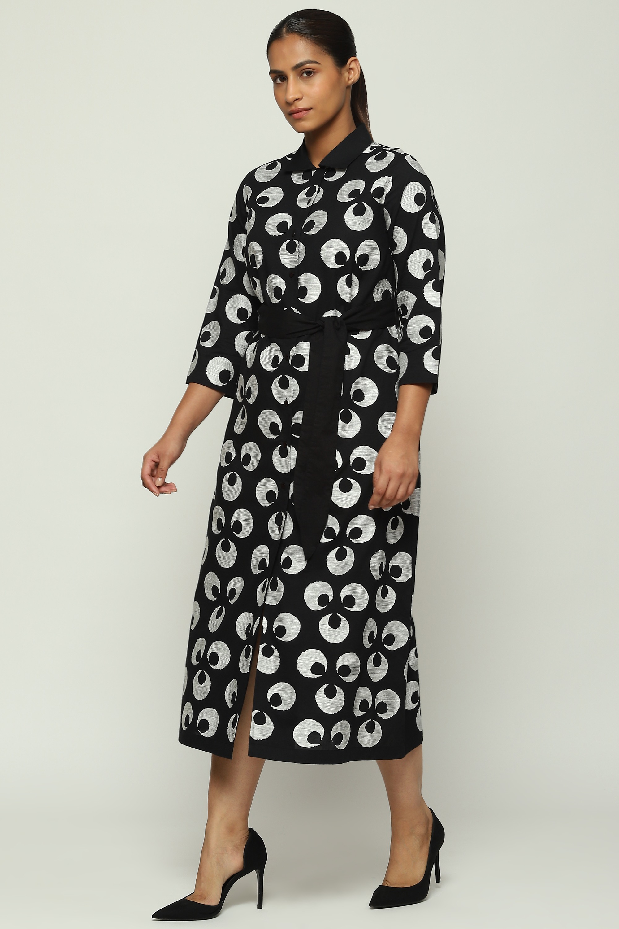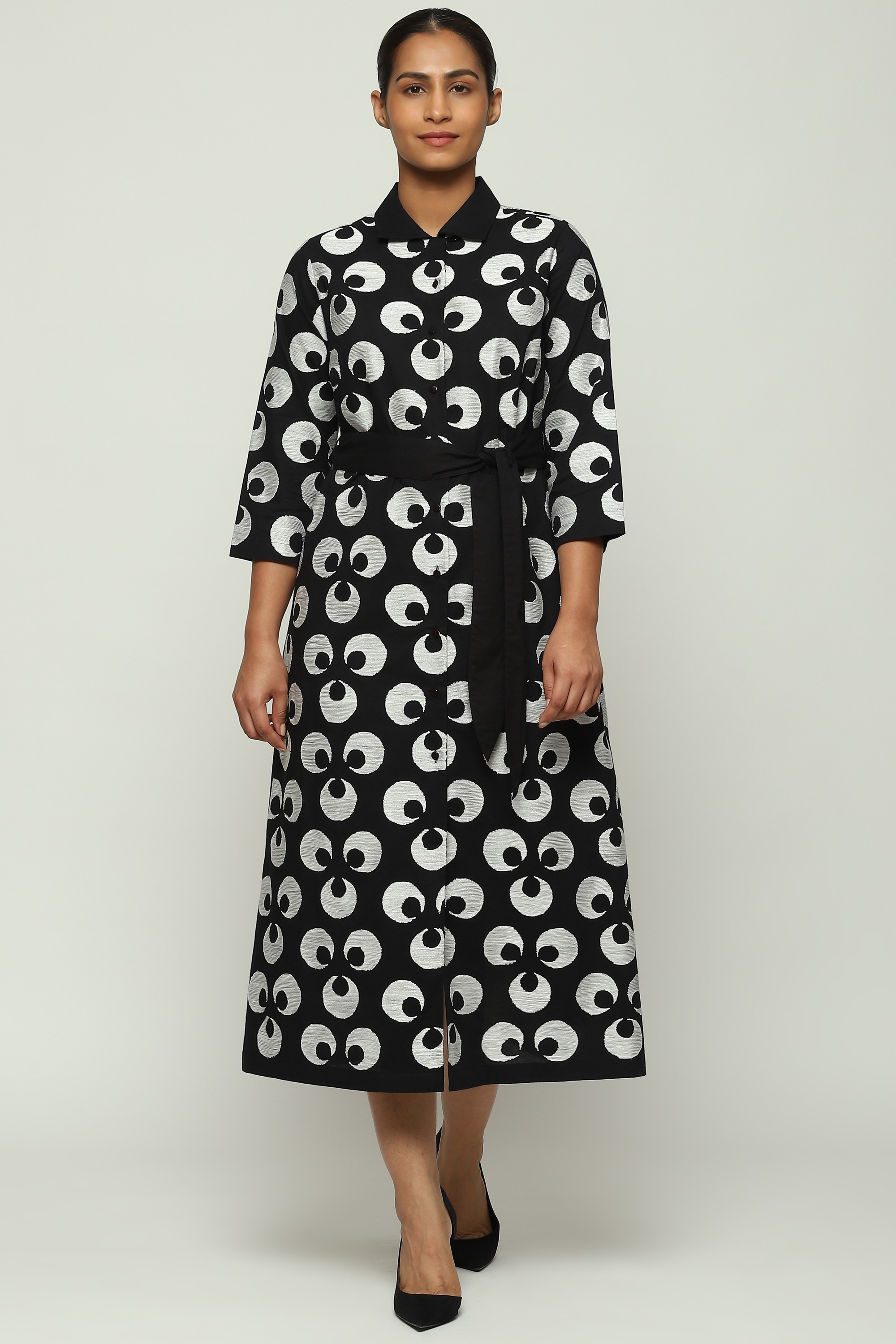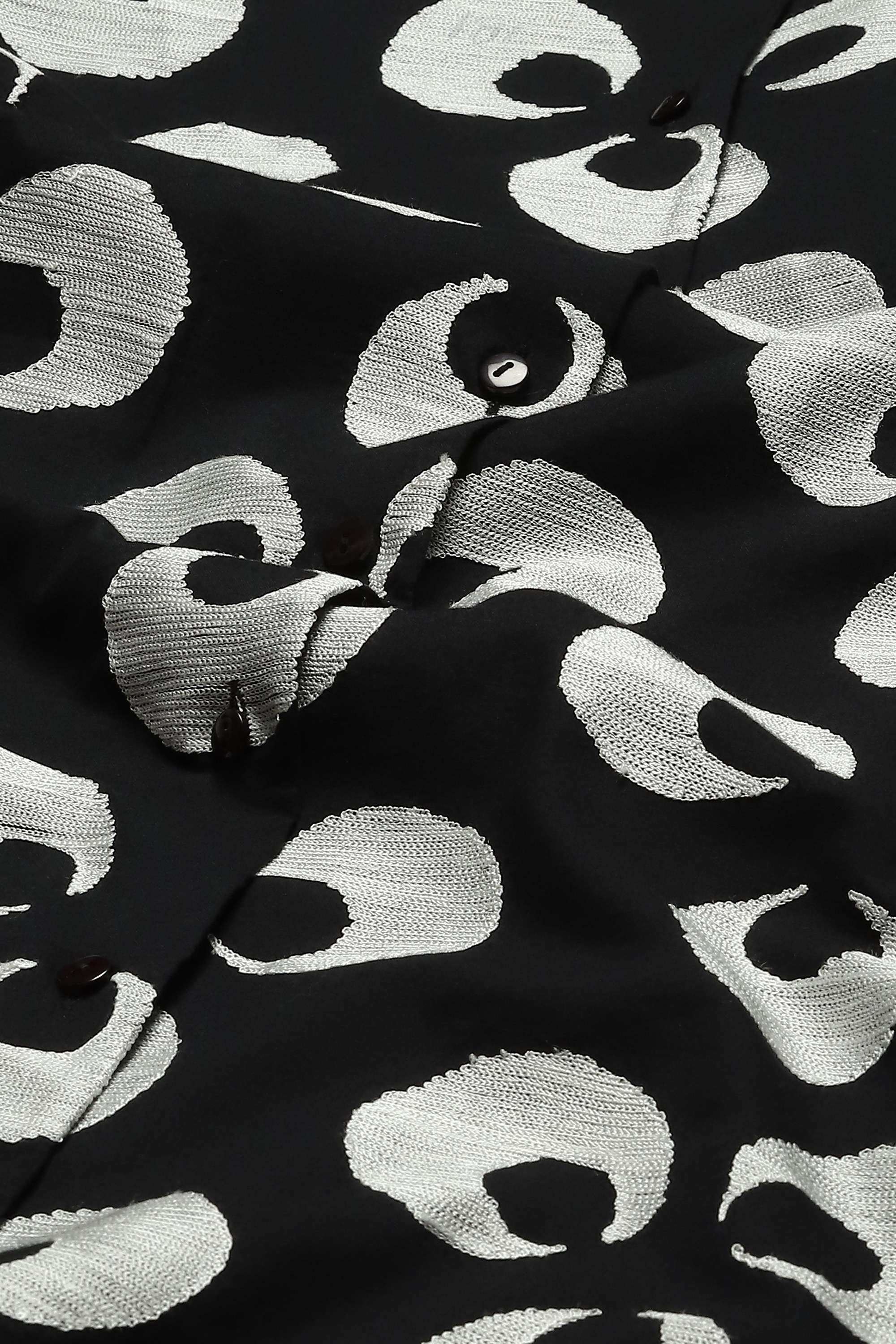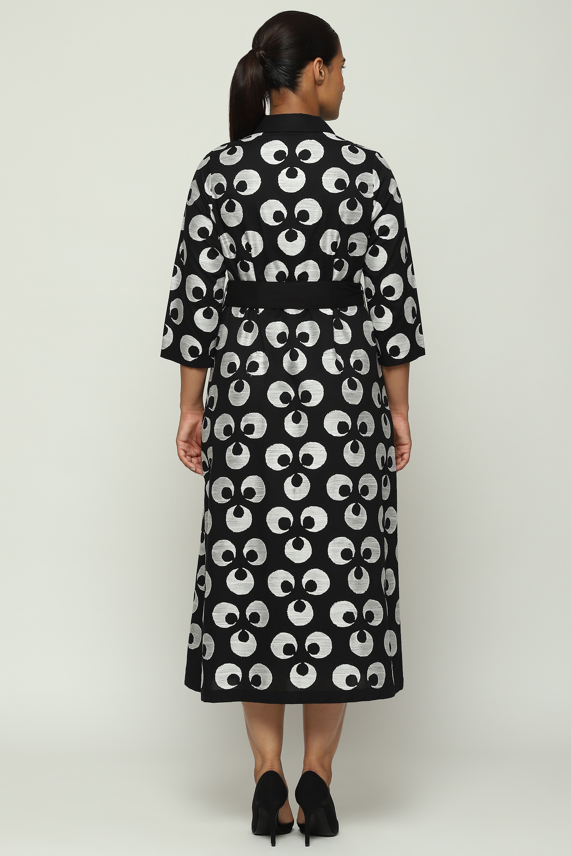 The Turkish moon, embroidered with silk on a black shirt dress.