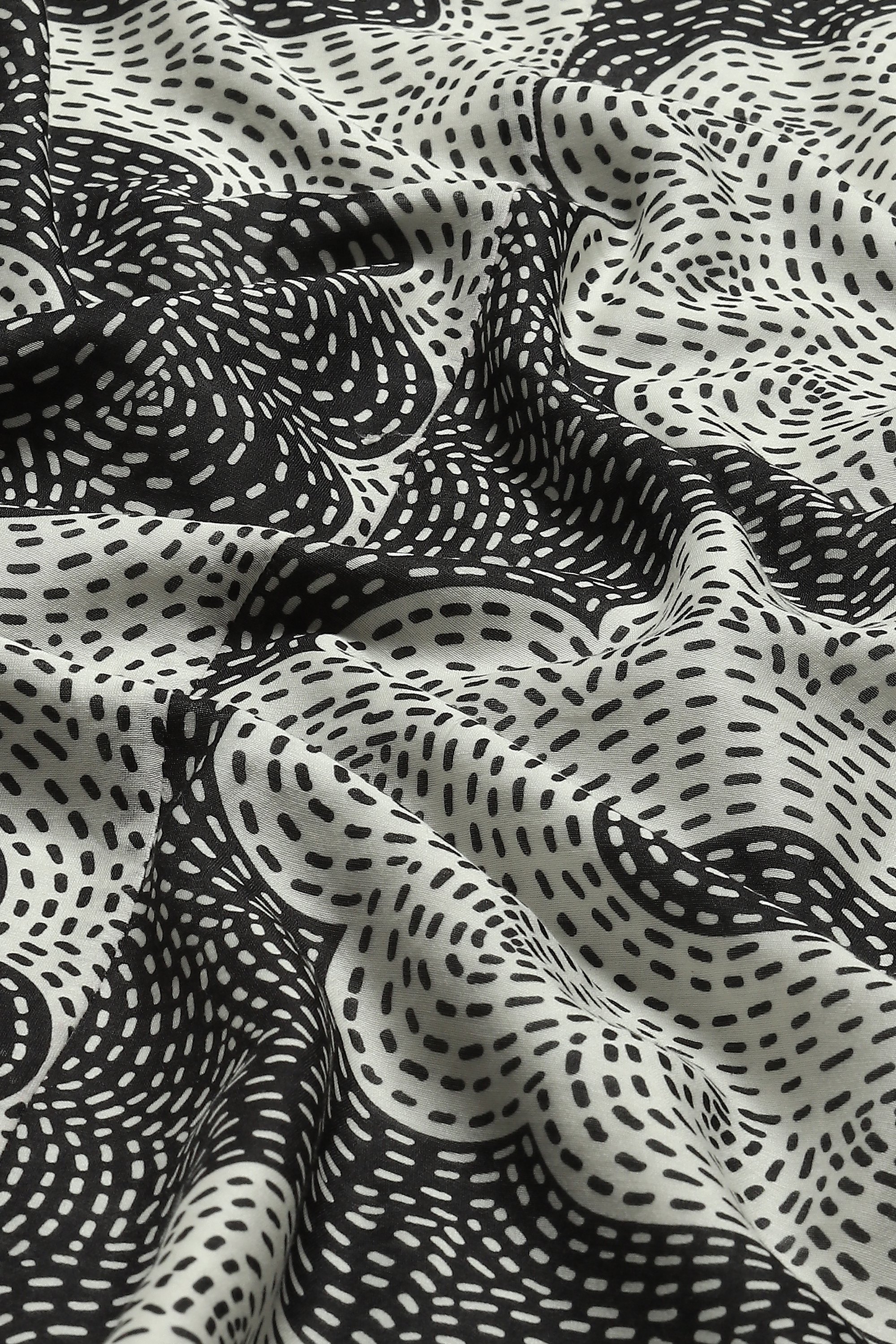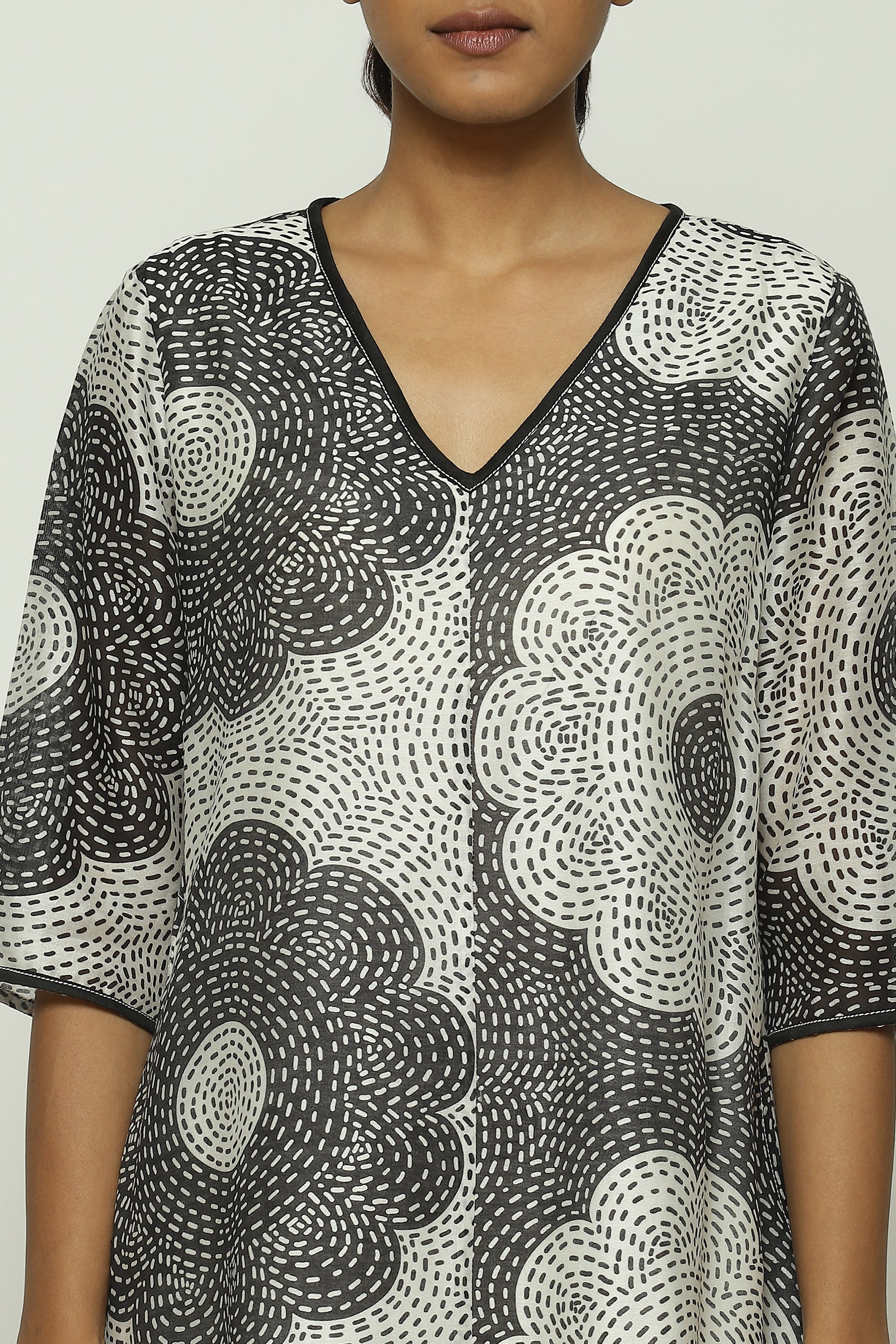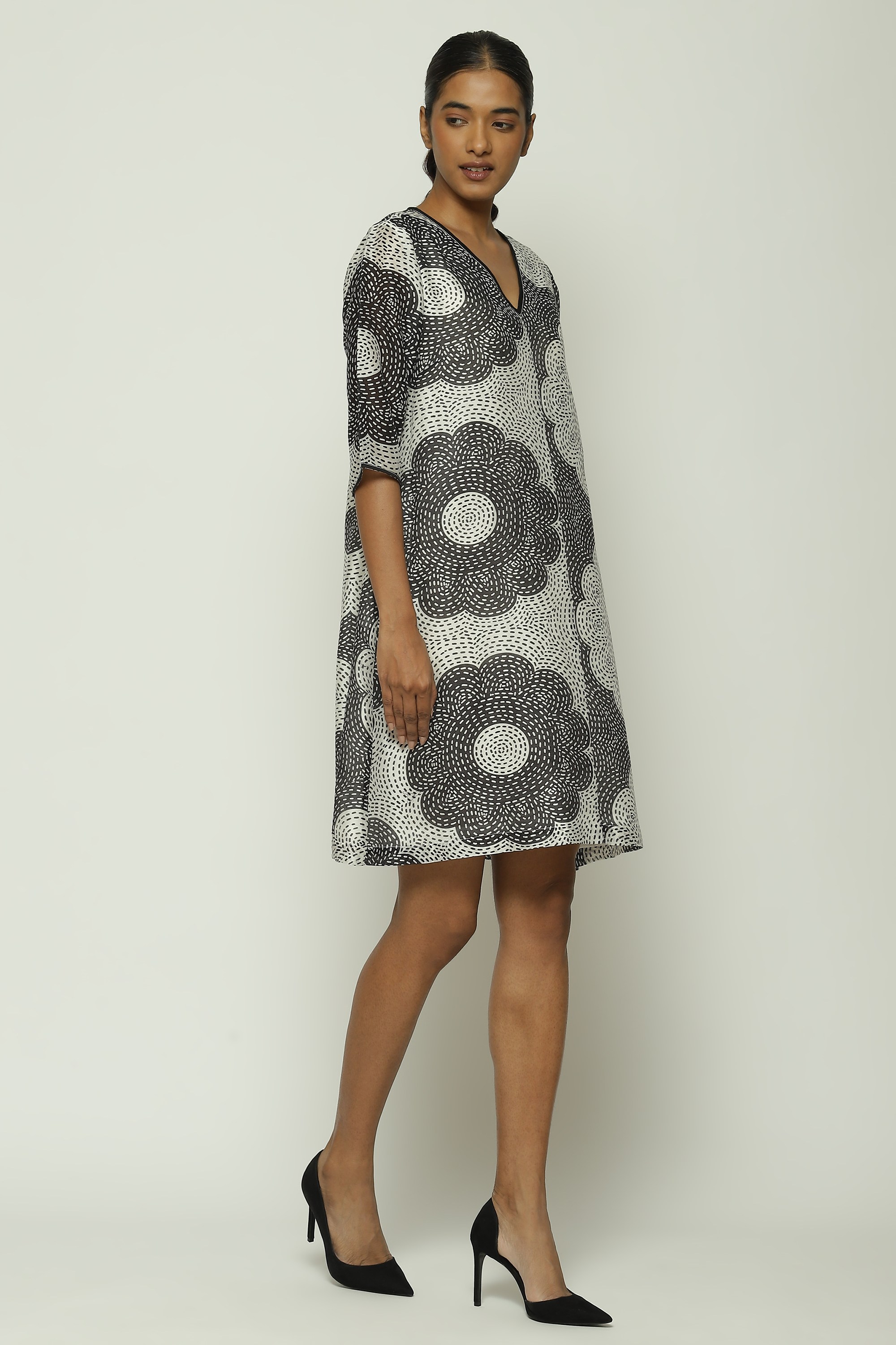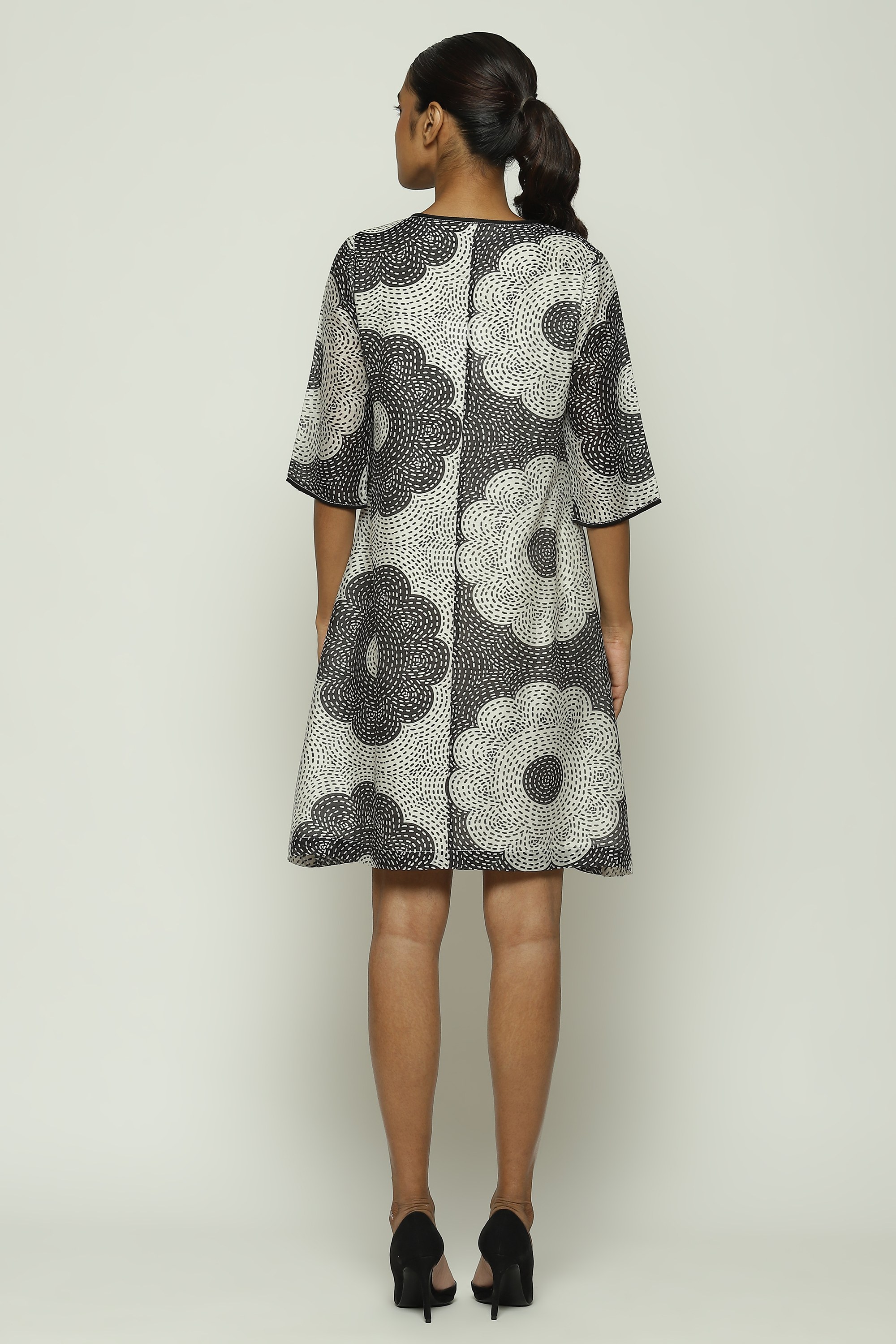 A symbol of joy, printed in kantha stitches on a black and white dress.
