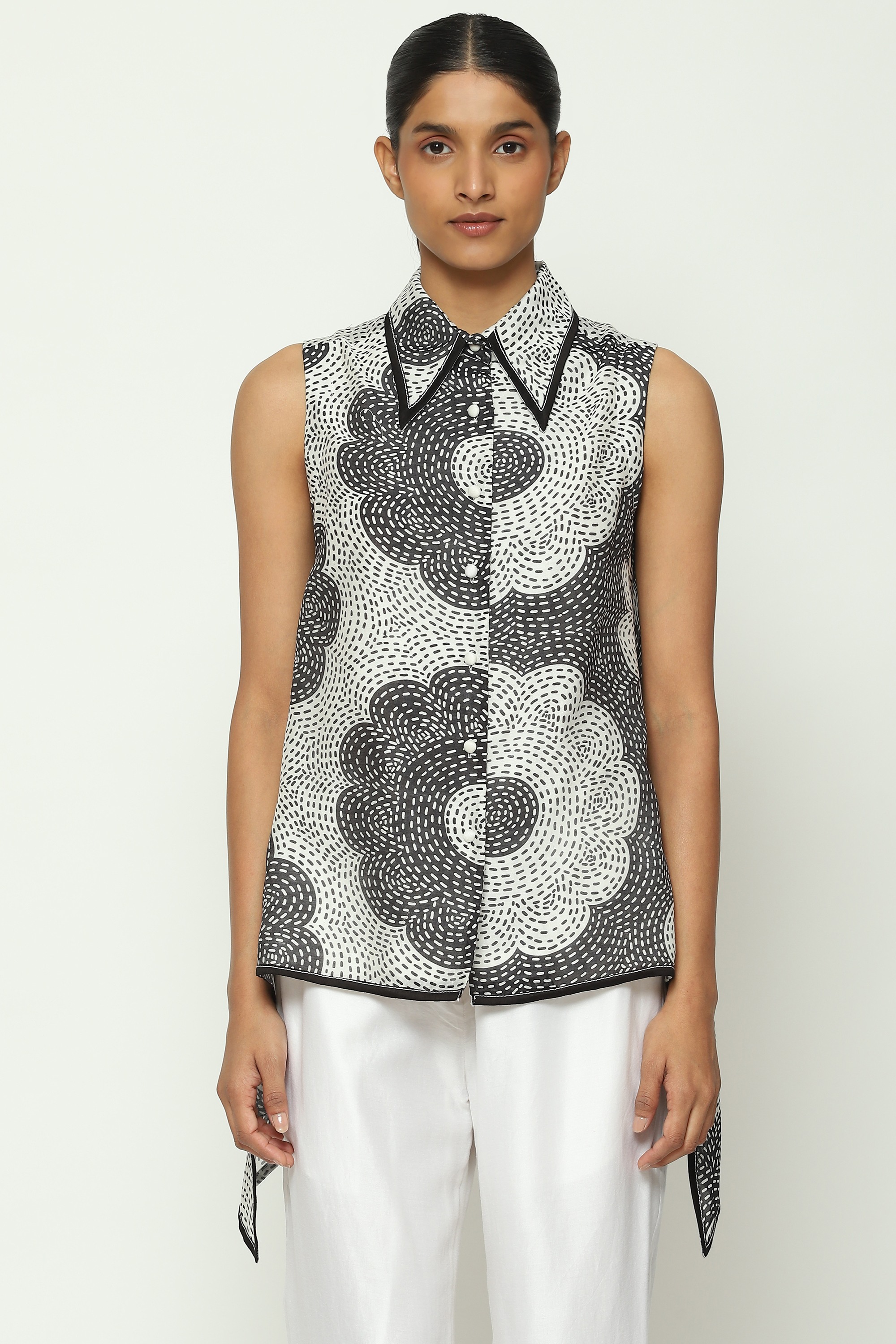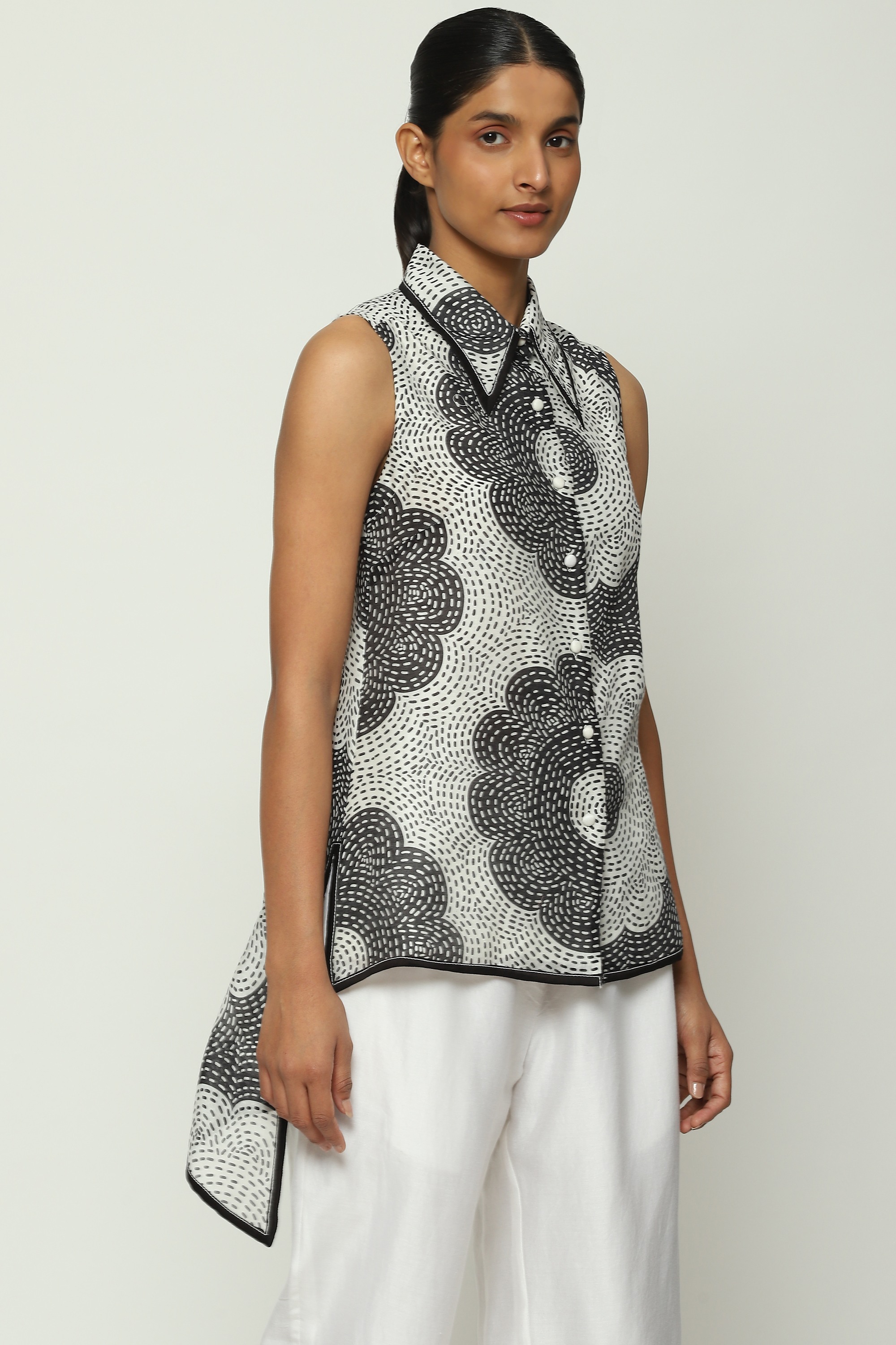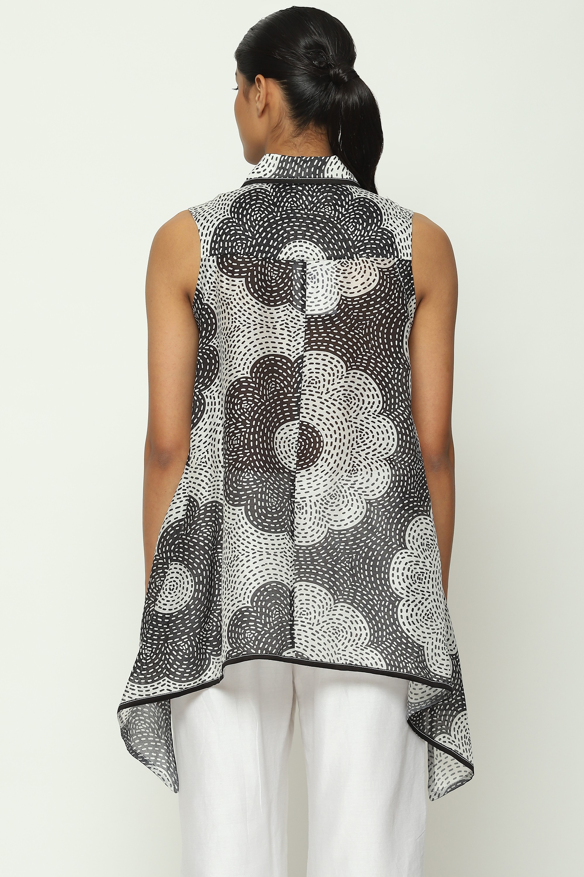 A symbol of joy, printed in kantha stitches on a black and white top.