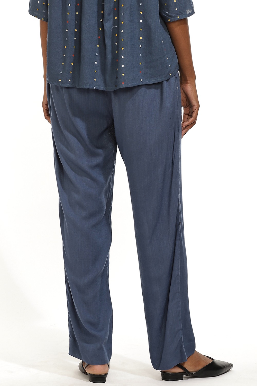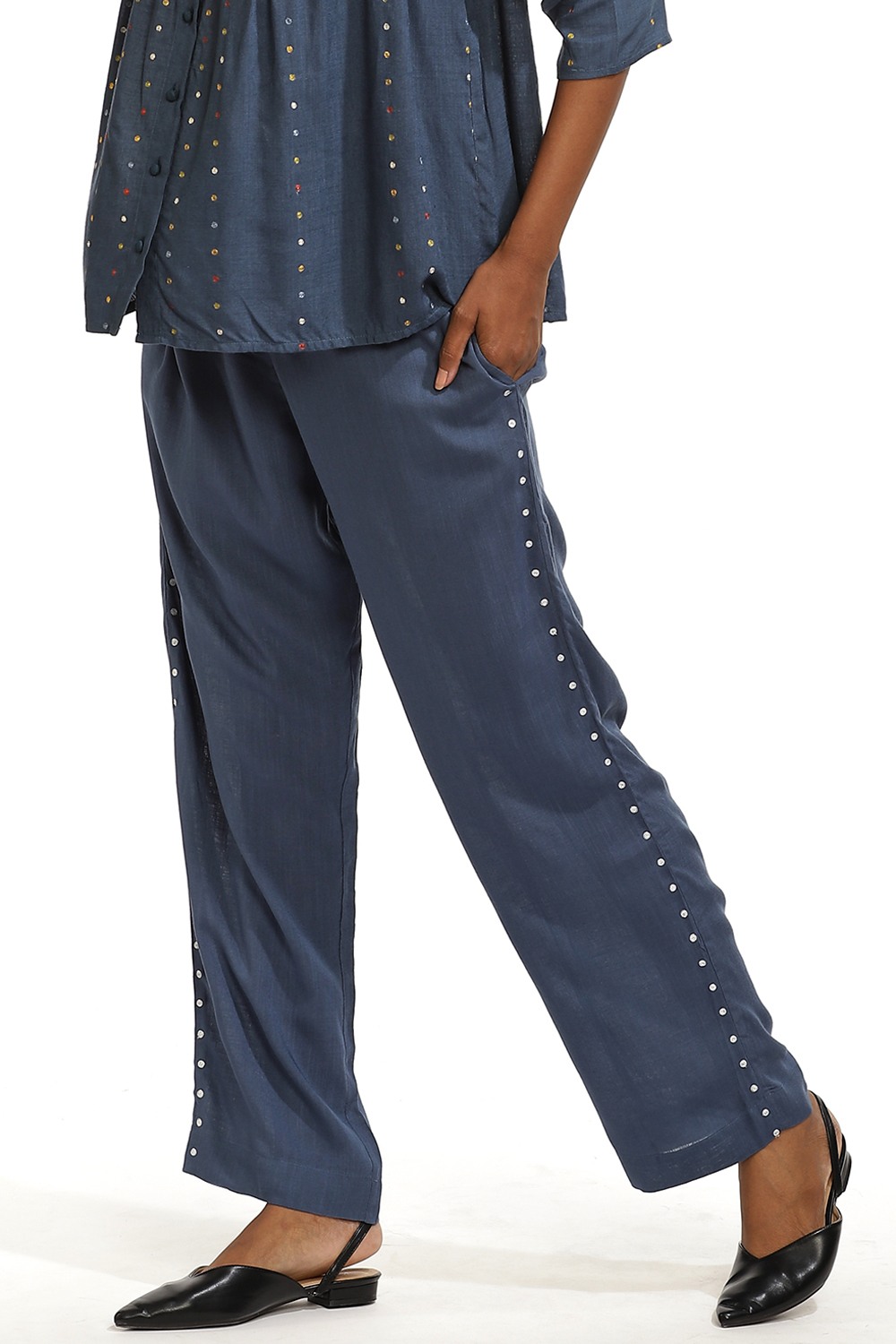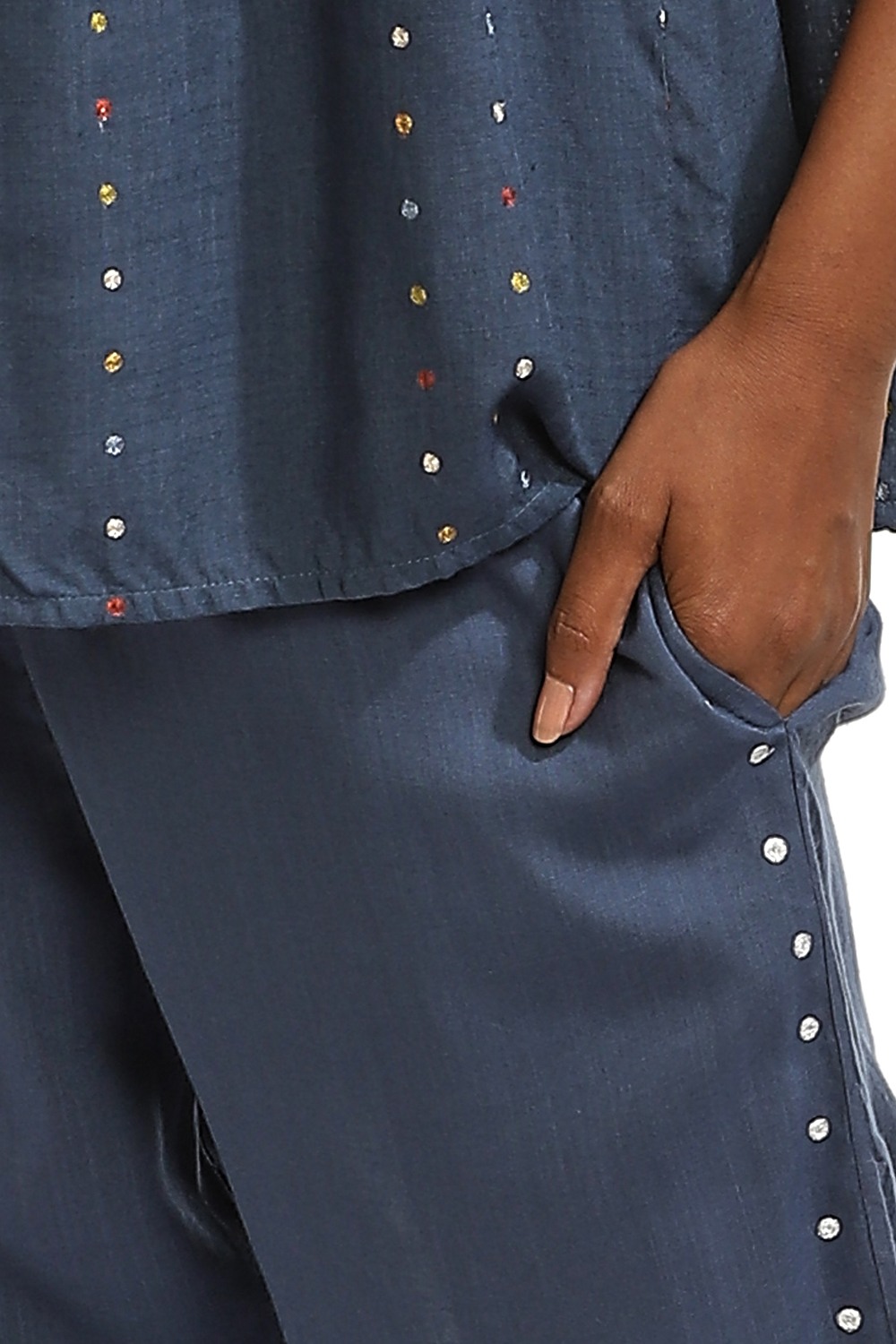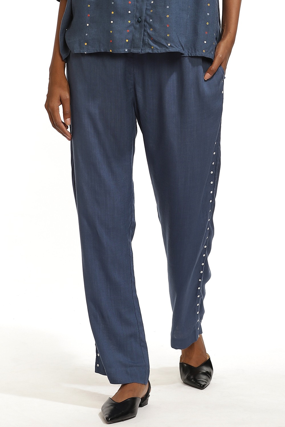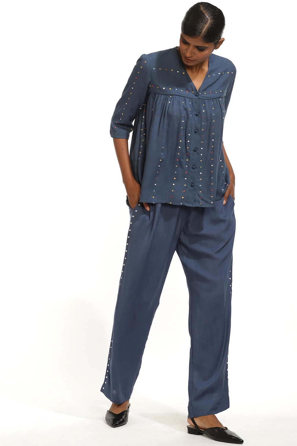 Indigo Sustainable Viscose With Ivory Embroidered Dots.