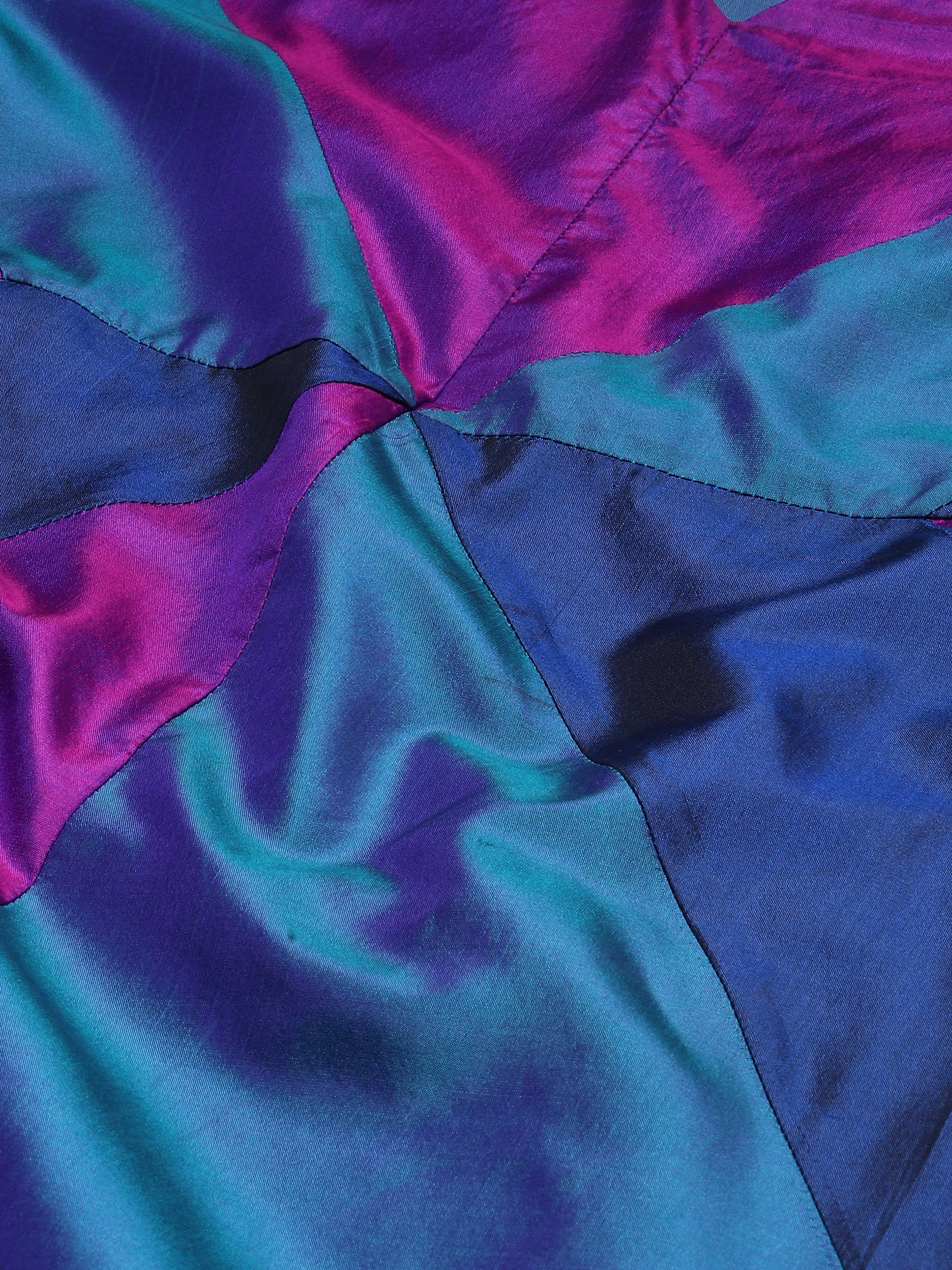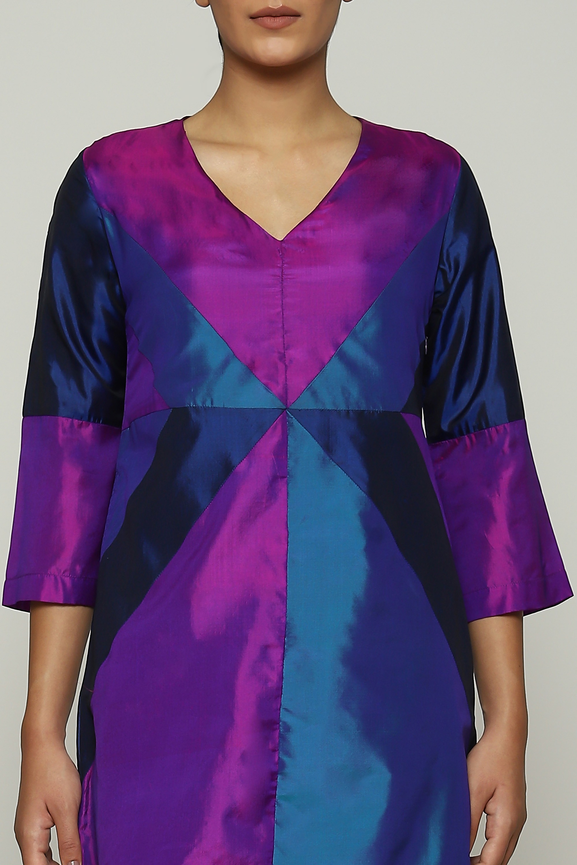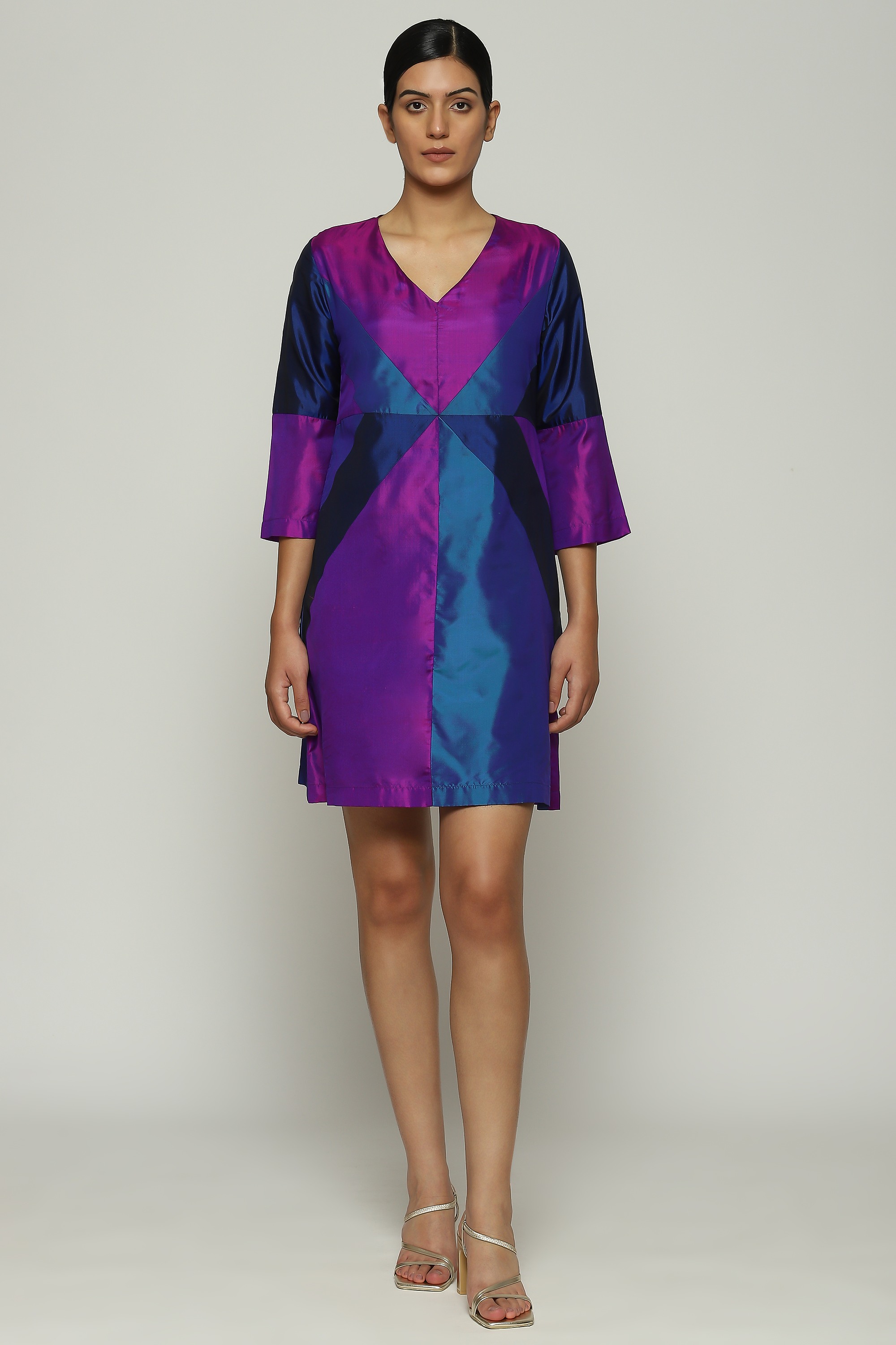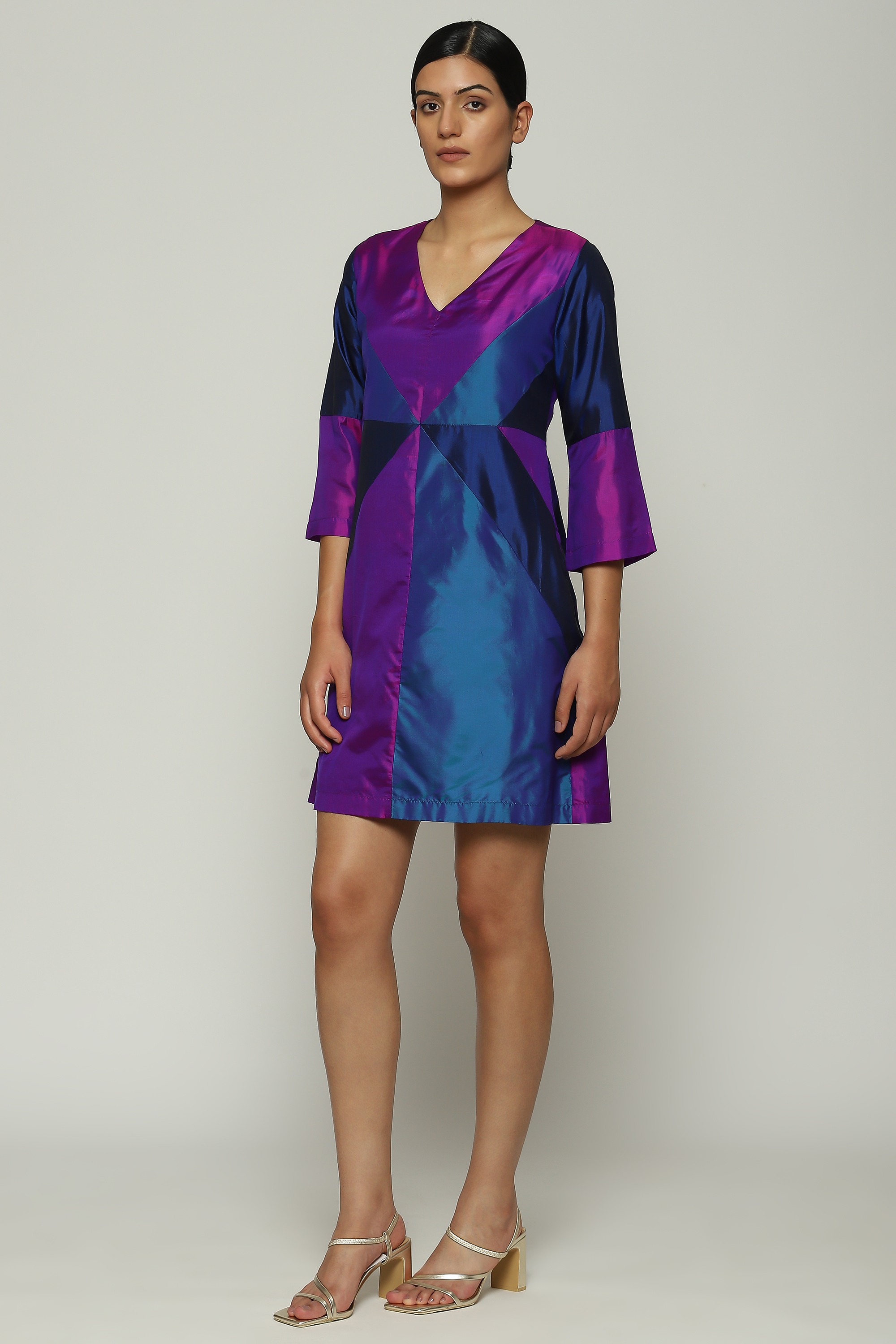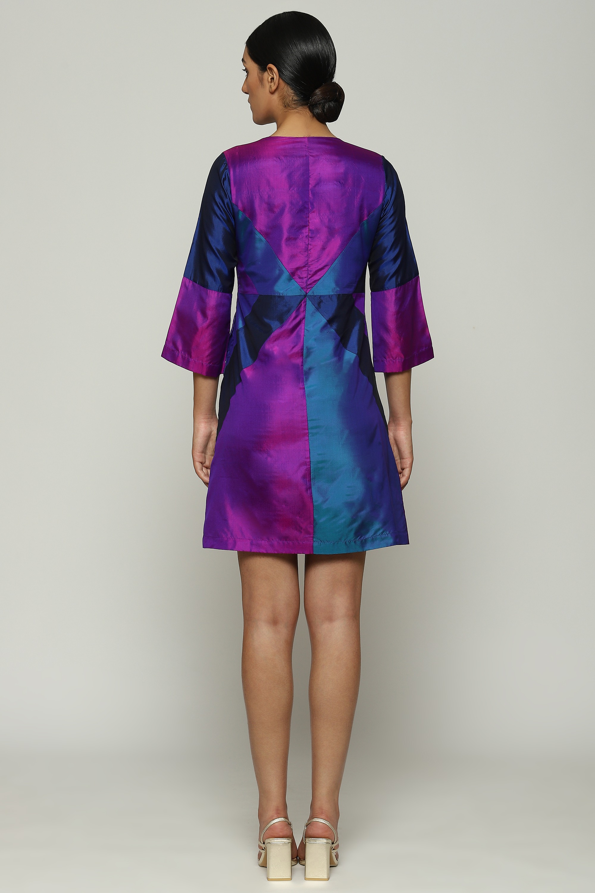 A patchwork dress in iridiscent shades of purple.