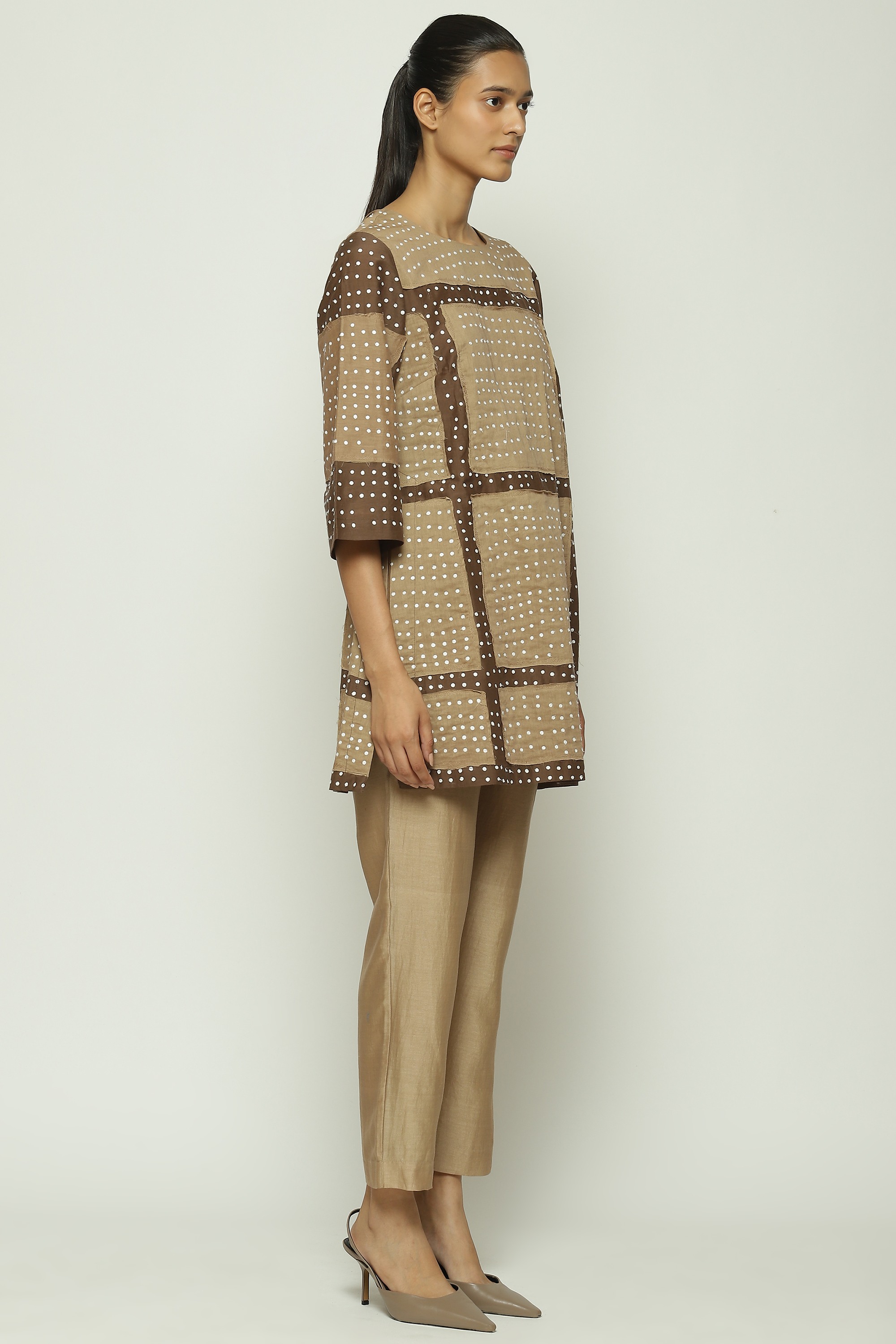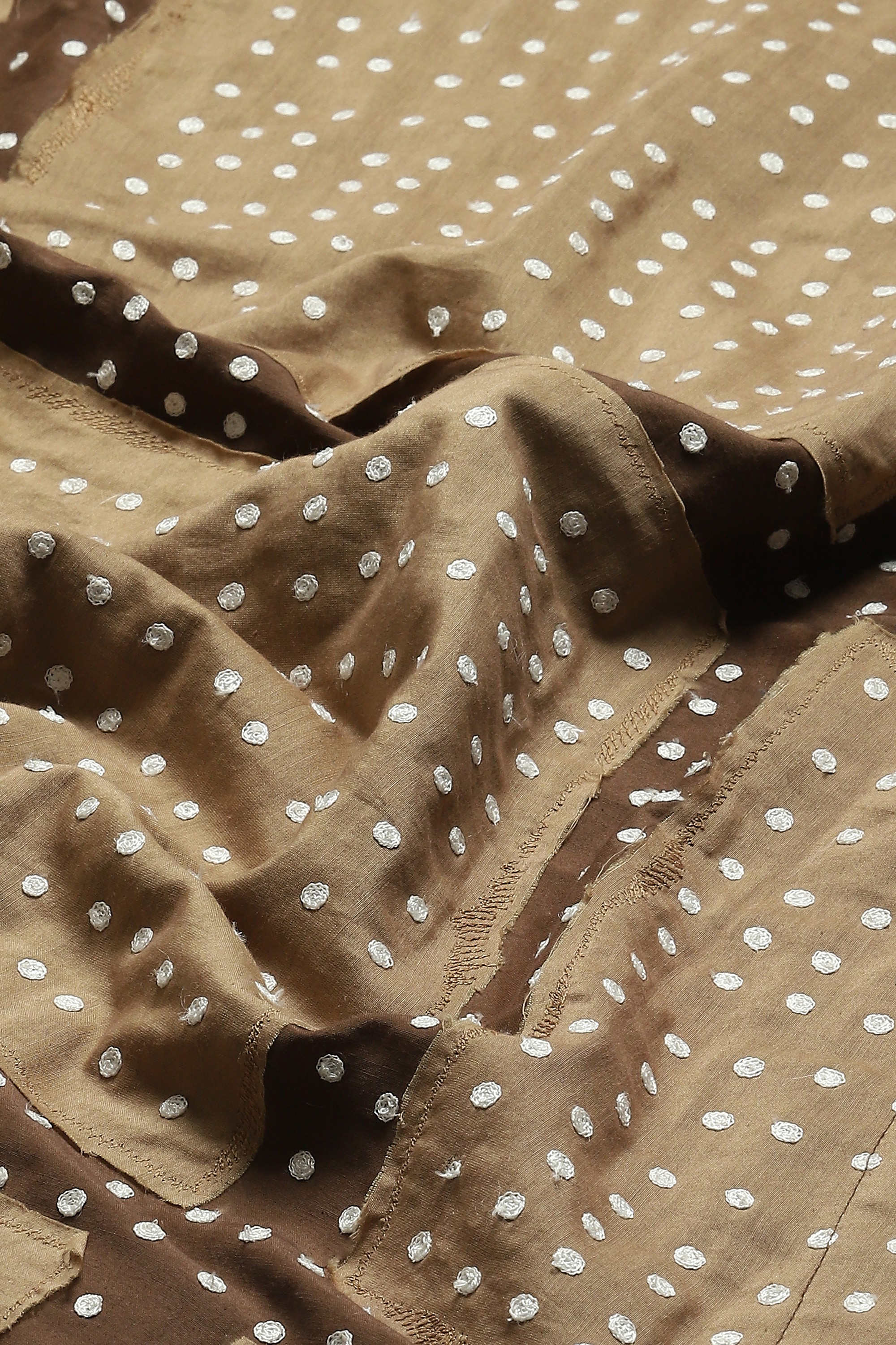 Body Language — from Abraham & Thakore — explores the building blocks of language. Crafted in a blend of silk and cotton, this creation is appliqued with patches of fabric and crewel embroidered with silk yarn.