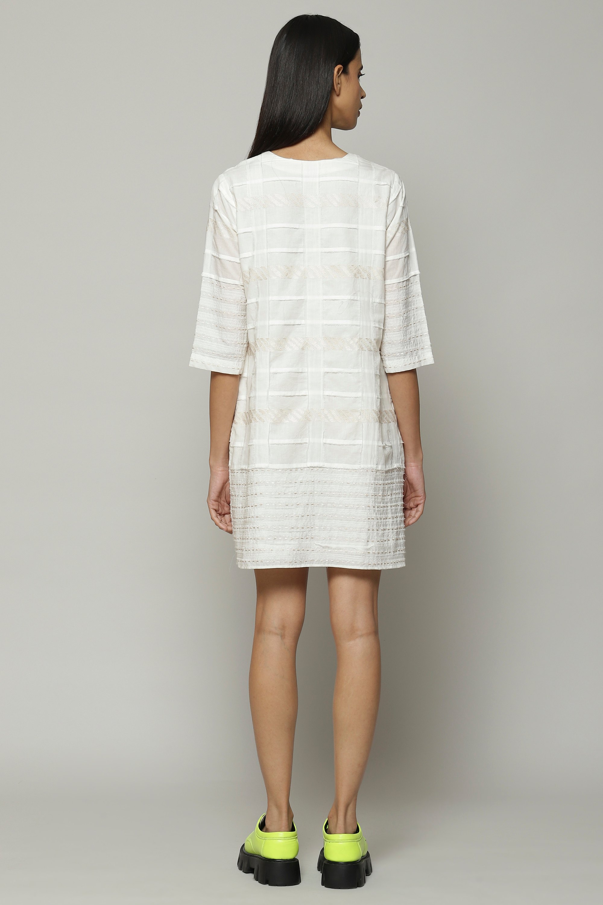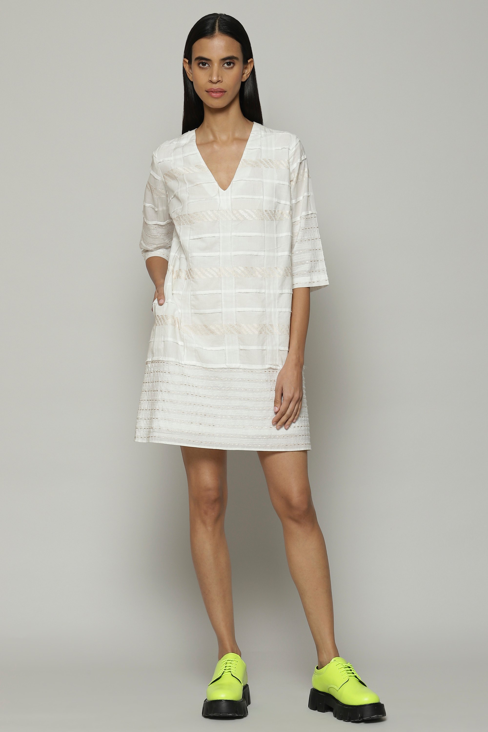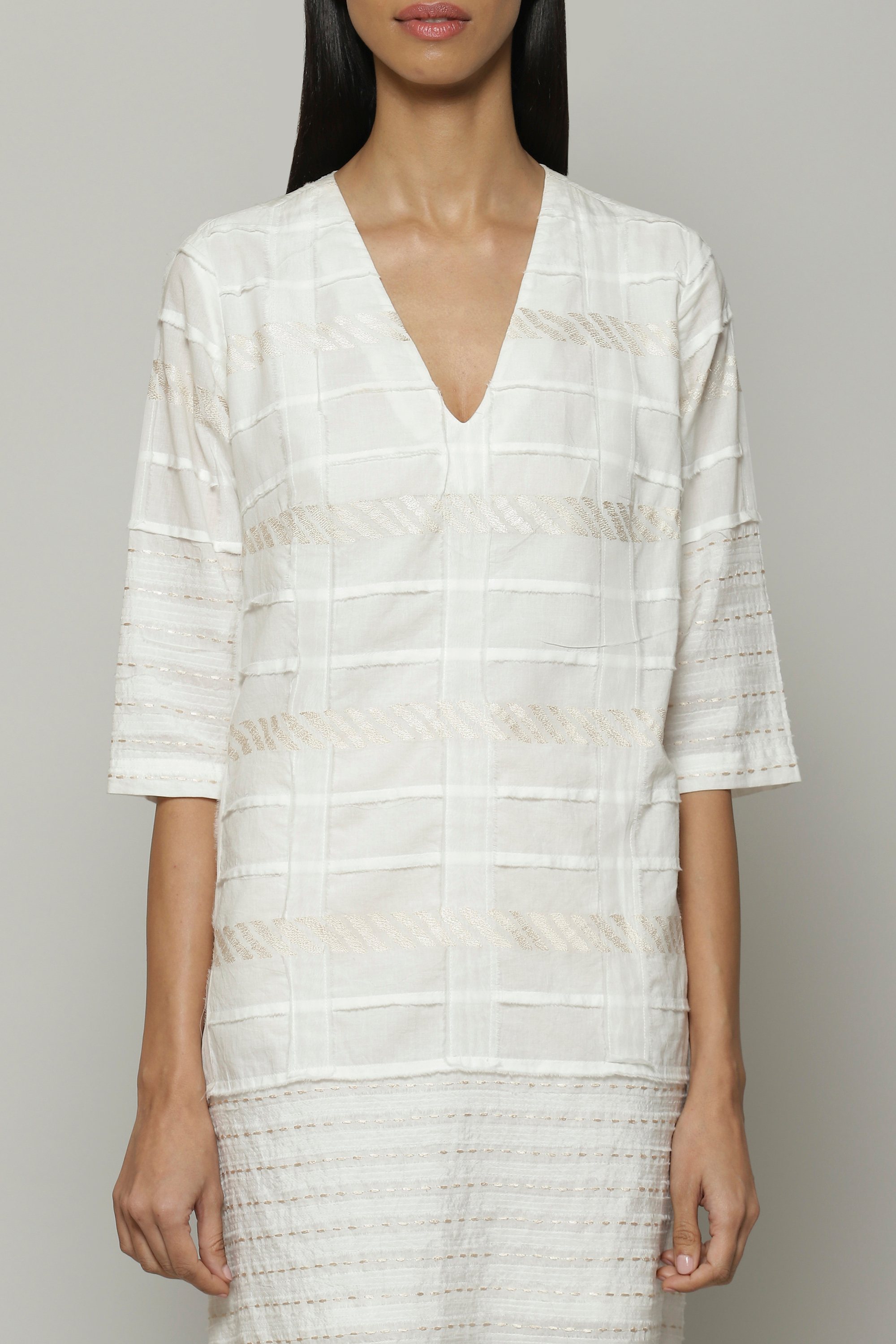 An ivory top that has been created by patching together separate widths of fabric. This piece is crafted from lightweight cotton that keeps you comfortable through the day. Ideal for long walks by the sea.