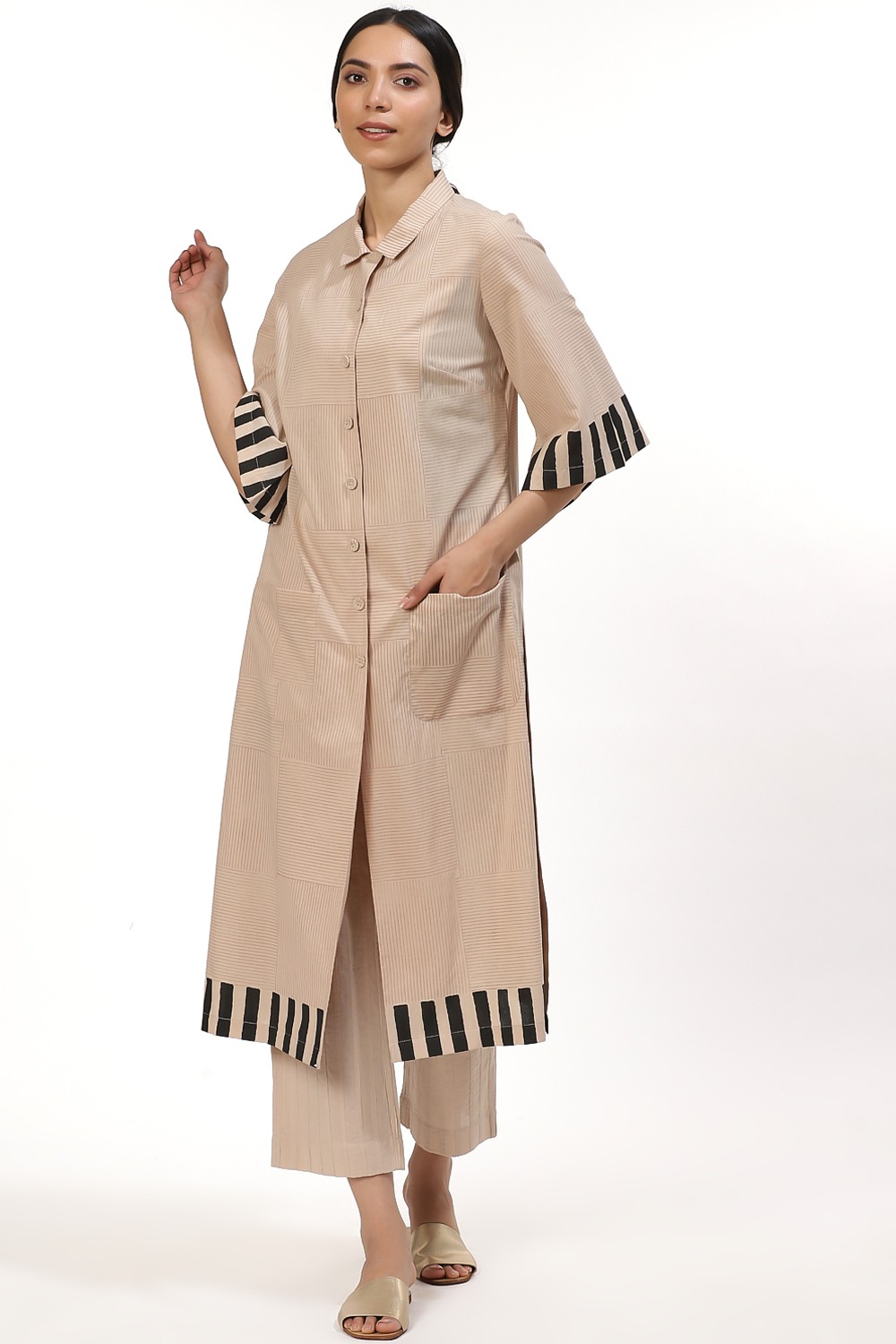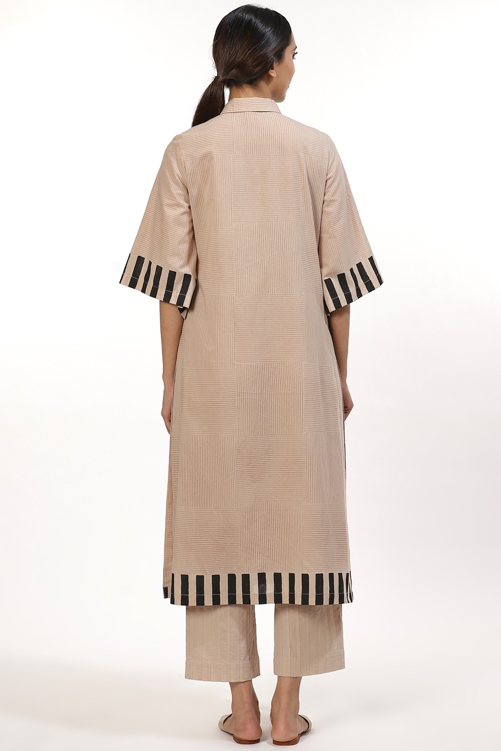 Beige And Black Patchwork Print Button Front Shirt Kurta, Crafted From Cotton Cambric, In A Flattering Slim Silhouette. Coordinate Your Style With An Allover Pleated Stripe Wide Leg Beige Pants Cut In Cotton Voile.