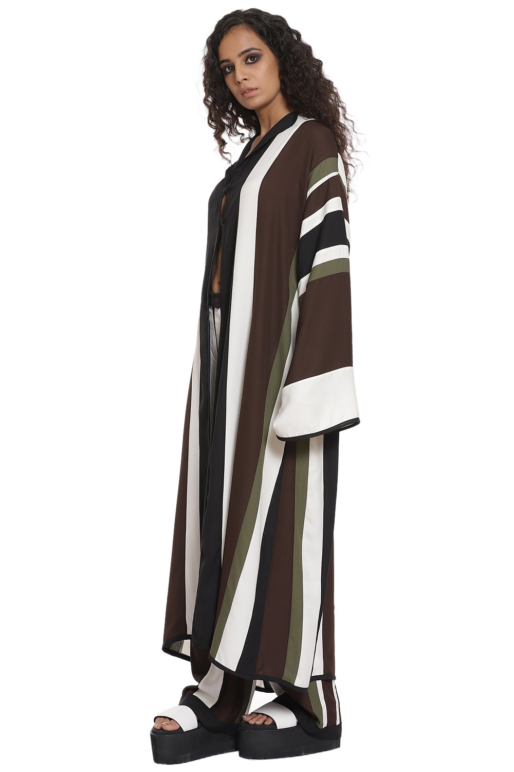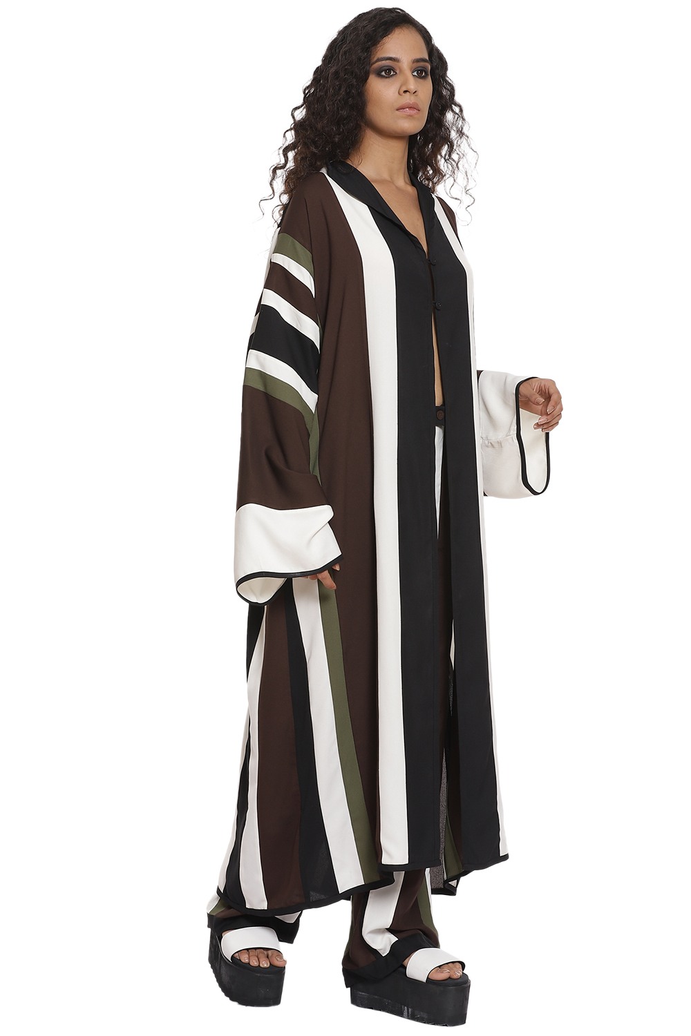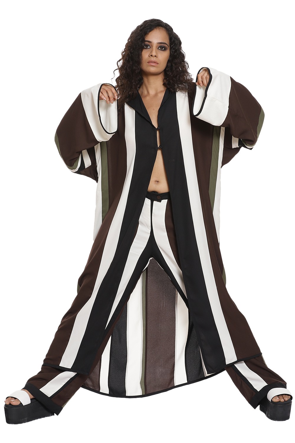Multicolour patchwork stripe kimono jacket with exaggerated sleeves in coffee, black, seagrass and ivory. Detailed with lapels and button closures. Teamed with patchwork stripe wide leg pants. Crafted from R-ELAN green gold fabric in a crepe structure.