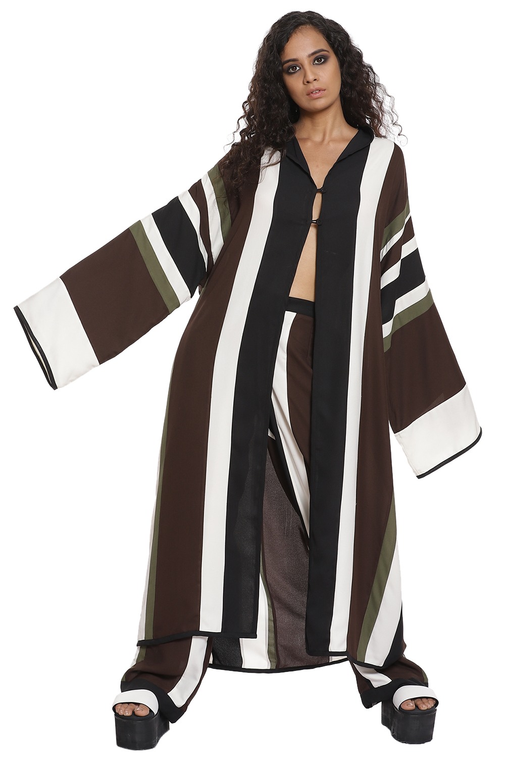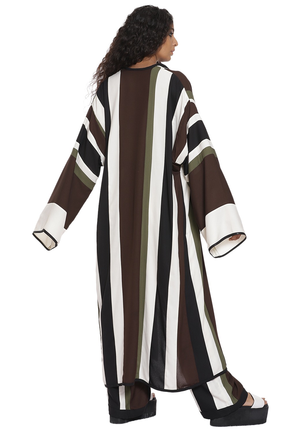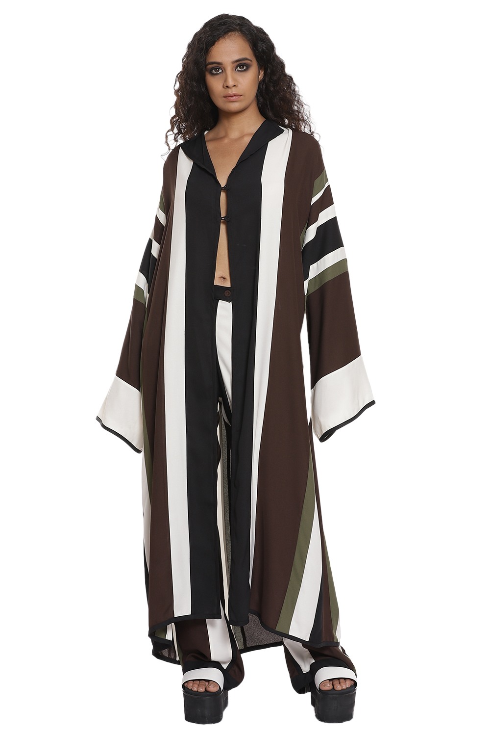 Multicolour patchwork stripe kimono jacket with exaggerated sleeves in coffee, black, seagrass and ivory. Detailed with lapels and button closures. Teamed with patchwork stripe wide leg pants. Crafted from R-ELAN green gold fabric in a crepe structure.