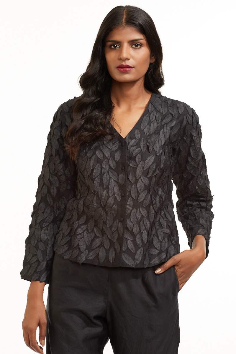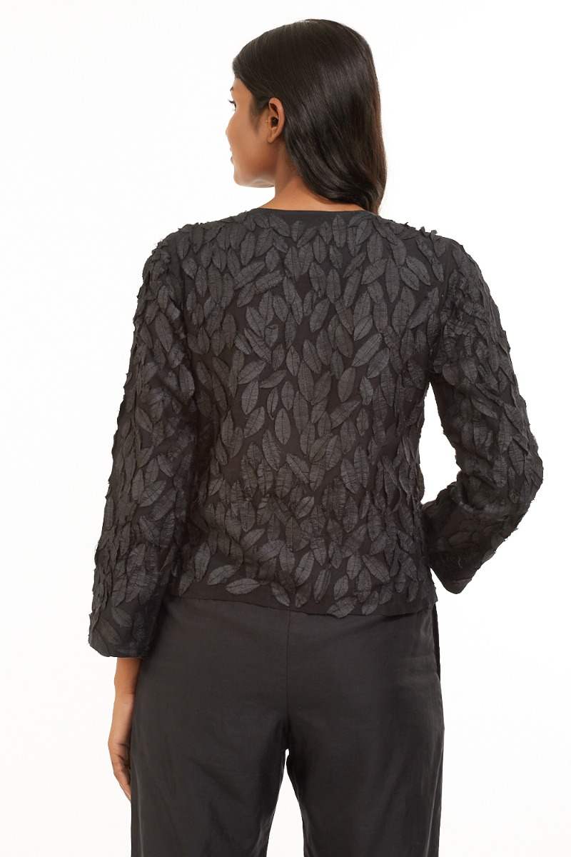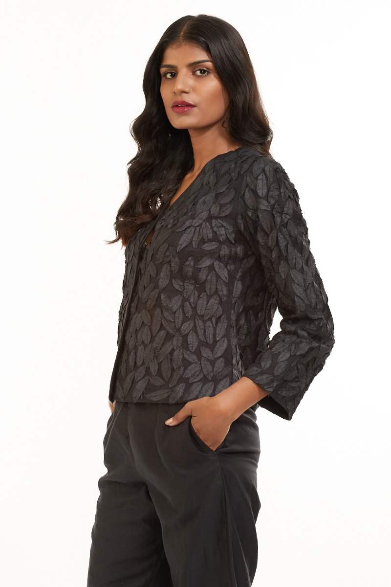 Easy Fit Crop Jacket. Embellished With Appliqued Laser-Cut Silk Leaves. Garments Are Made From Fabric That Is Washed And Pre-Shrunk To Give A Superior Hand