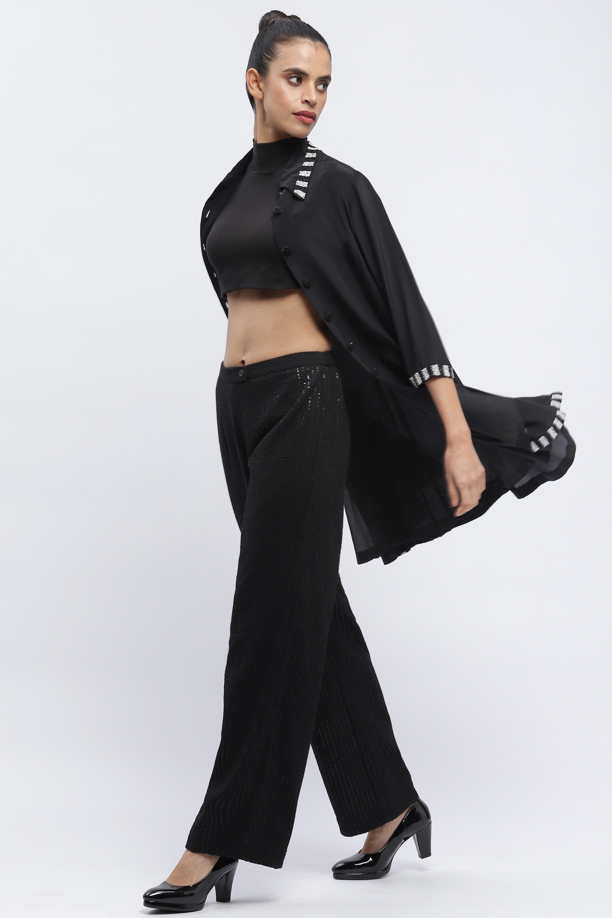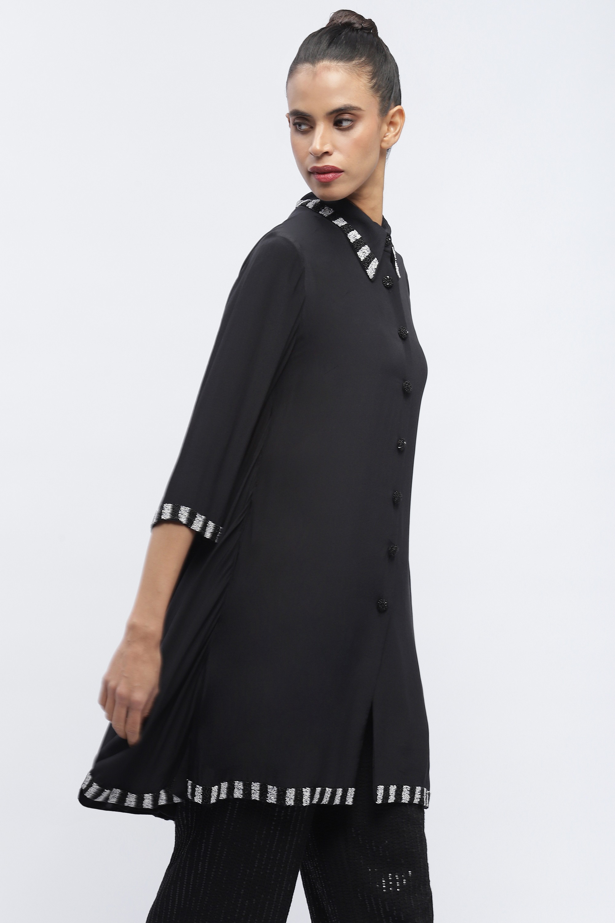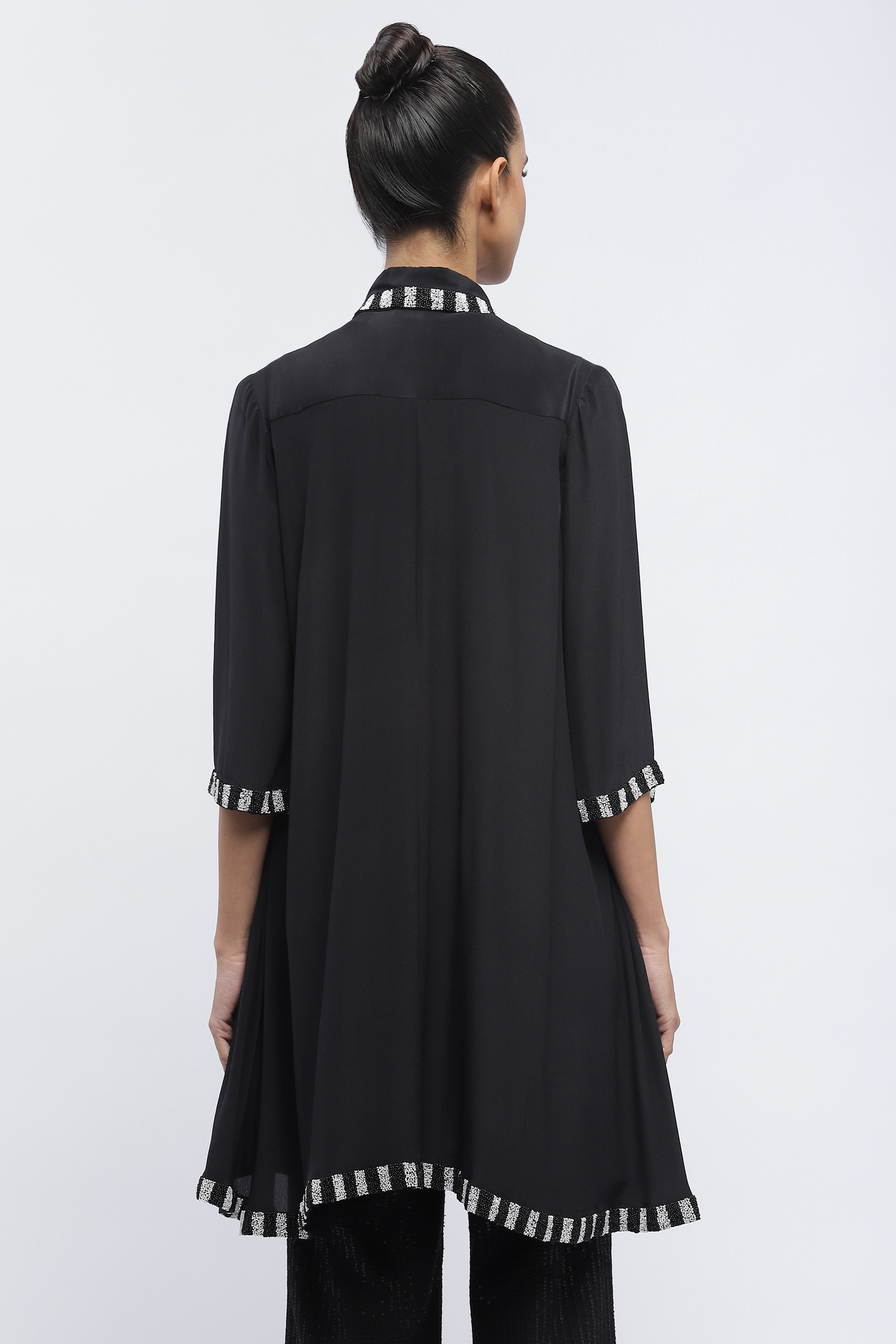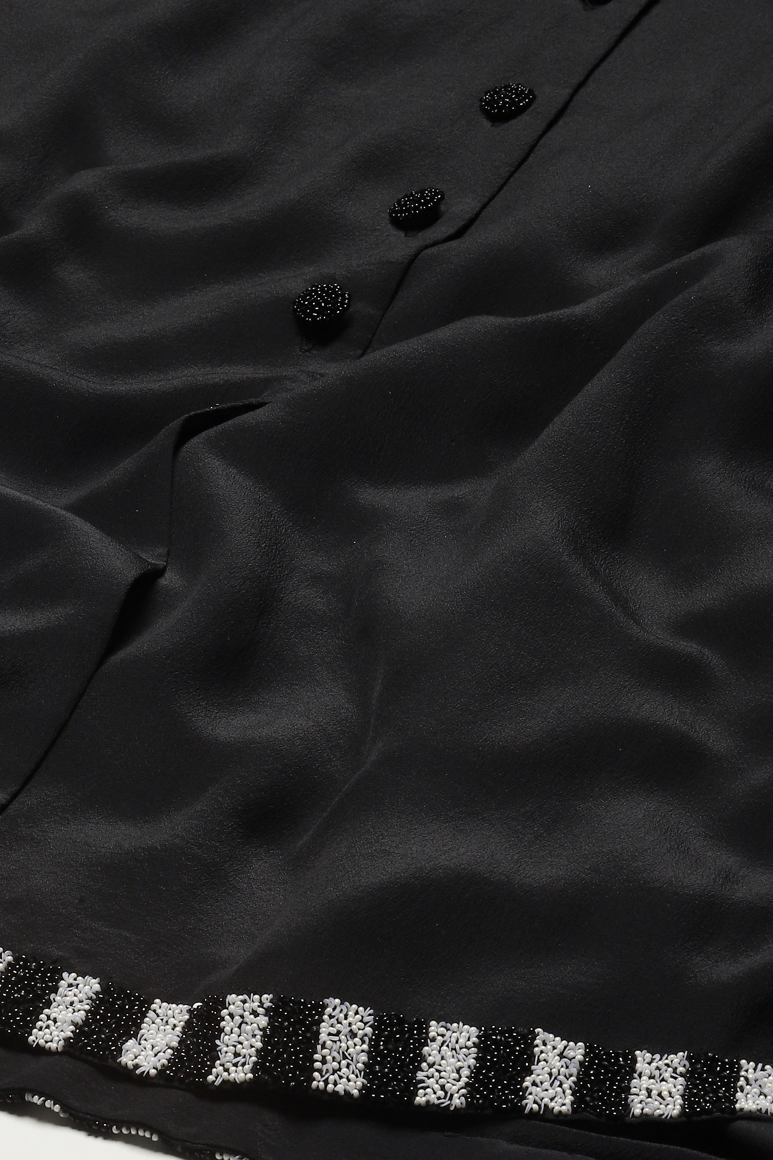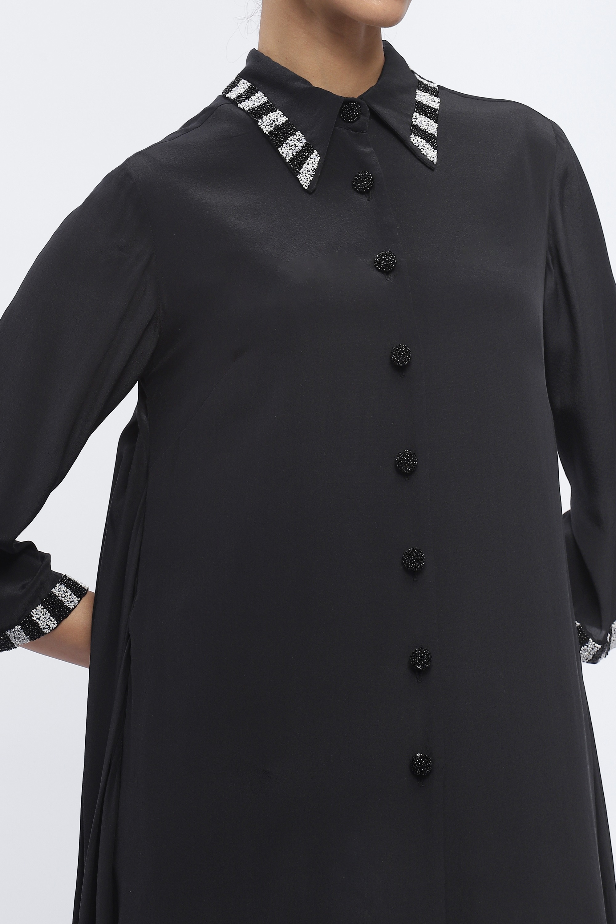 Ideal for improvisation, this black shirt dress is crafted in fluid crepe. Its digitally printed piano keys are hand adda embroidered with beads.