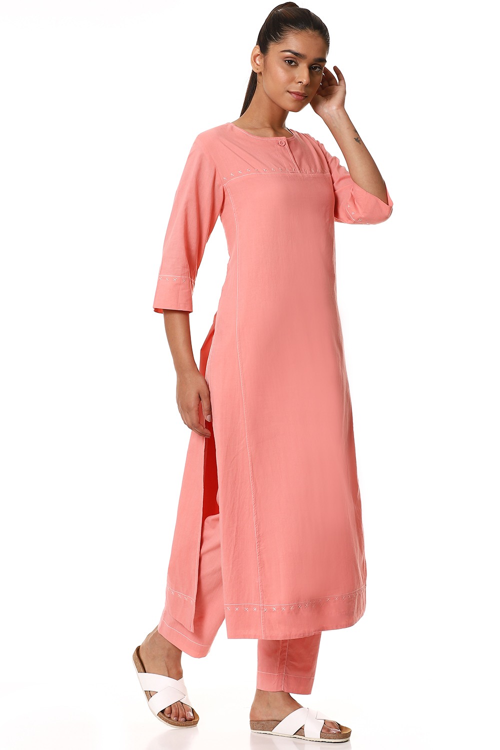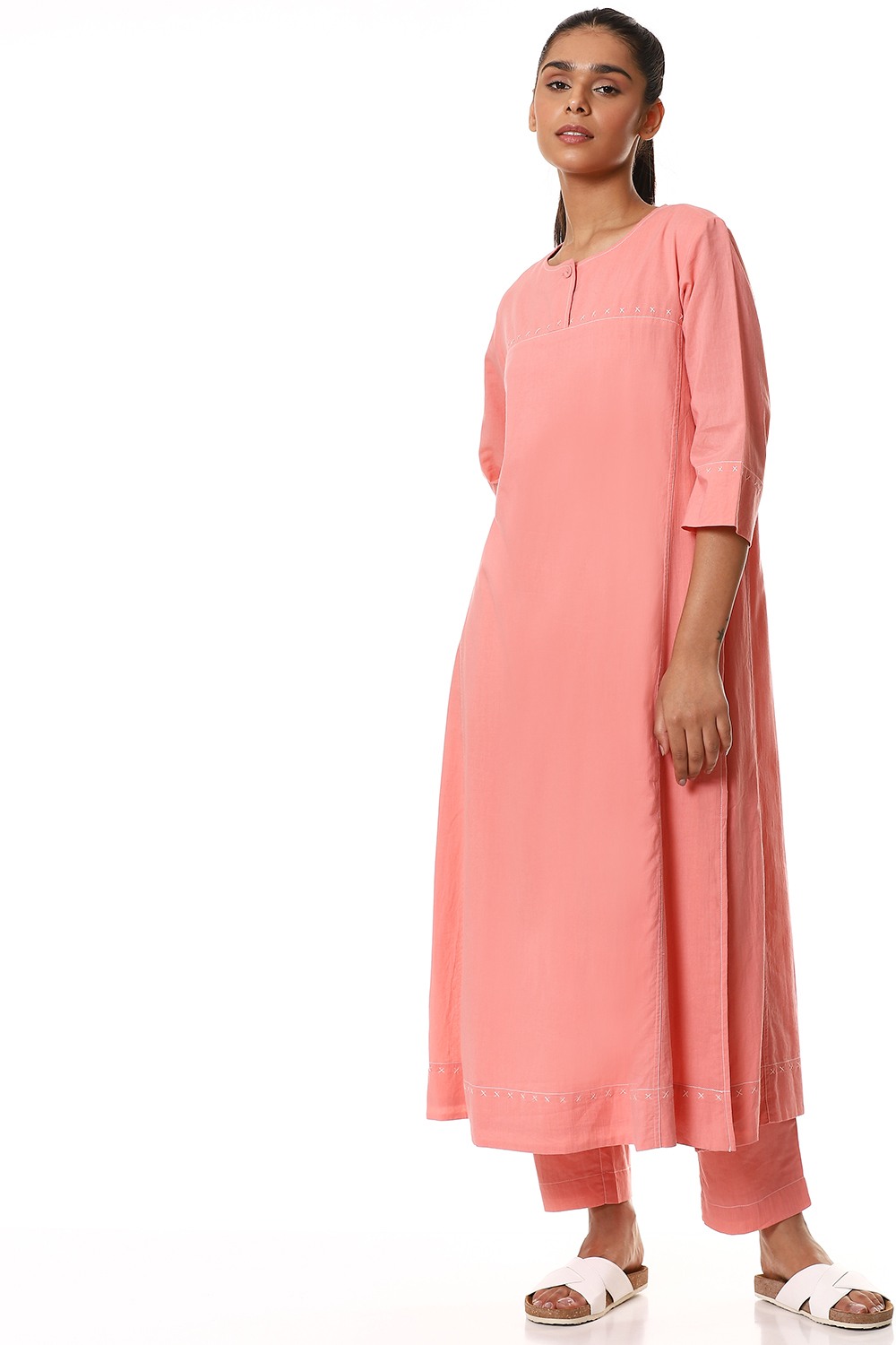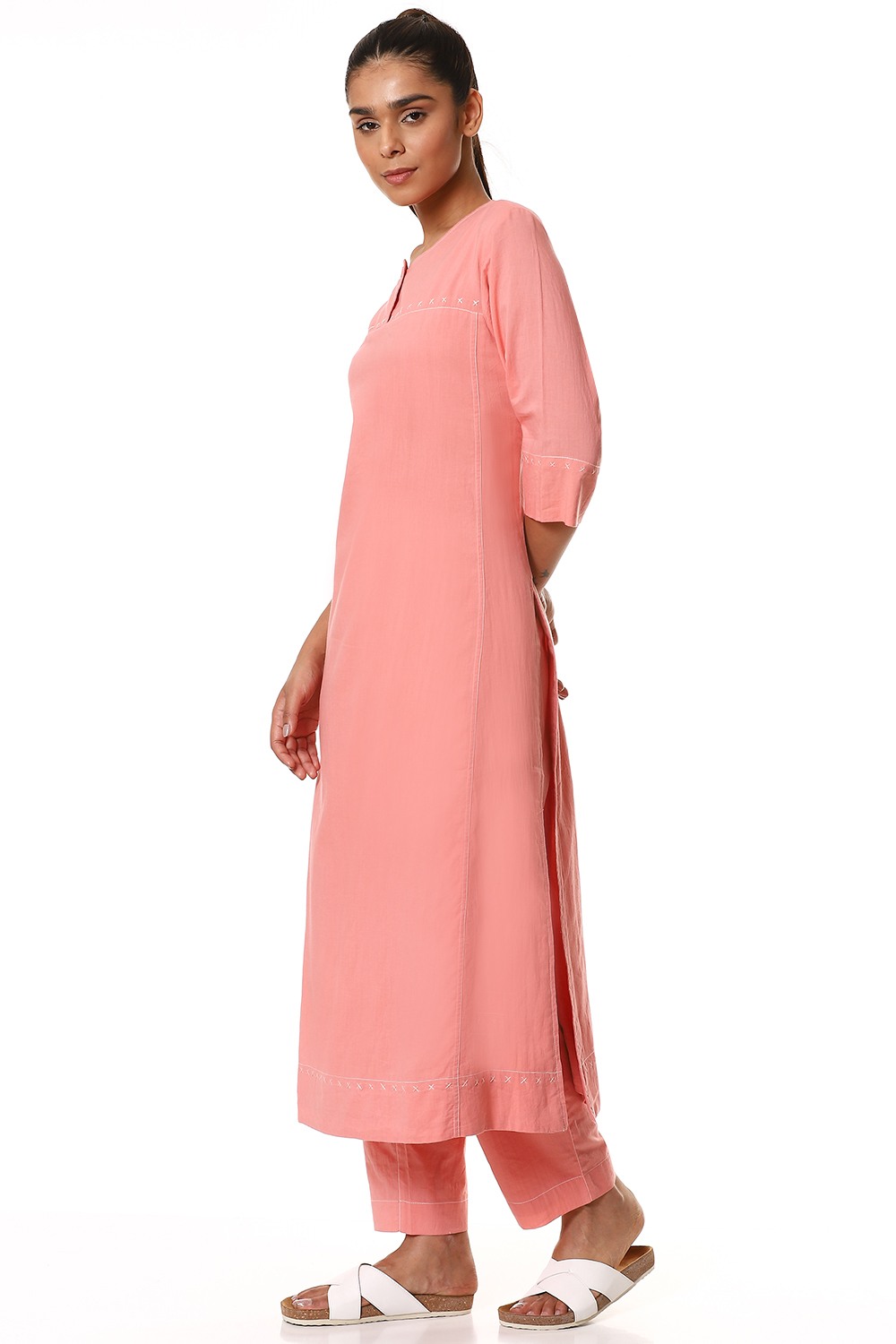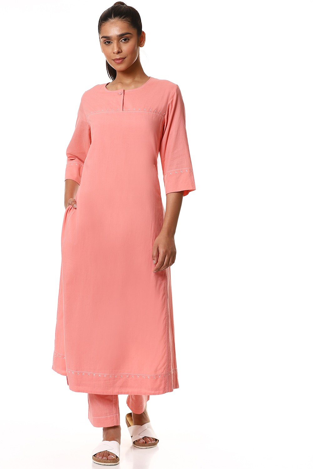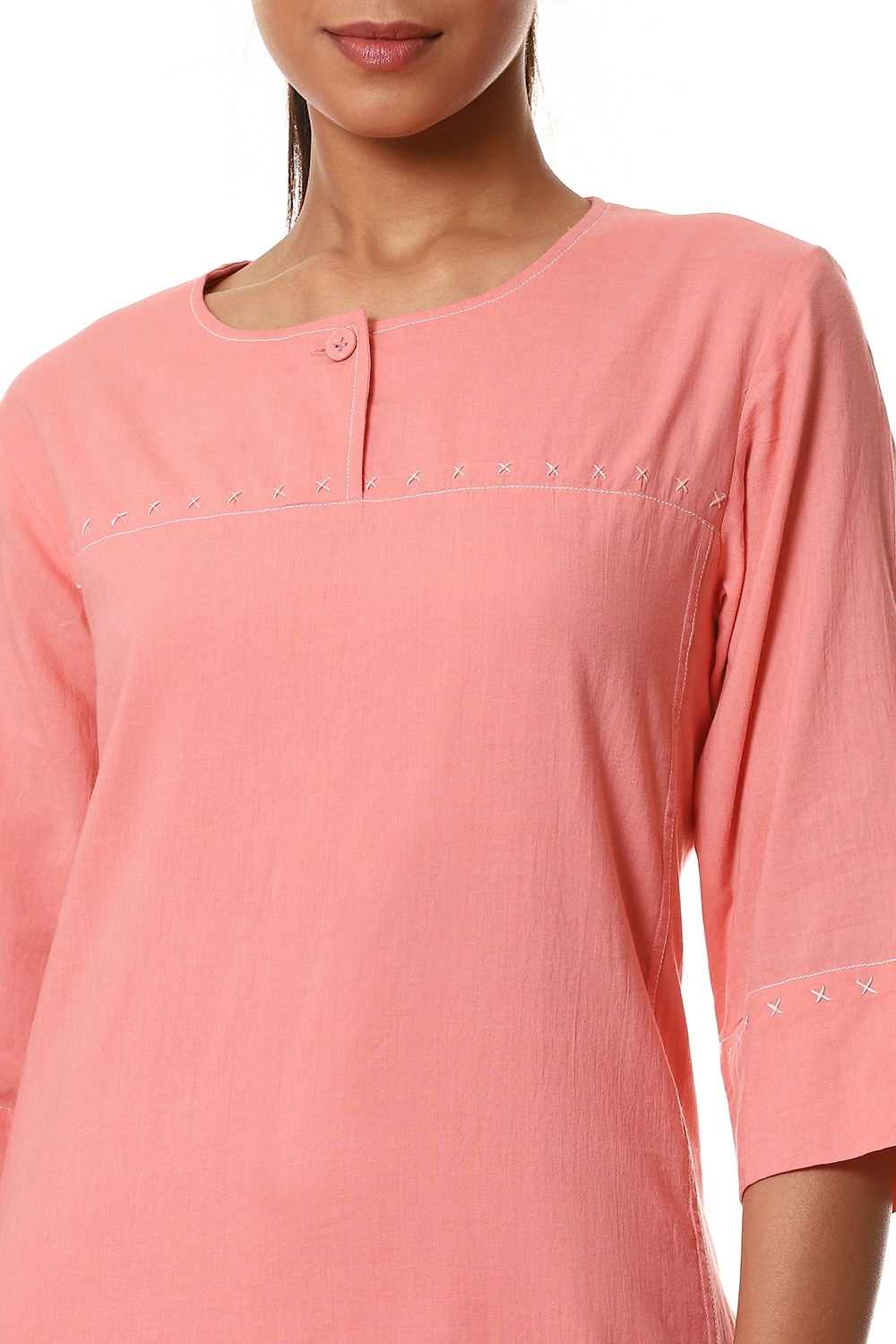 Simple and elegant kurta, cut from cotton cambric in a soft shade of pink, detailed with criss cross stitch on the yoke in ivory and a single fabric button closure. Handcrafted with love and specially created for your everyday clothing needs.