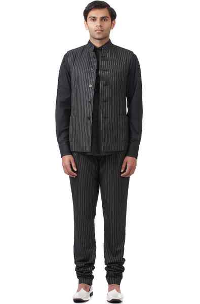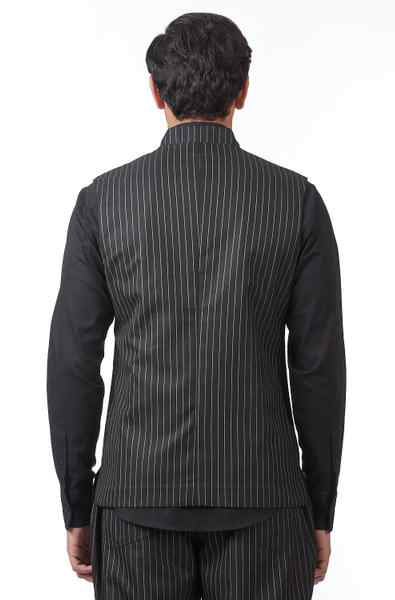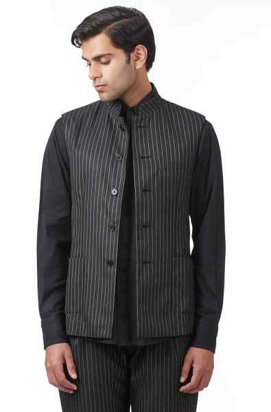 Classic Workwear Bundi. Crafted In Lightweight Cotton-Blend Fabric With All Over Pinstripe. Features Nehru Collar And Side Patch Pockets With Our Signature Regular Fit.