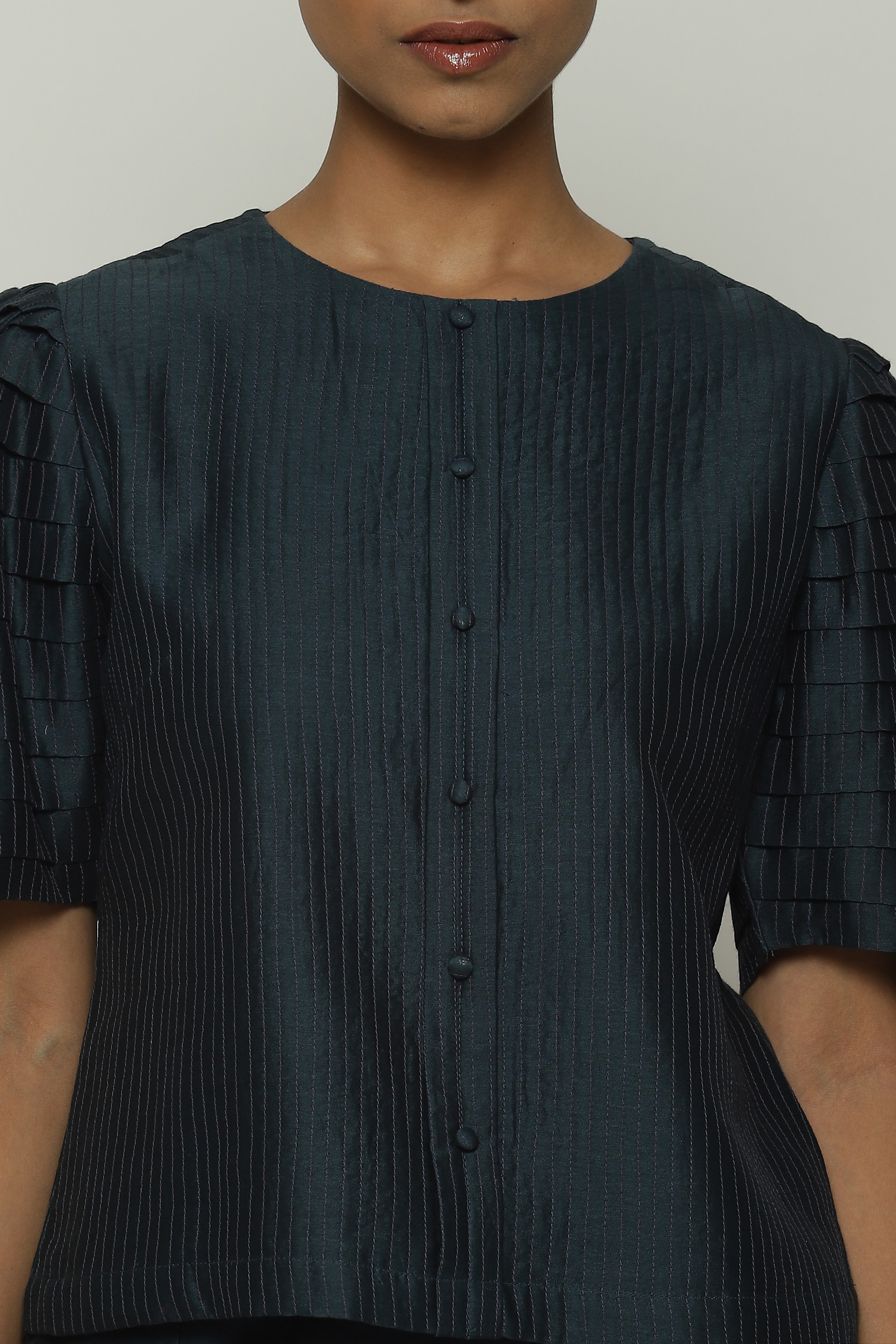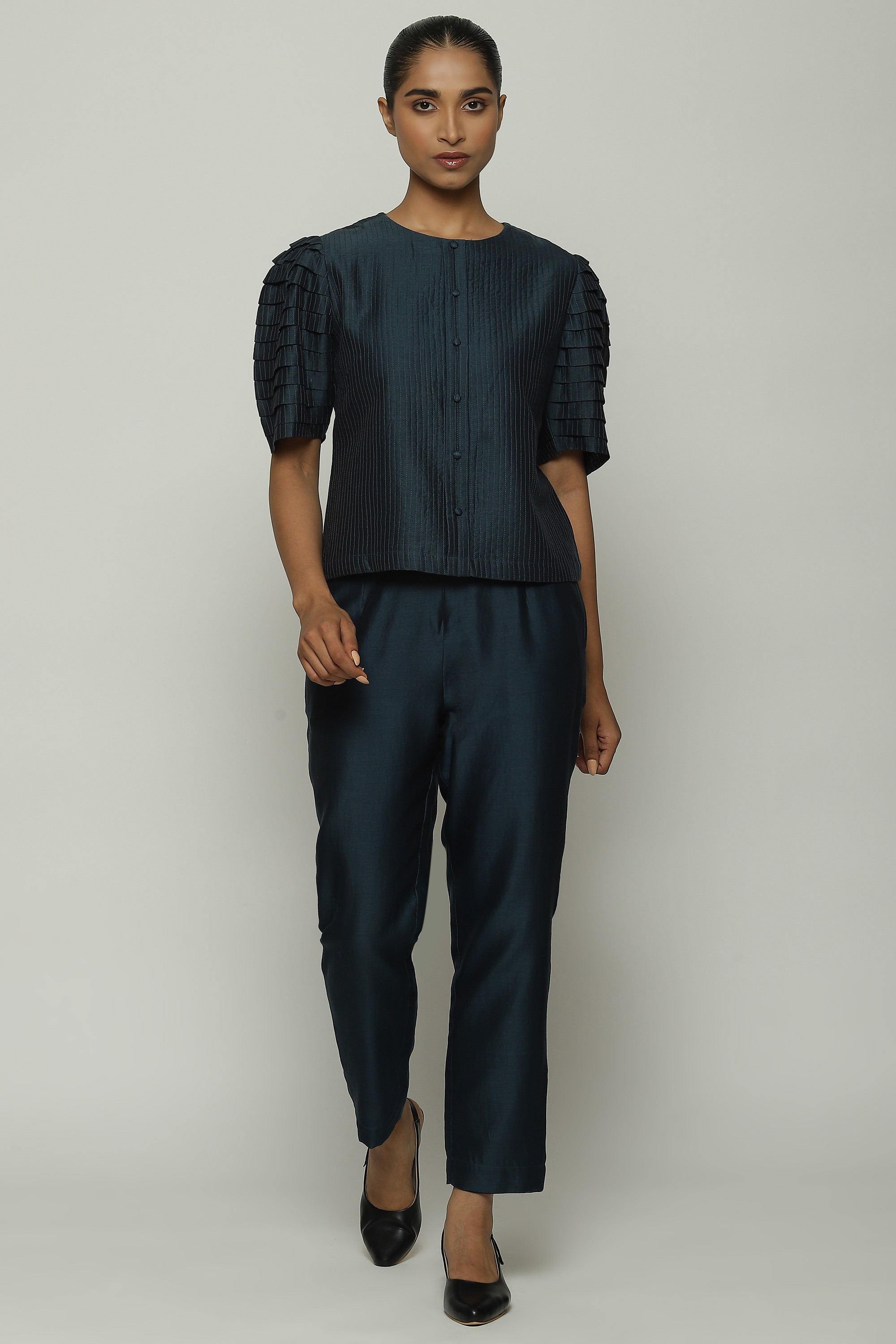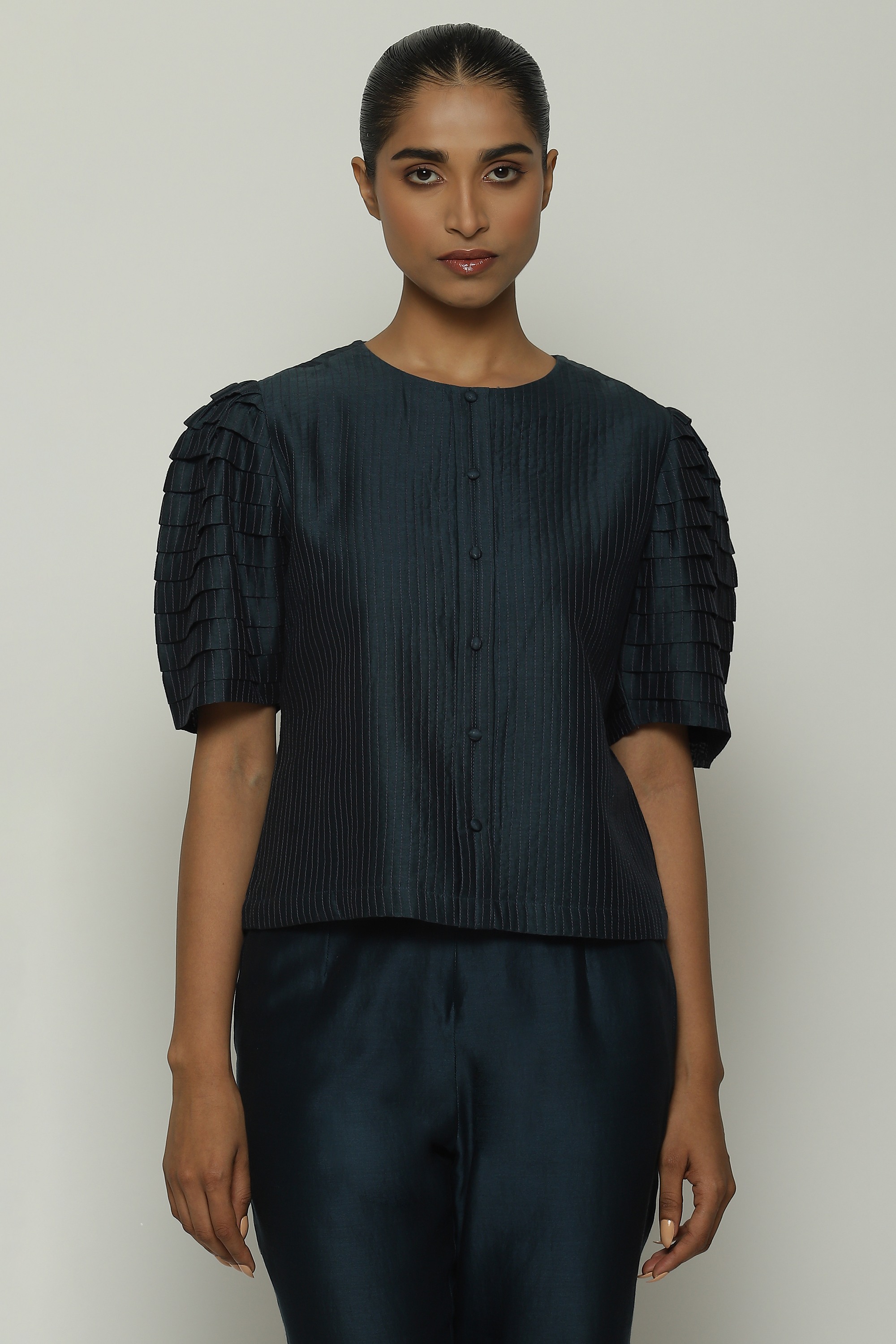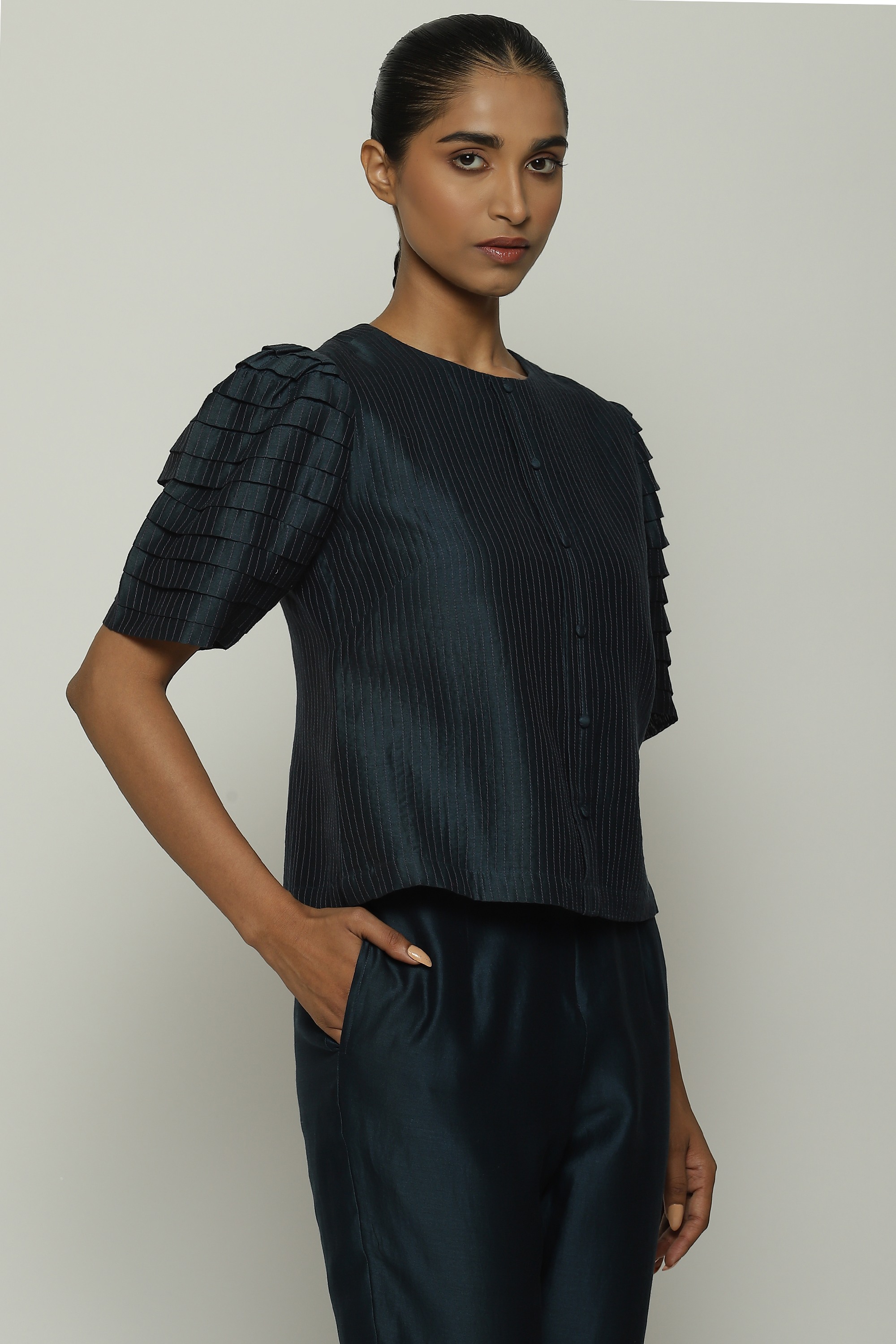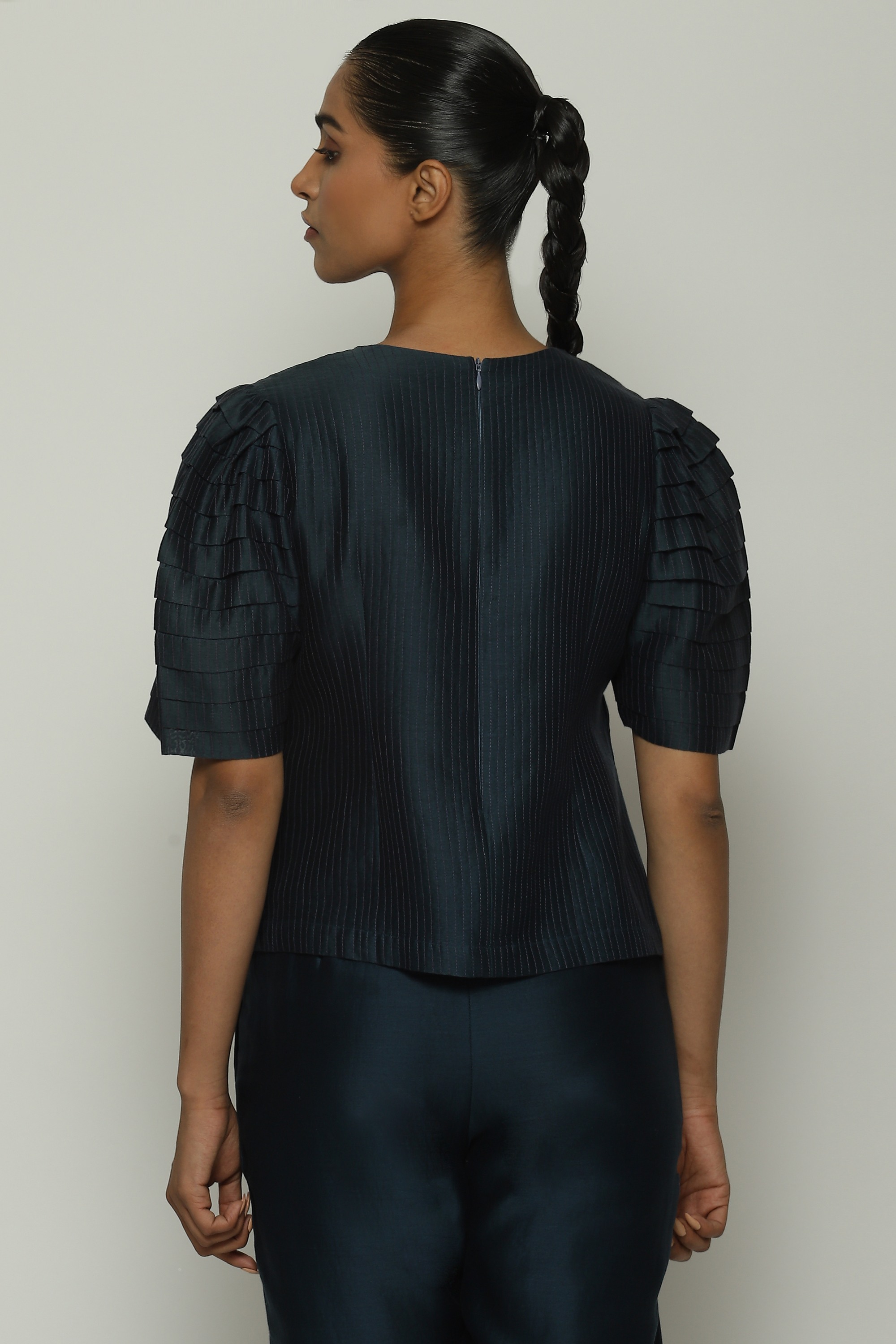 The garment contains accented areas that have been pleated by hand prior to being stitched.