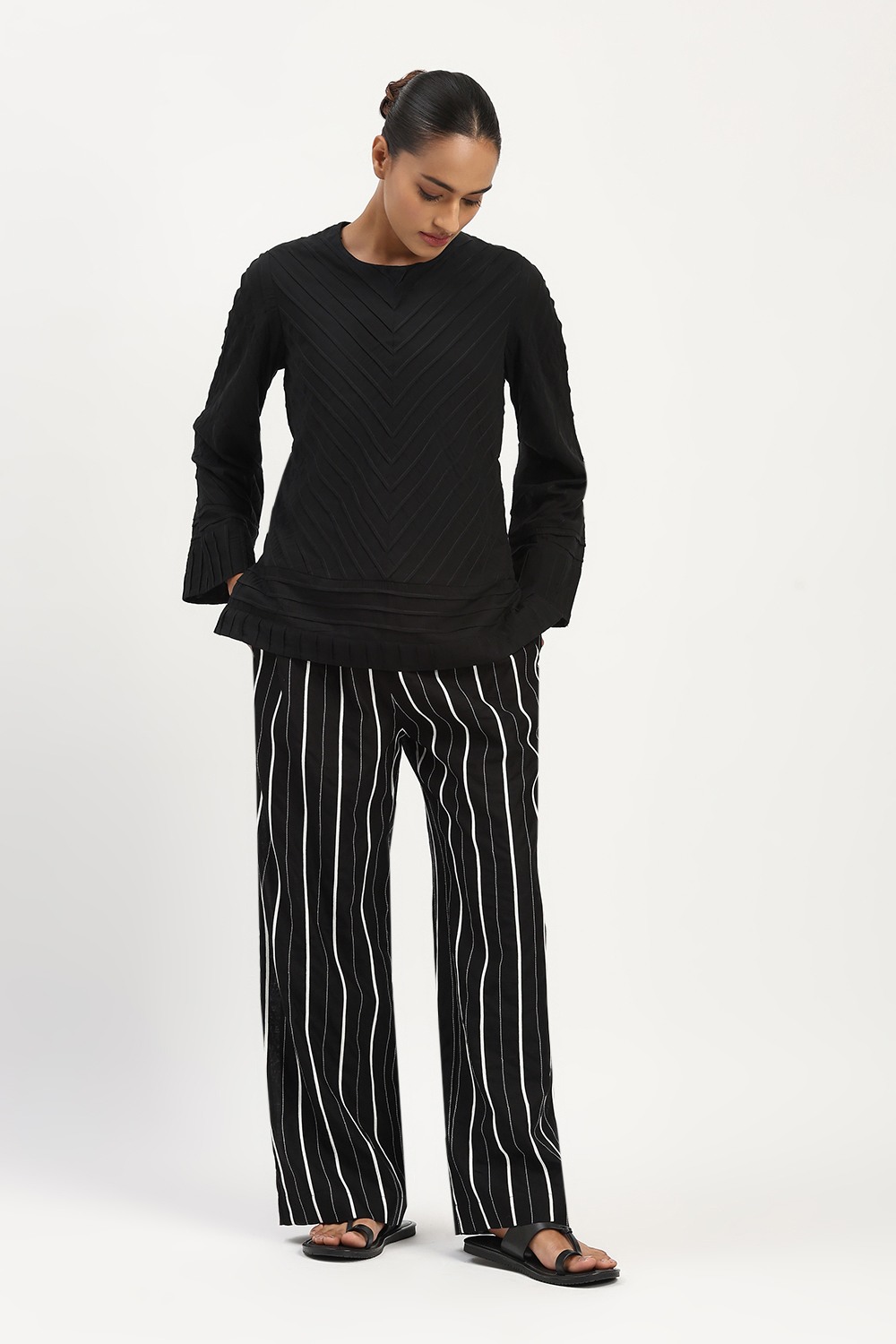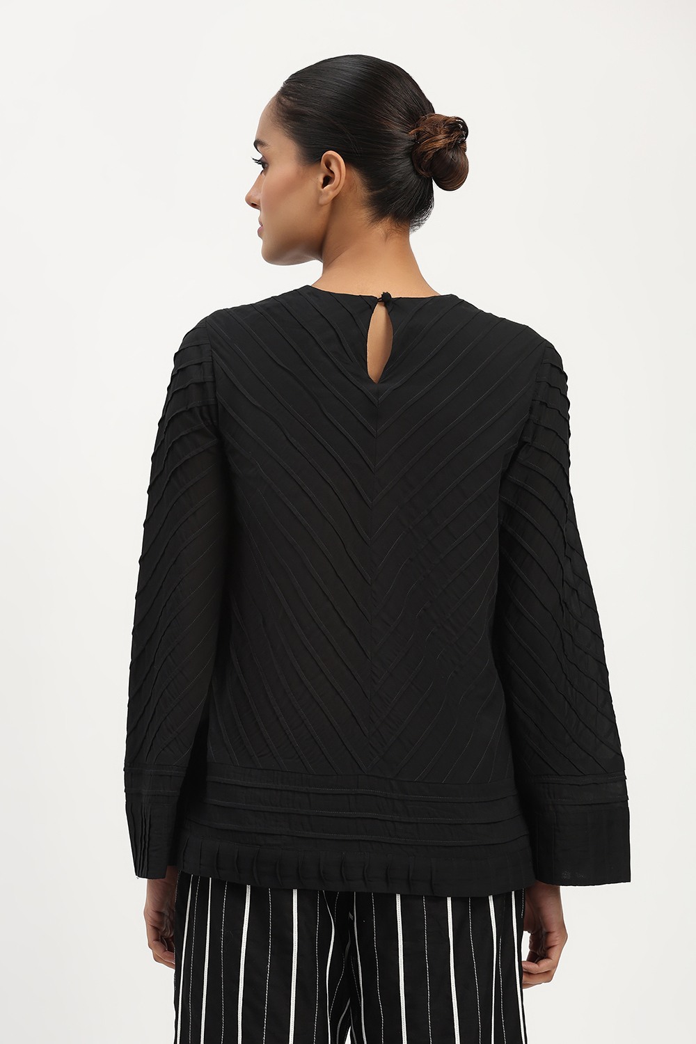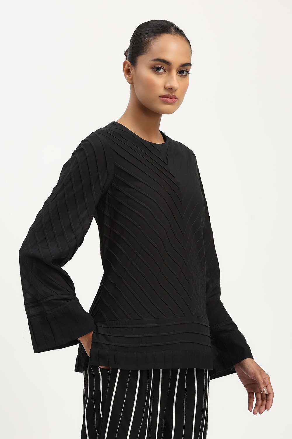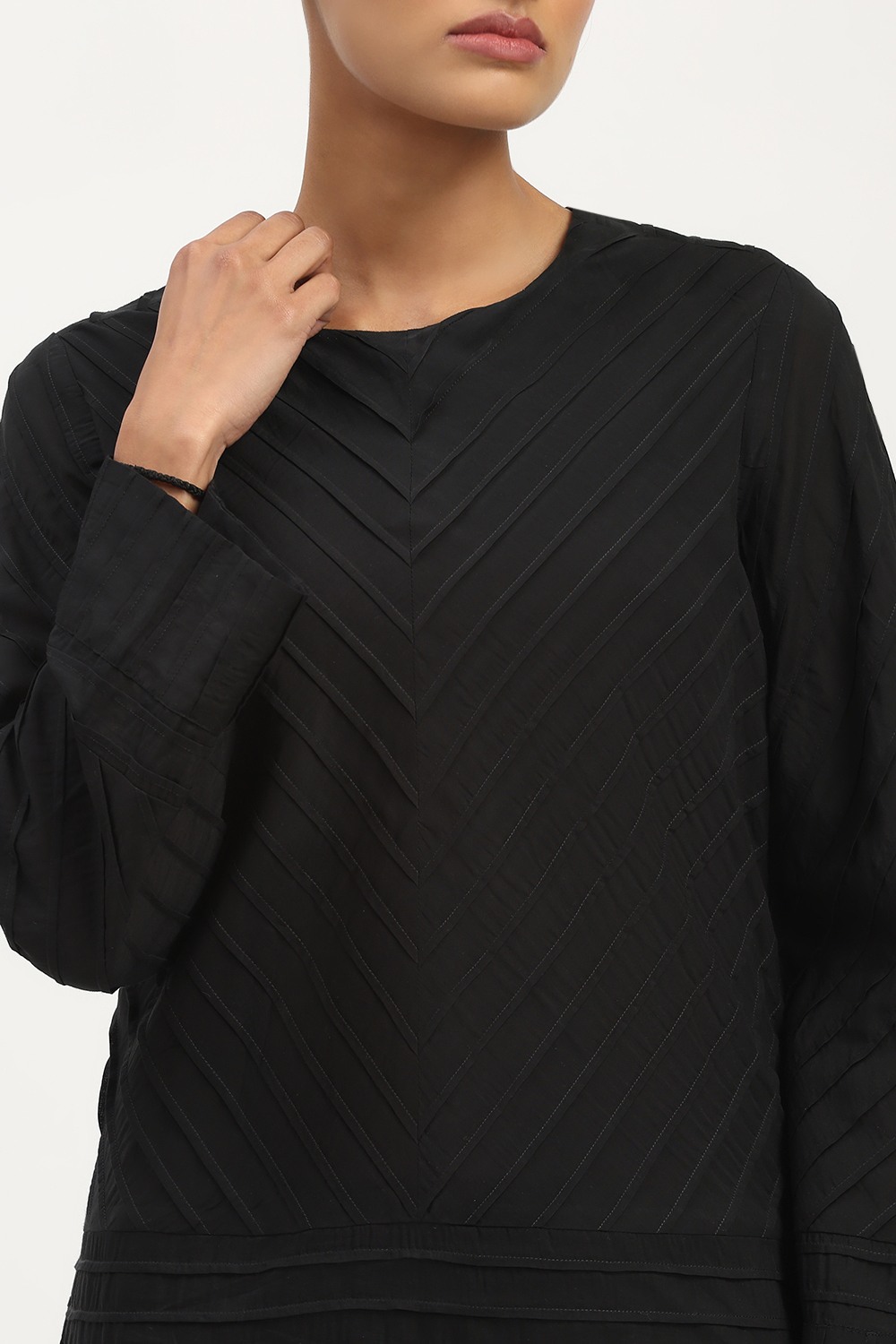 Technique Description : Pintuck is a fabric detailing technique where small, narrow folds are stitched on the fabric to create a raised line. These tucks are usually made in a row and give a textured, structured look to the fabric.