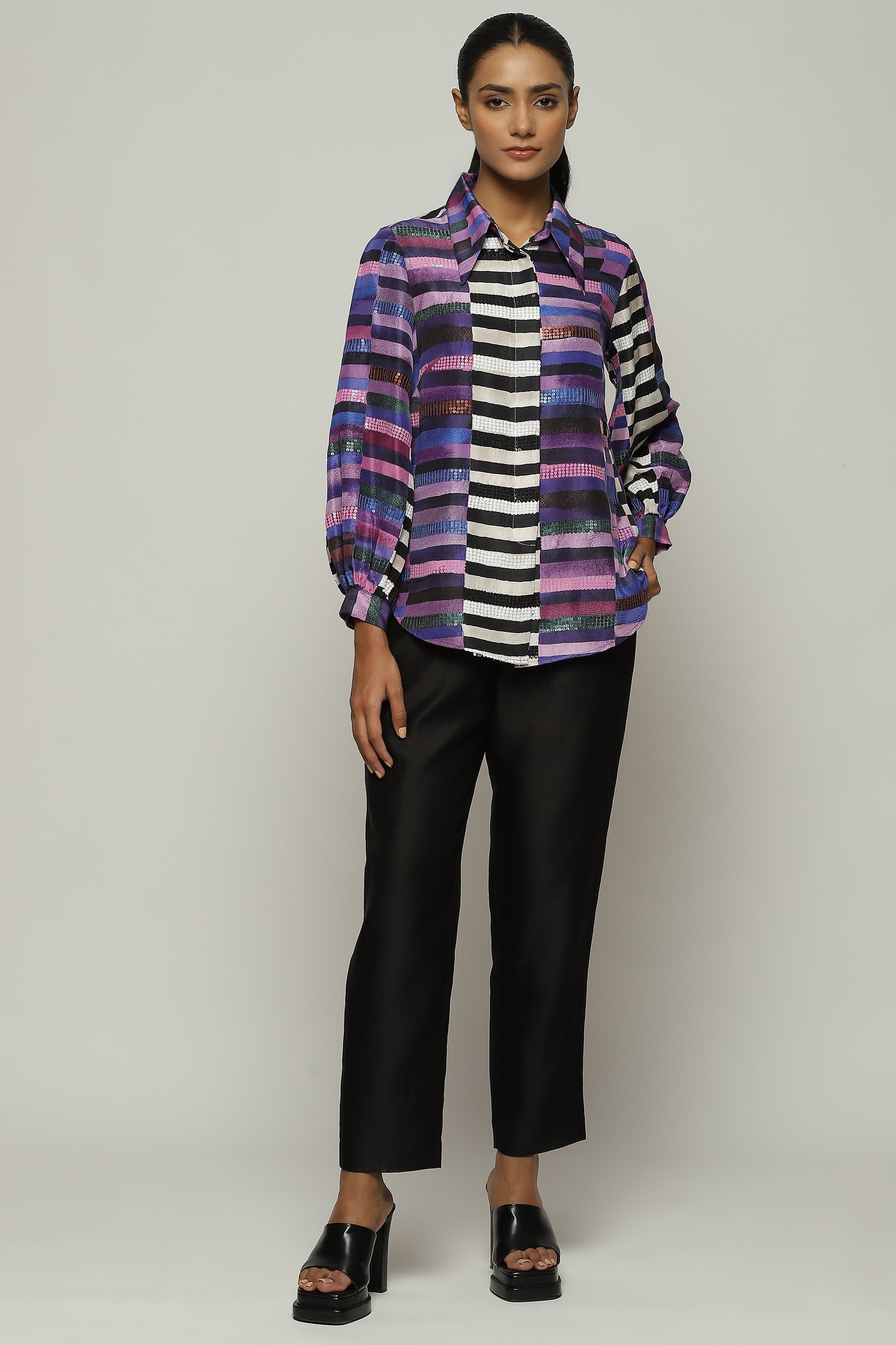 Crafted from Habutai silk, this piece is digitally printed and embellished using the ancient art of hand adda embroidery.