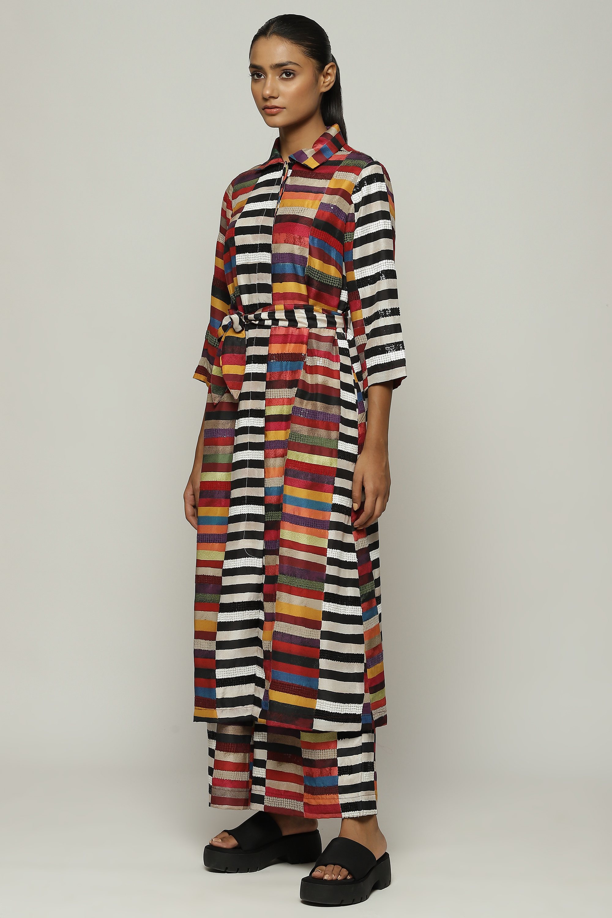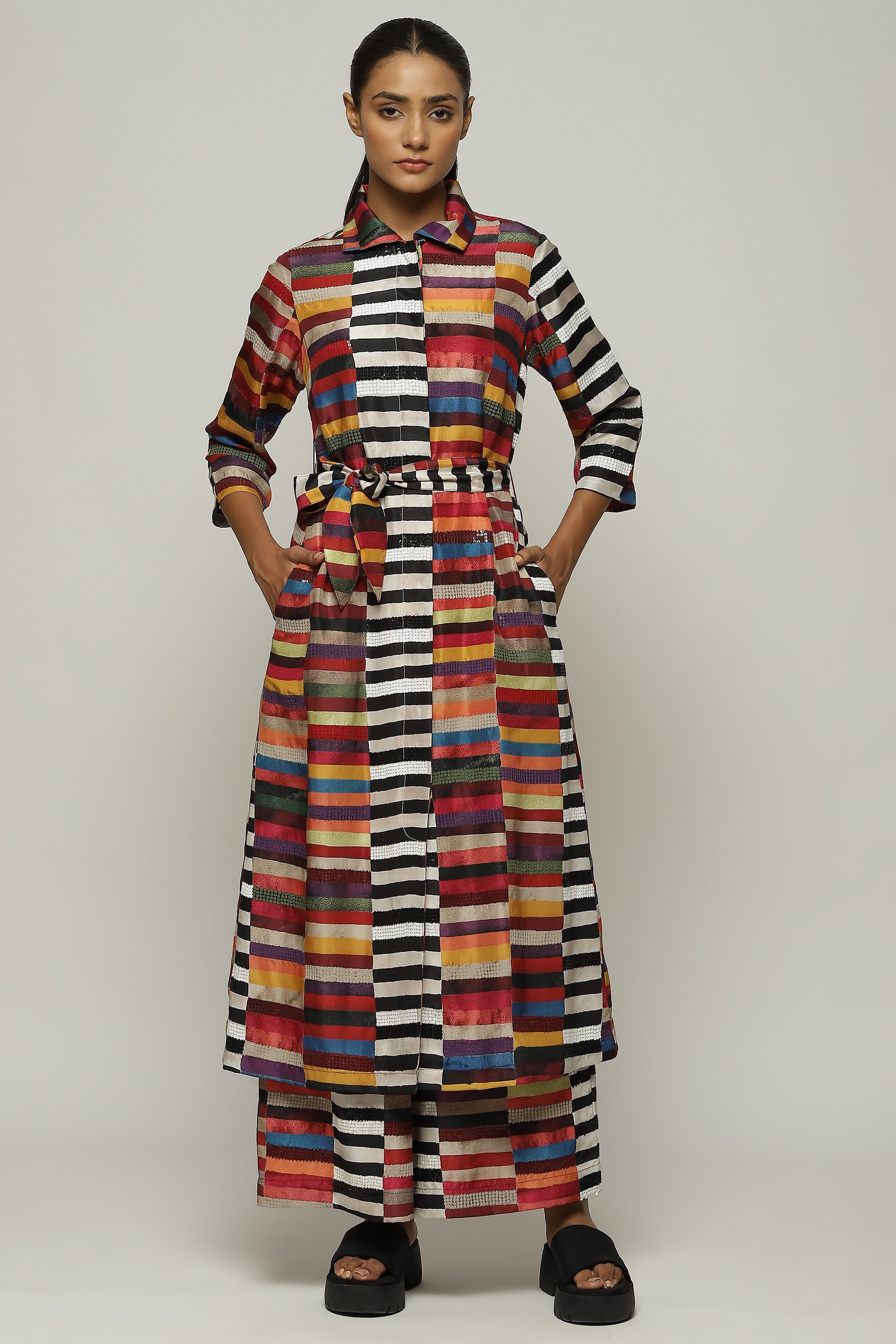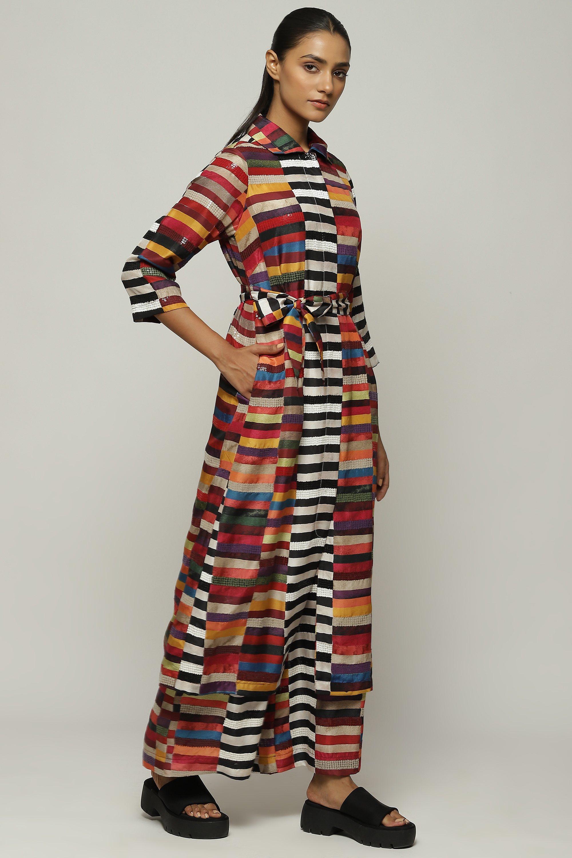Blocks of warm colors line this soft shirt dress.