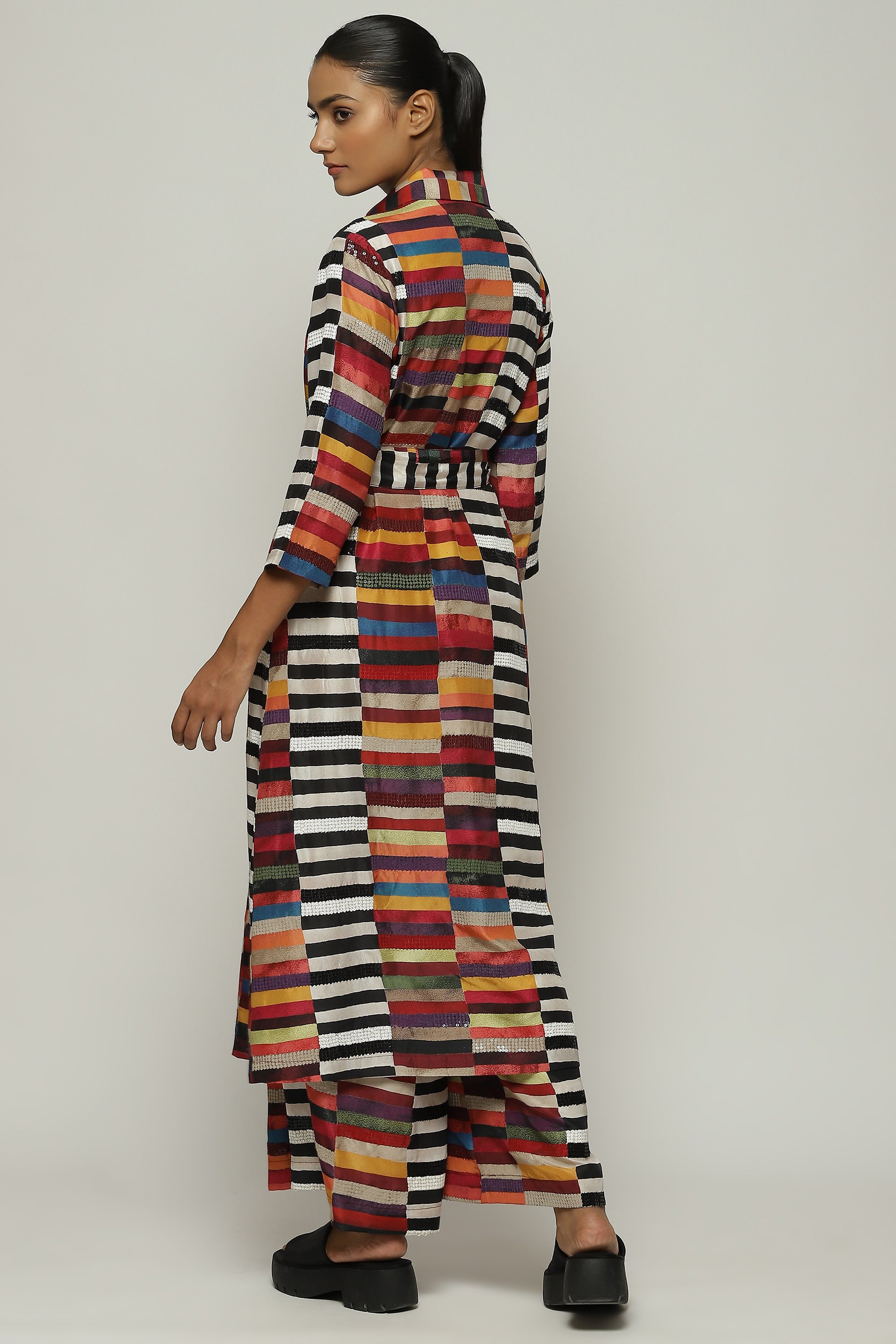 Crafted from Habutai silk, this piece has been digitally printed and embroidered using the ancient hand adda technique.