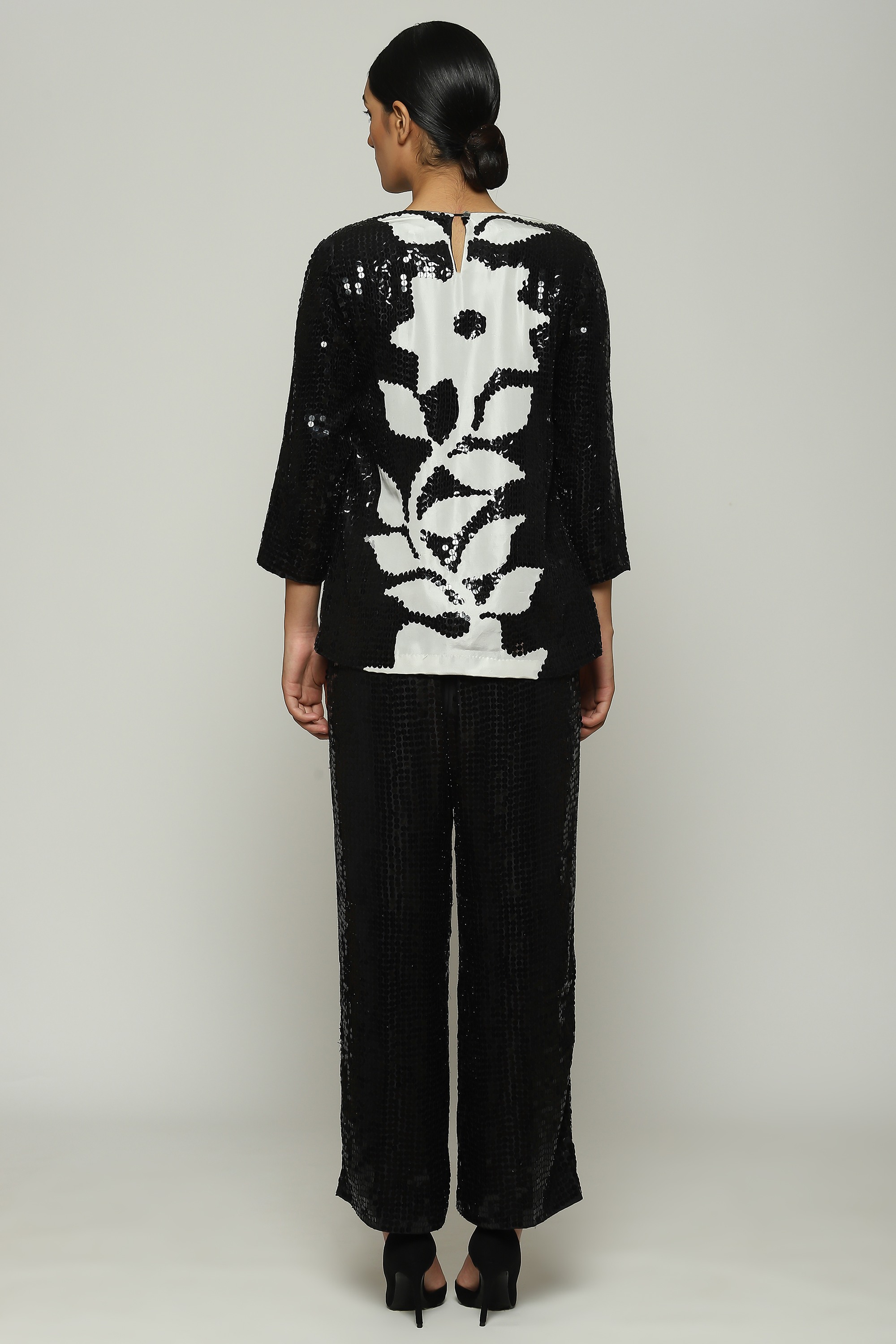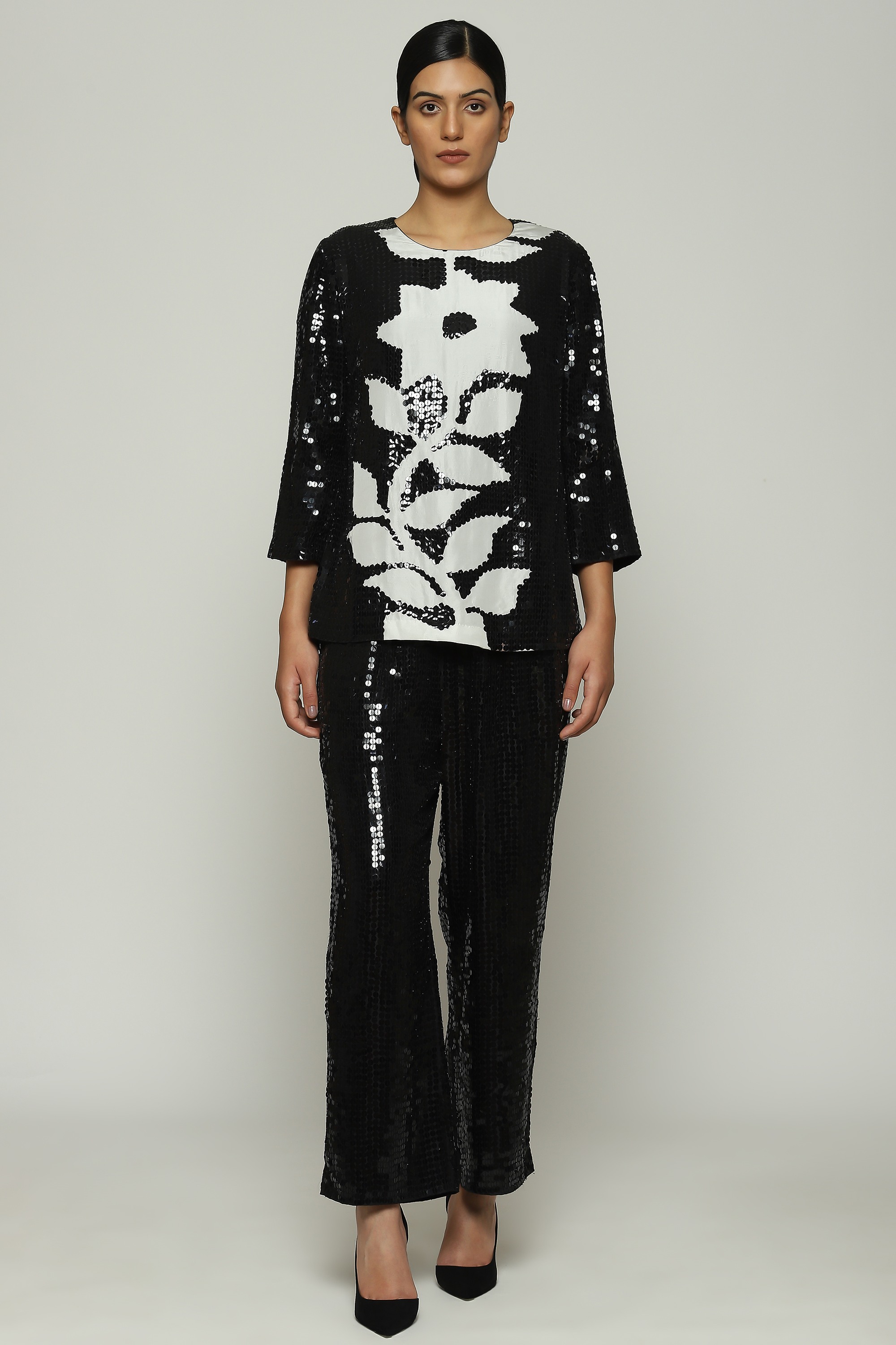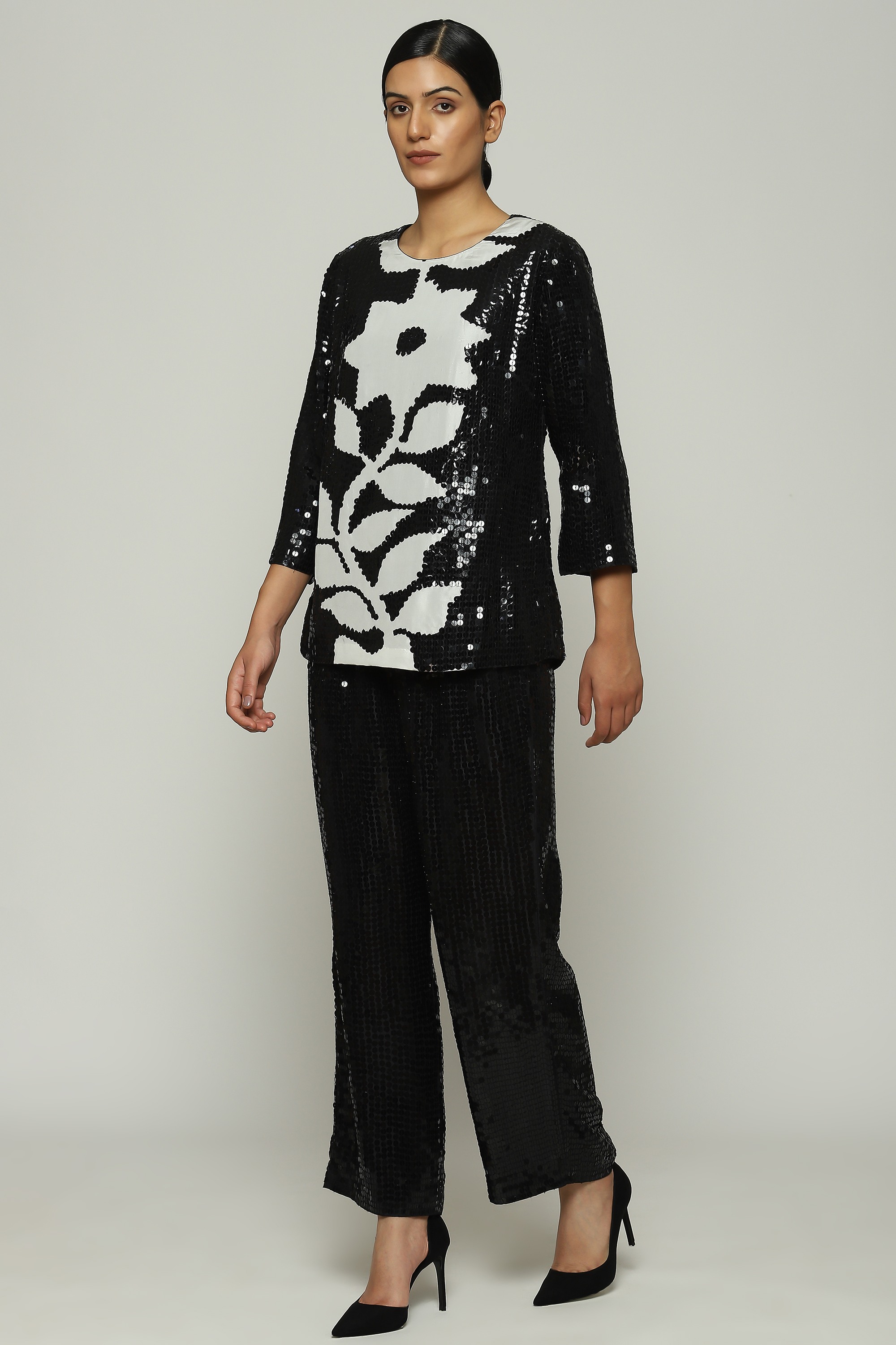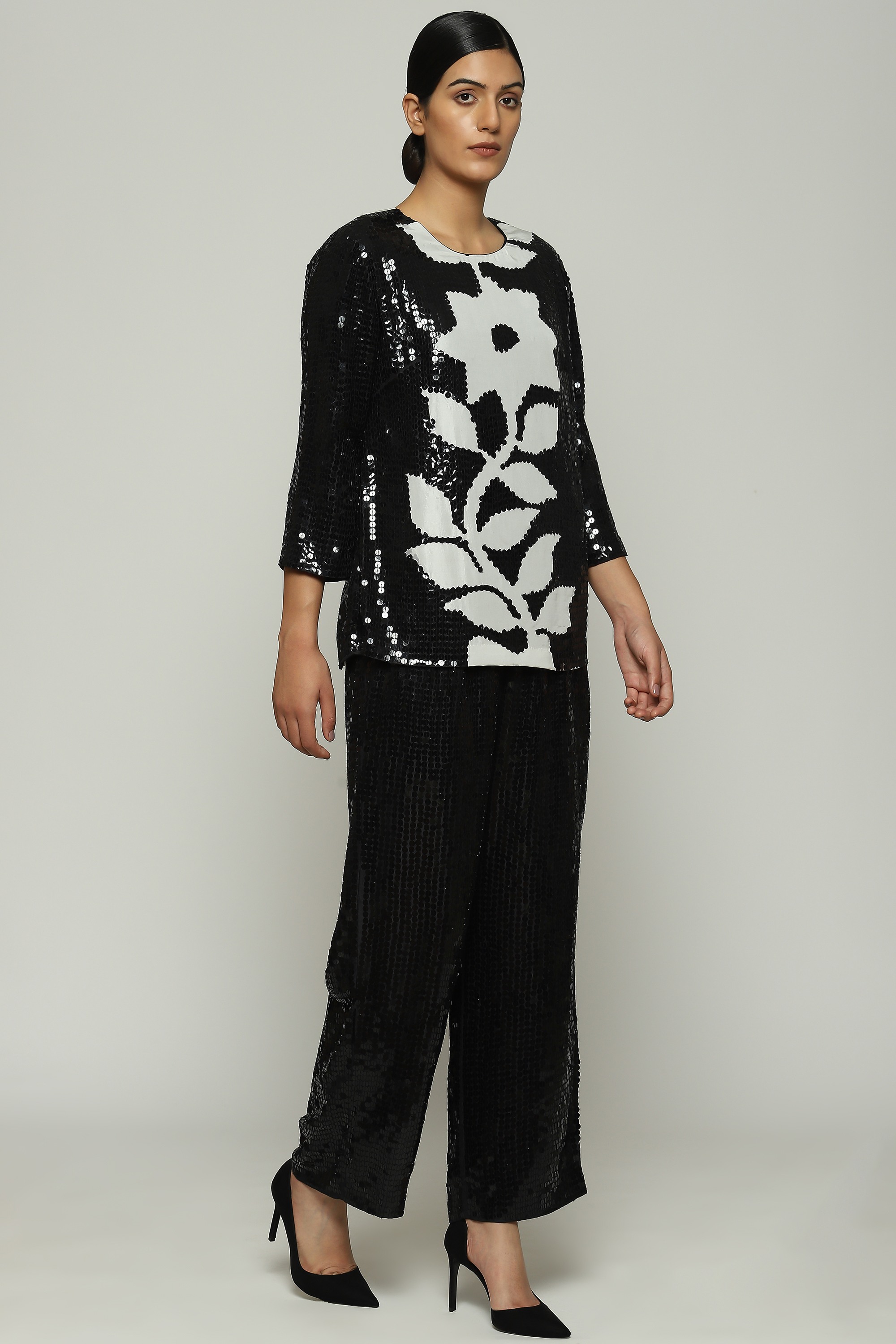 A black floral tunic hand-embellished with sequins, metal strips, pearls and beads.