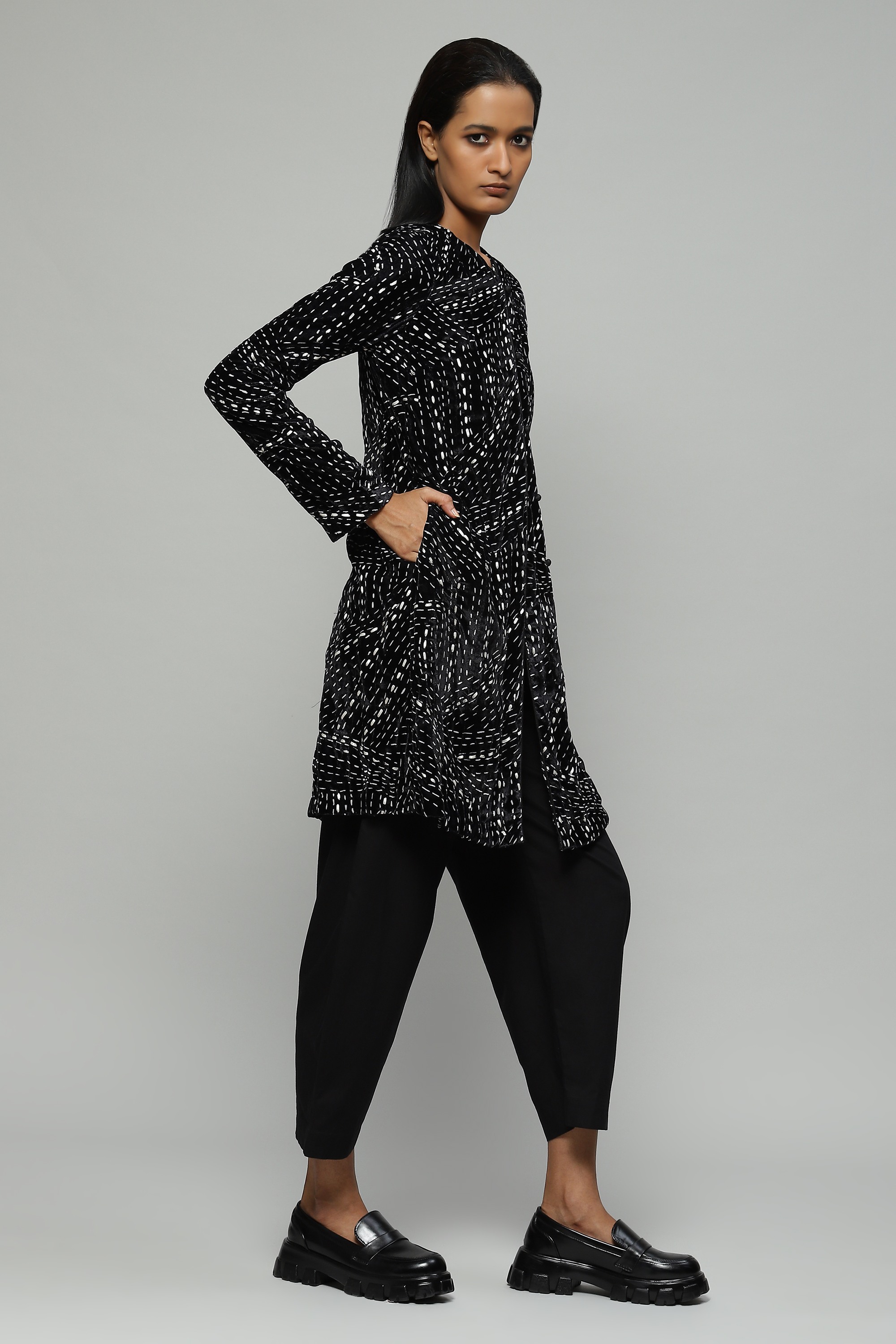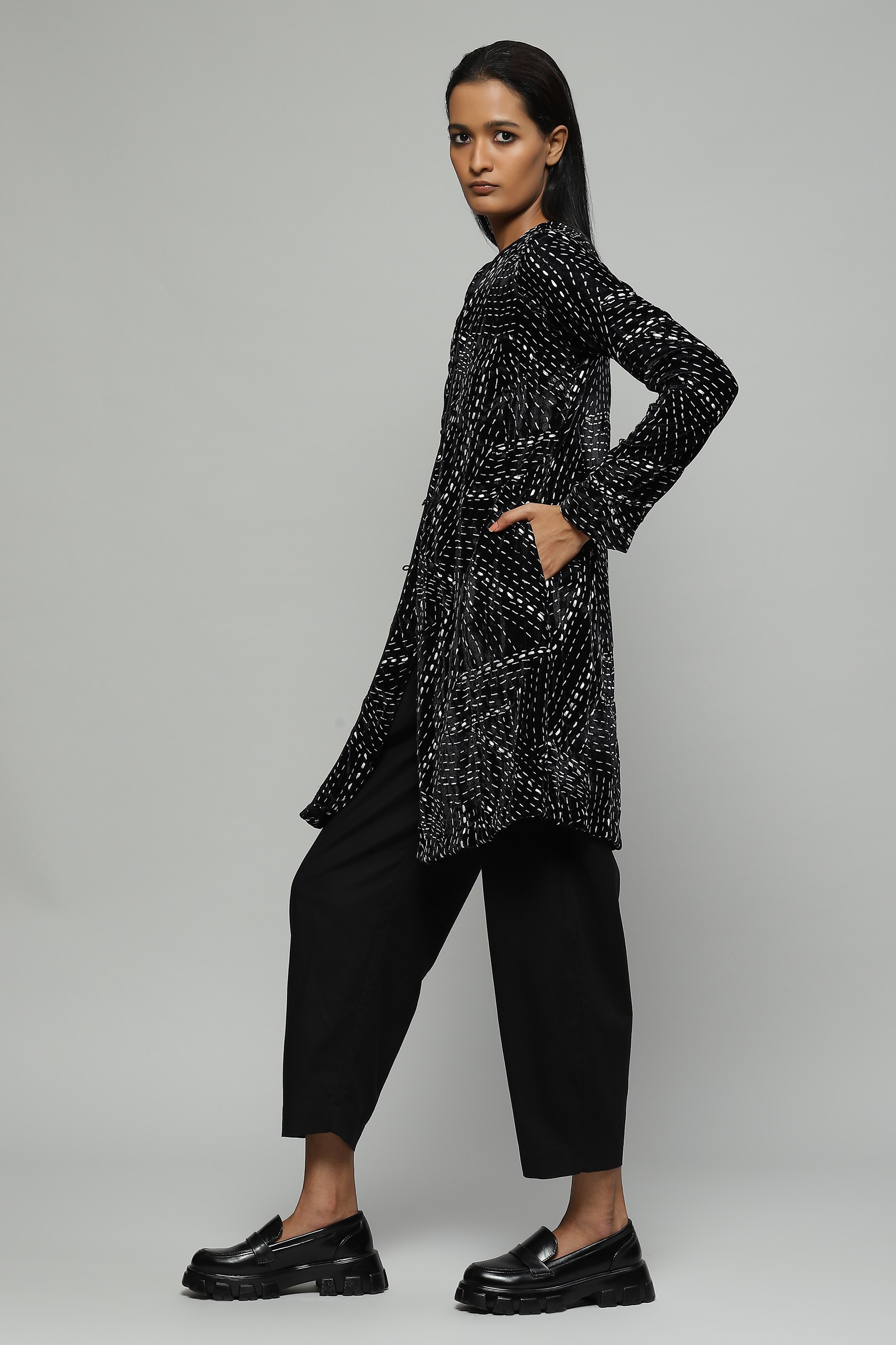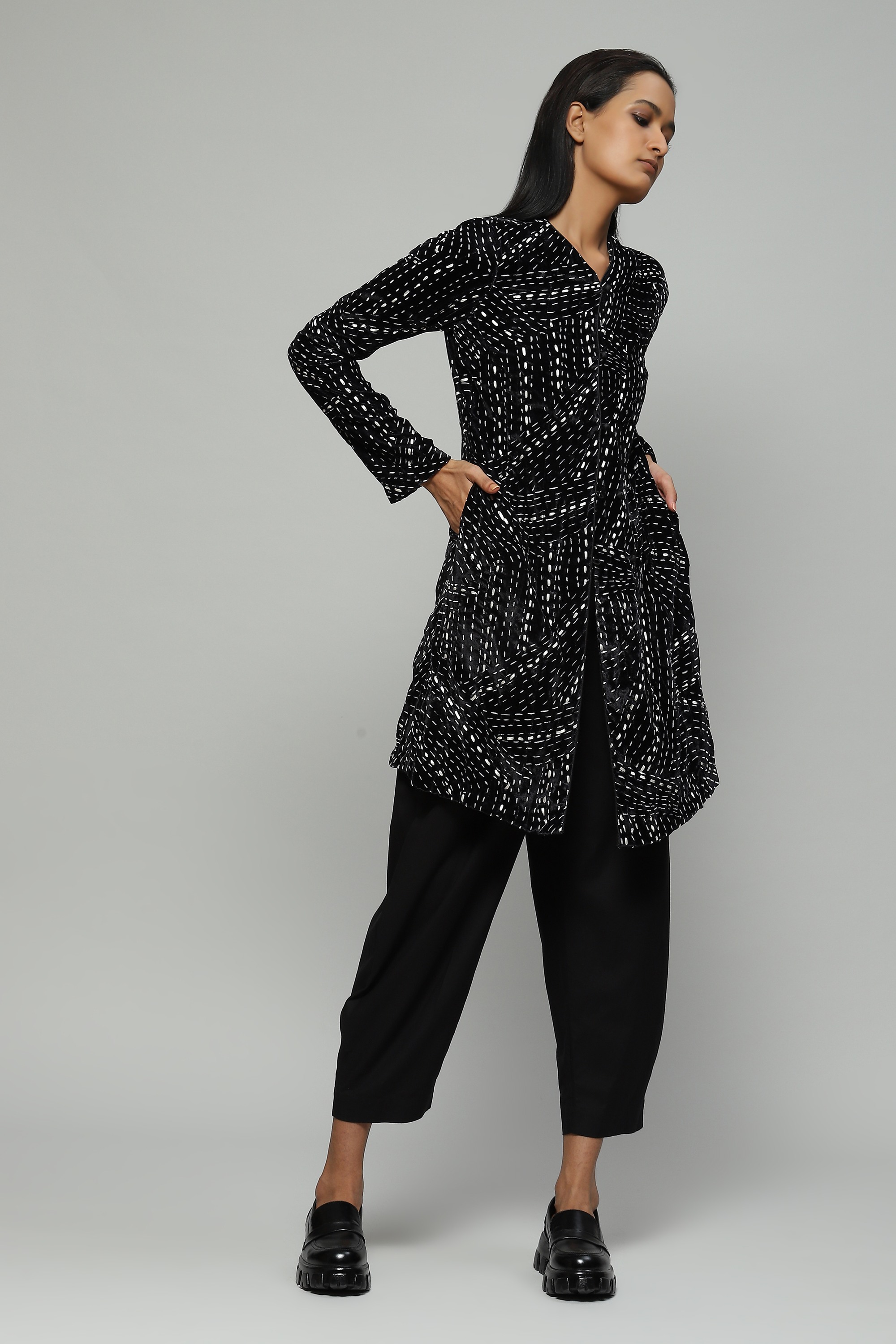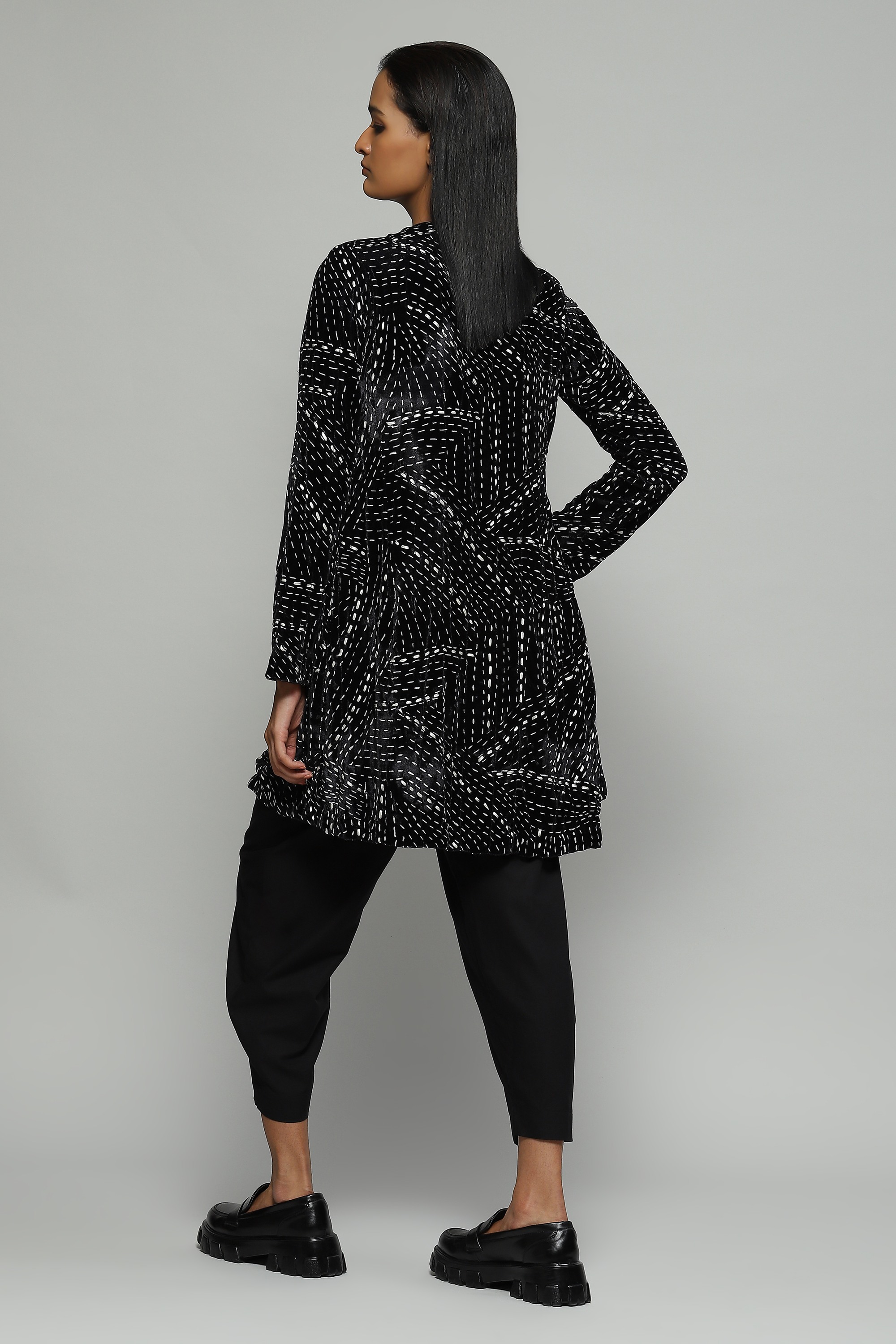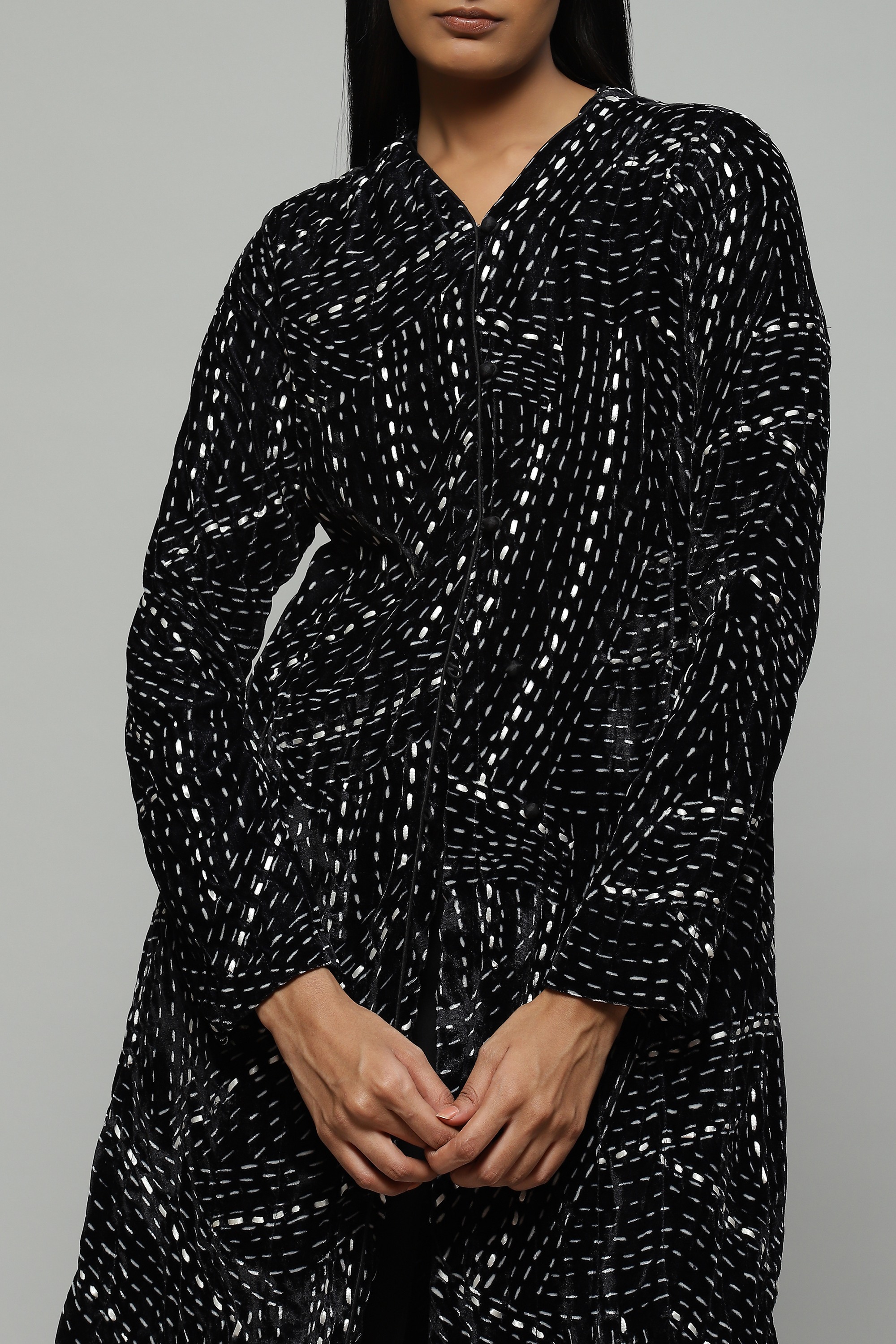 A black silk-velvet coat created using an allover kantha stitch print which is embroidered with a cord running stitch