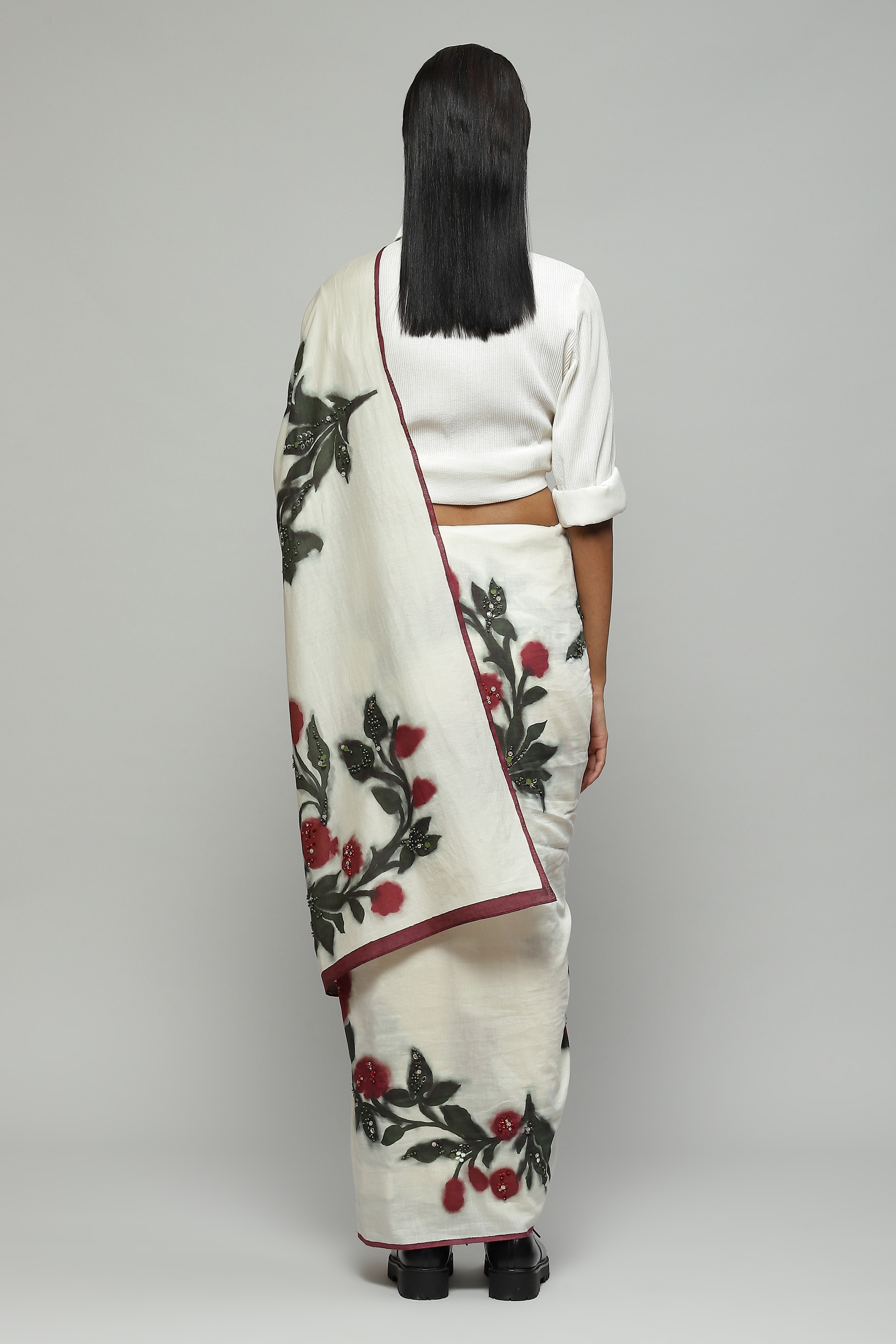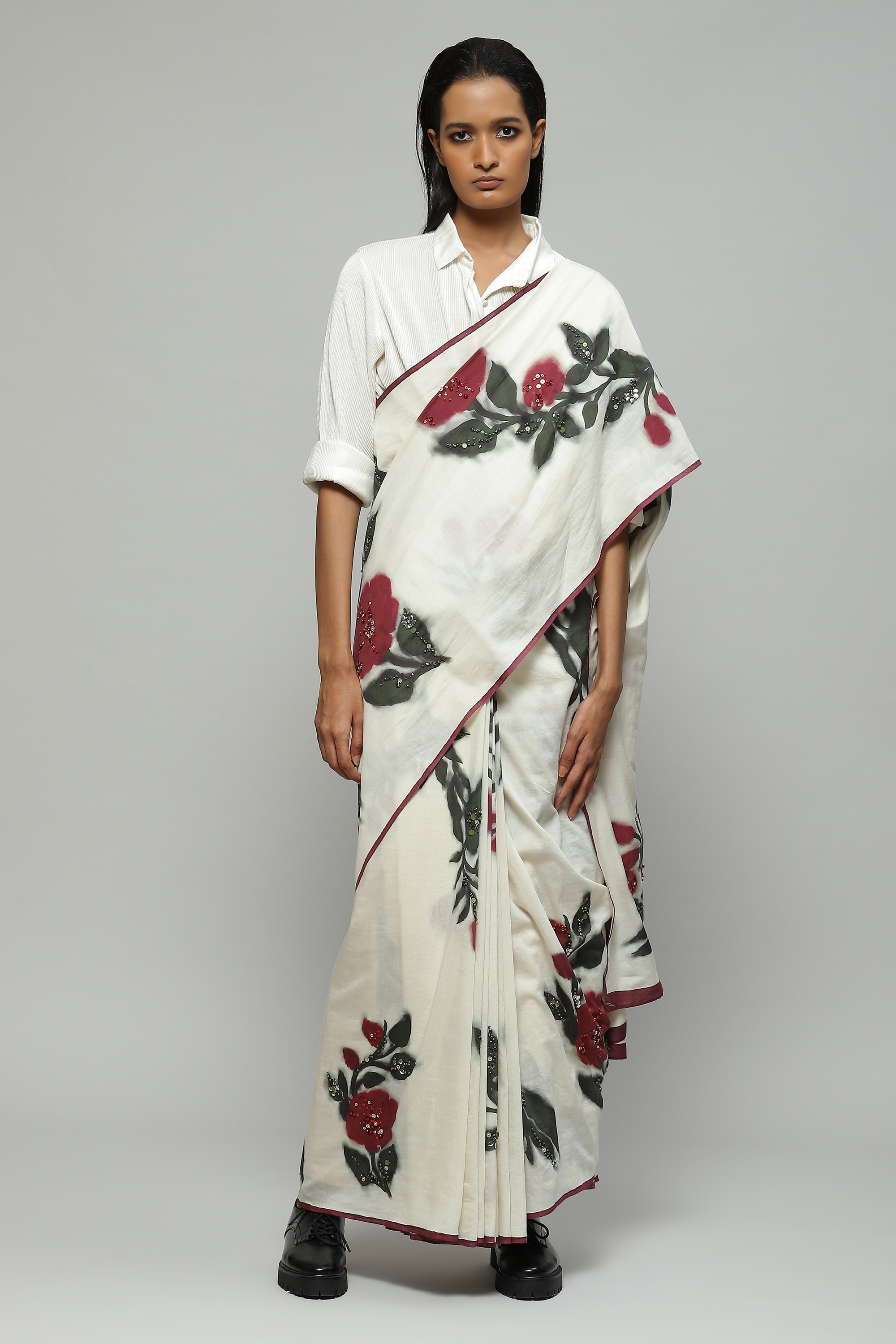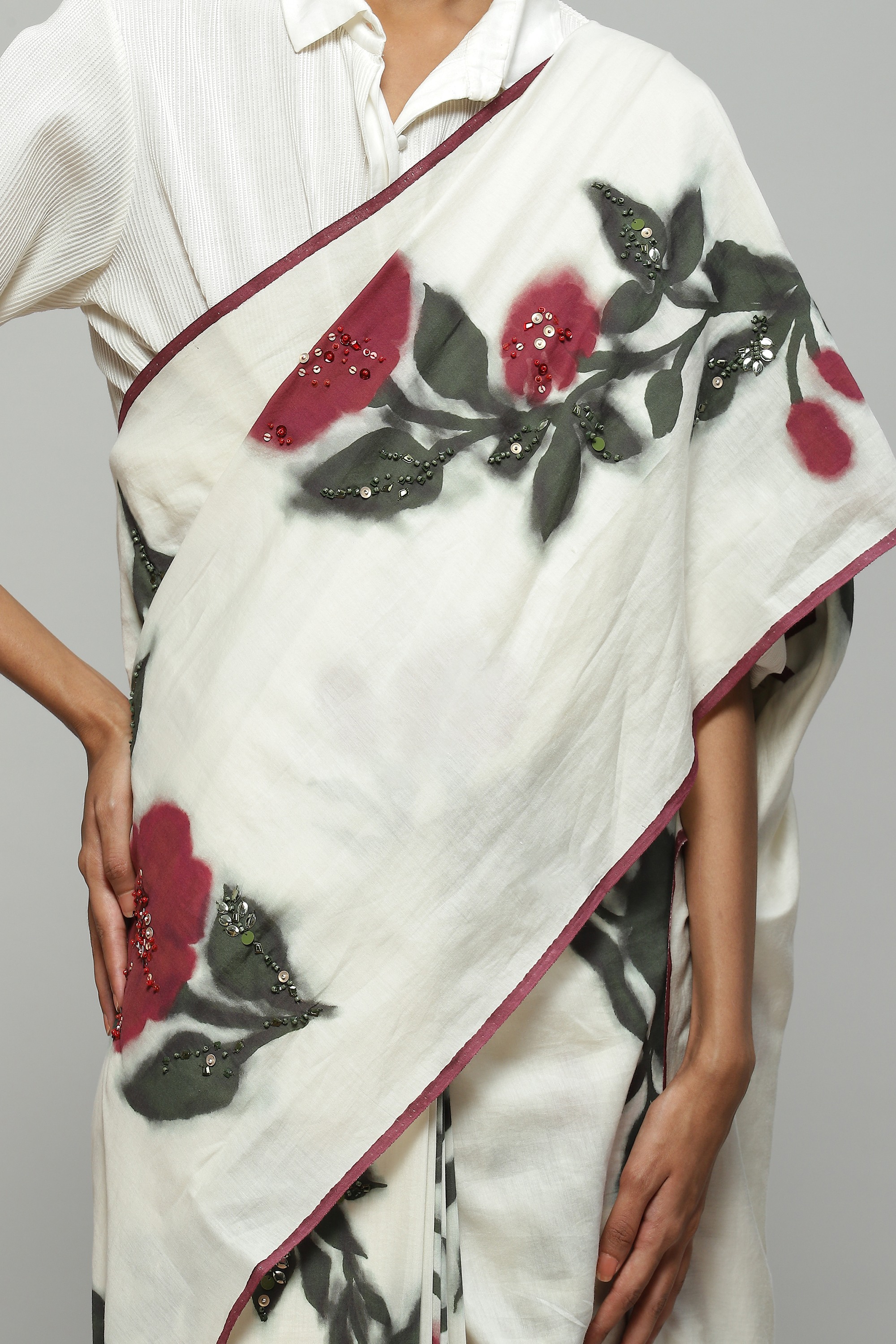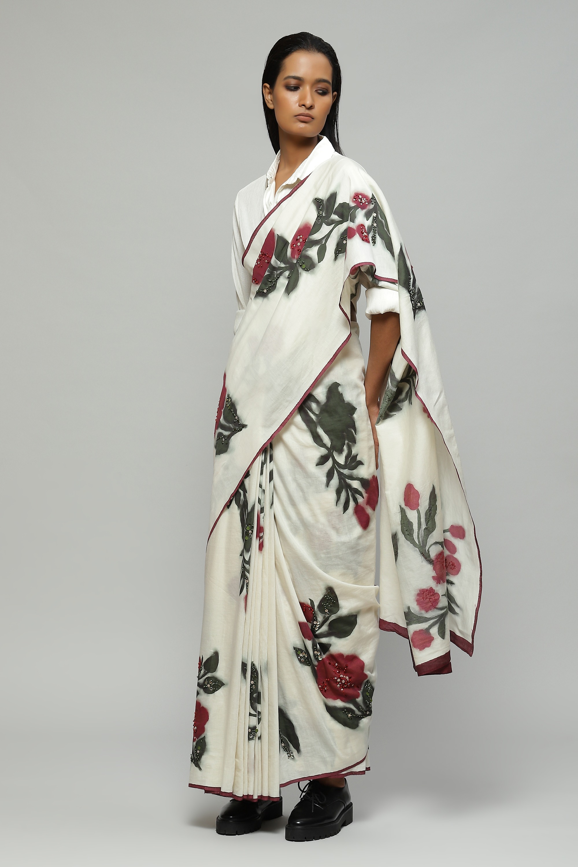 A floral silk voile sari bearing a digital print derived from a hand painted artwork