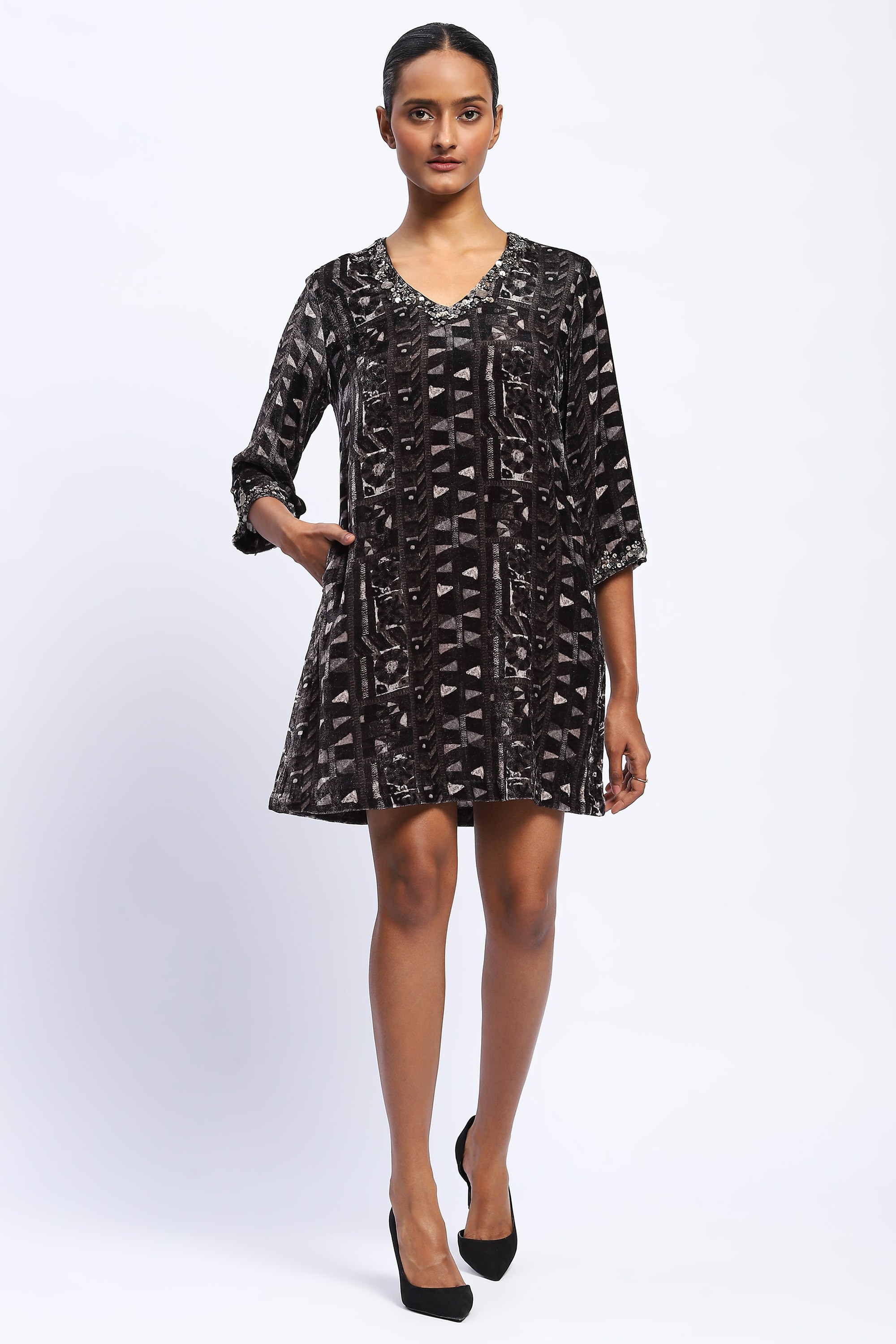 Crafted in velvet, this printed black dress is adda embroidered with sequins.