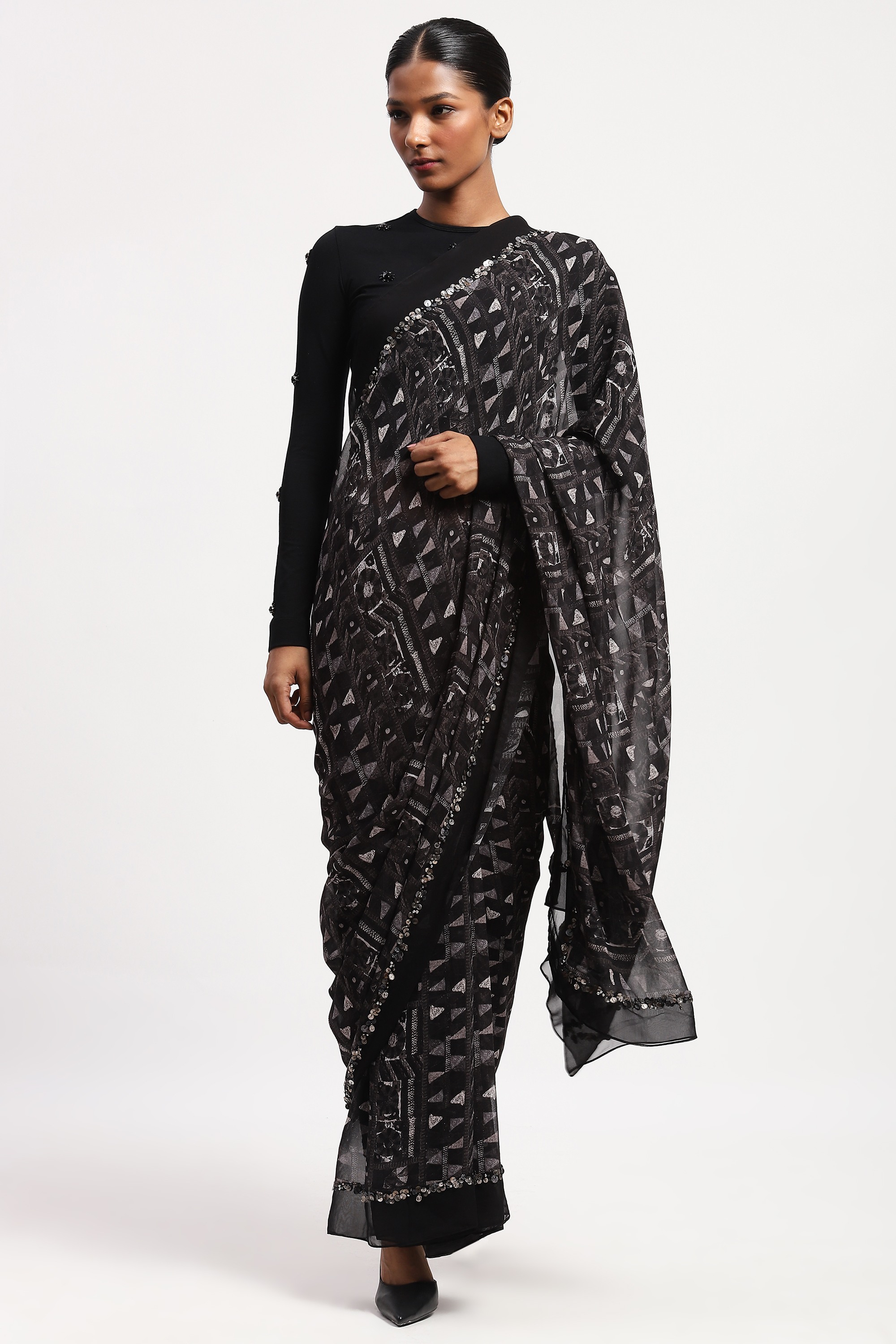 This limited edition piece has been made using a tribal inspired print which has then been embellished using a mix of trims for subtle evening glamour.