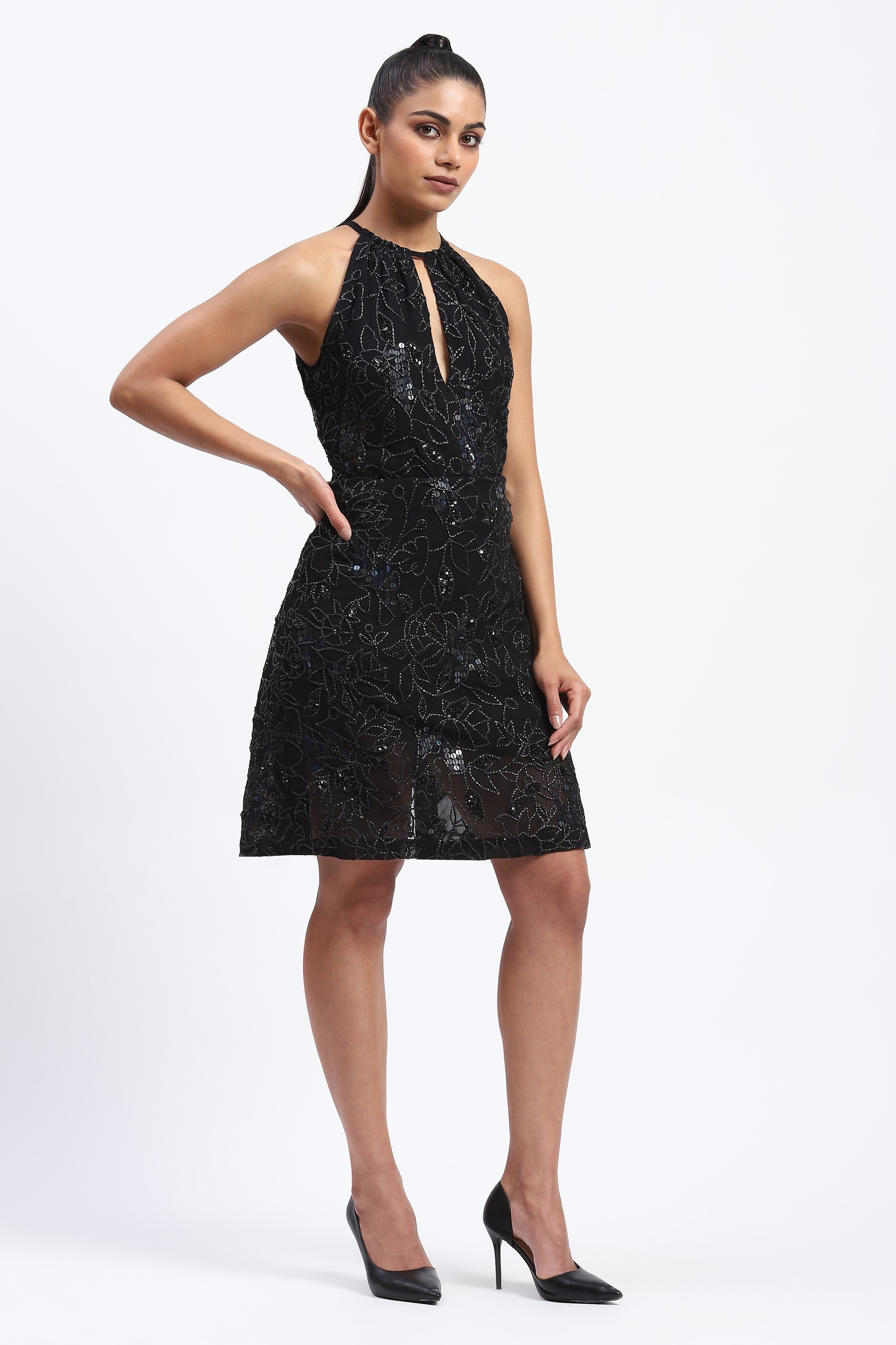 This limited edition piece has been made using a georgette base embellished with an all over floral pattern using upcycled plastic and x - ray sequins. Ideal chic for a sultry summer evening.