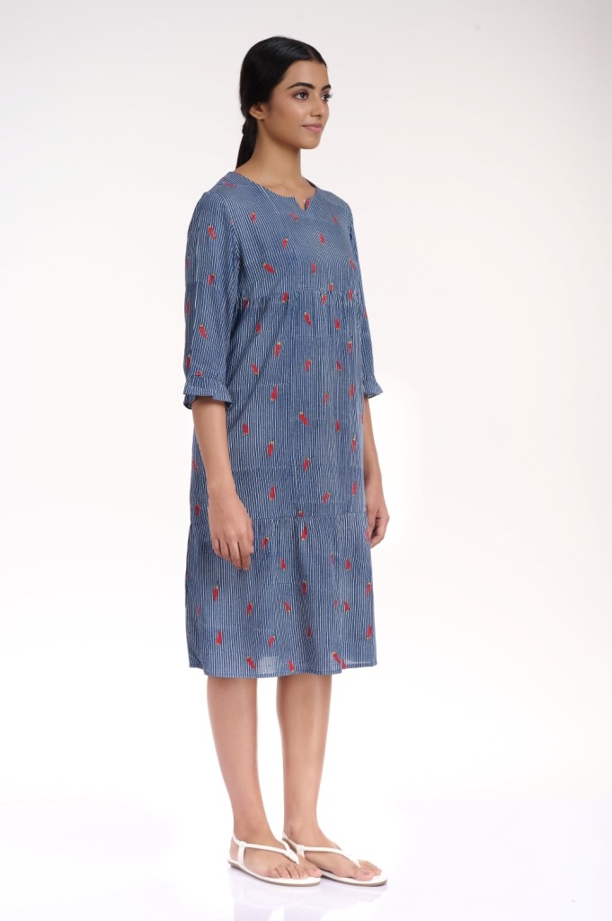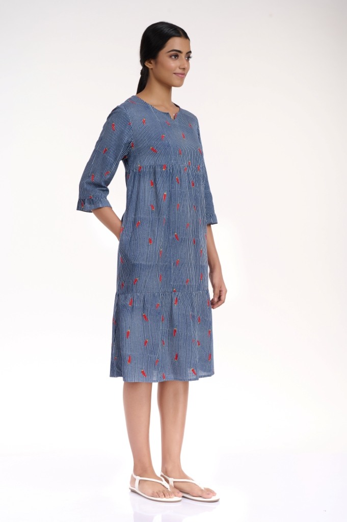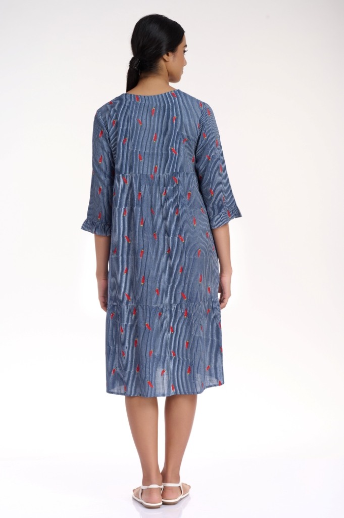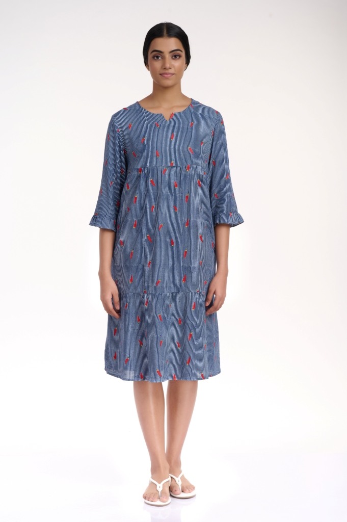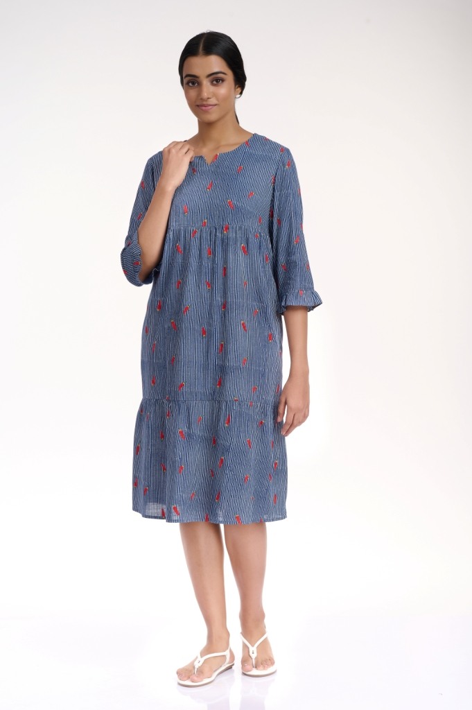 A comfortable and flattering silhouette in indigo and white, embroidered dress with allover chilli motif, crafted from cellulose sustainable fabric, detailed with soft gathers on the tieres and ruffle trim on the sleeves. Has pockets in the side seams.
