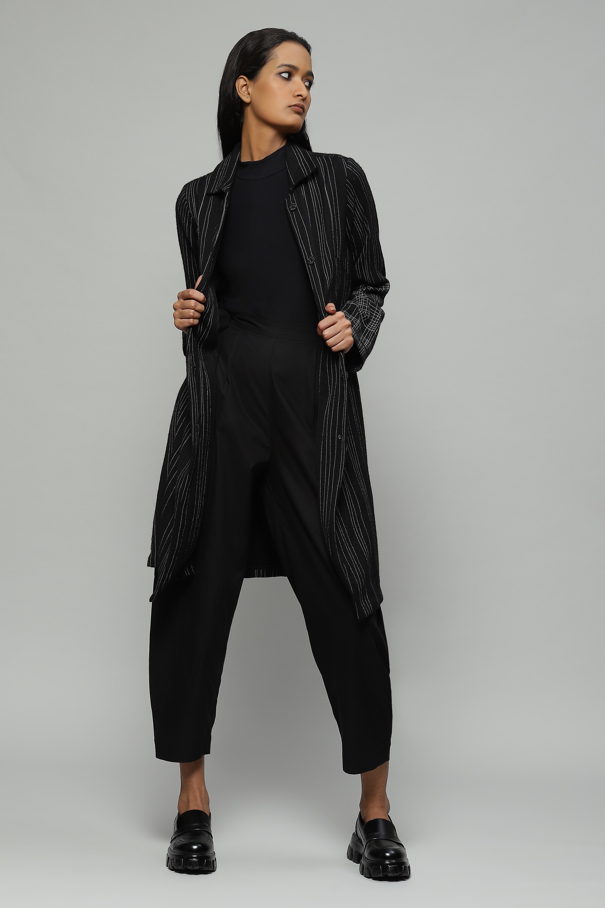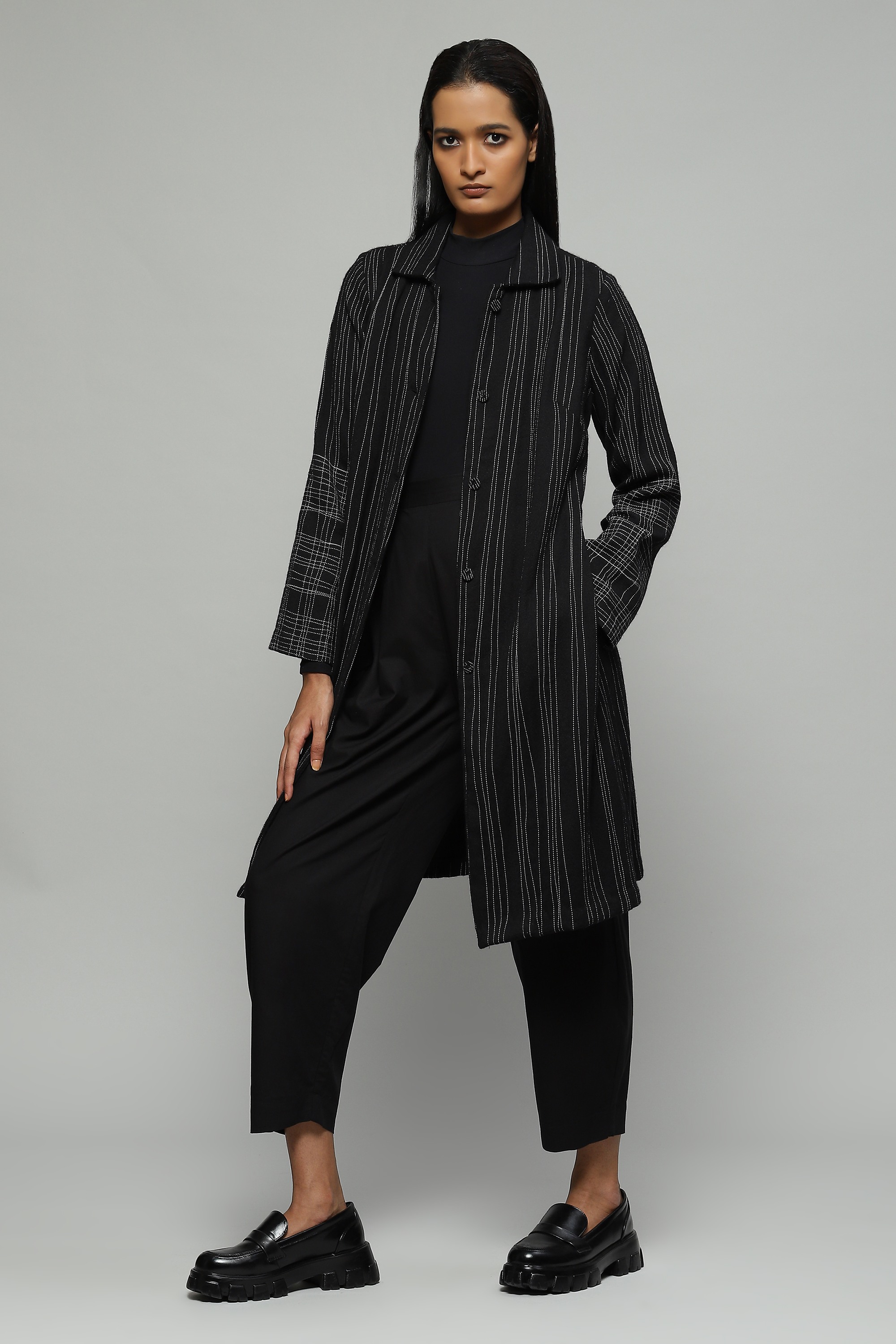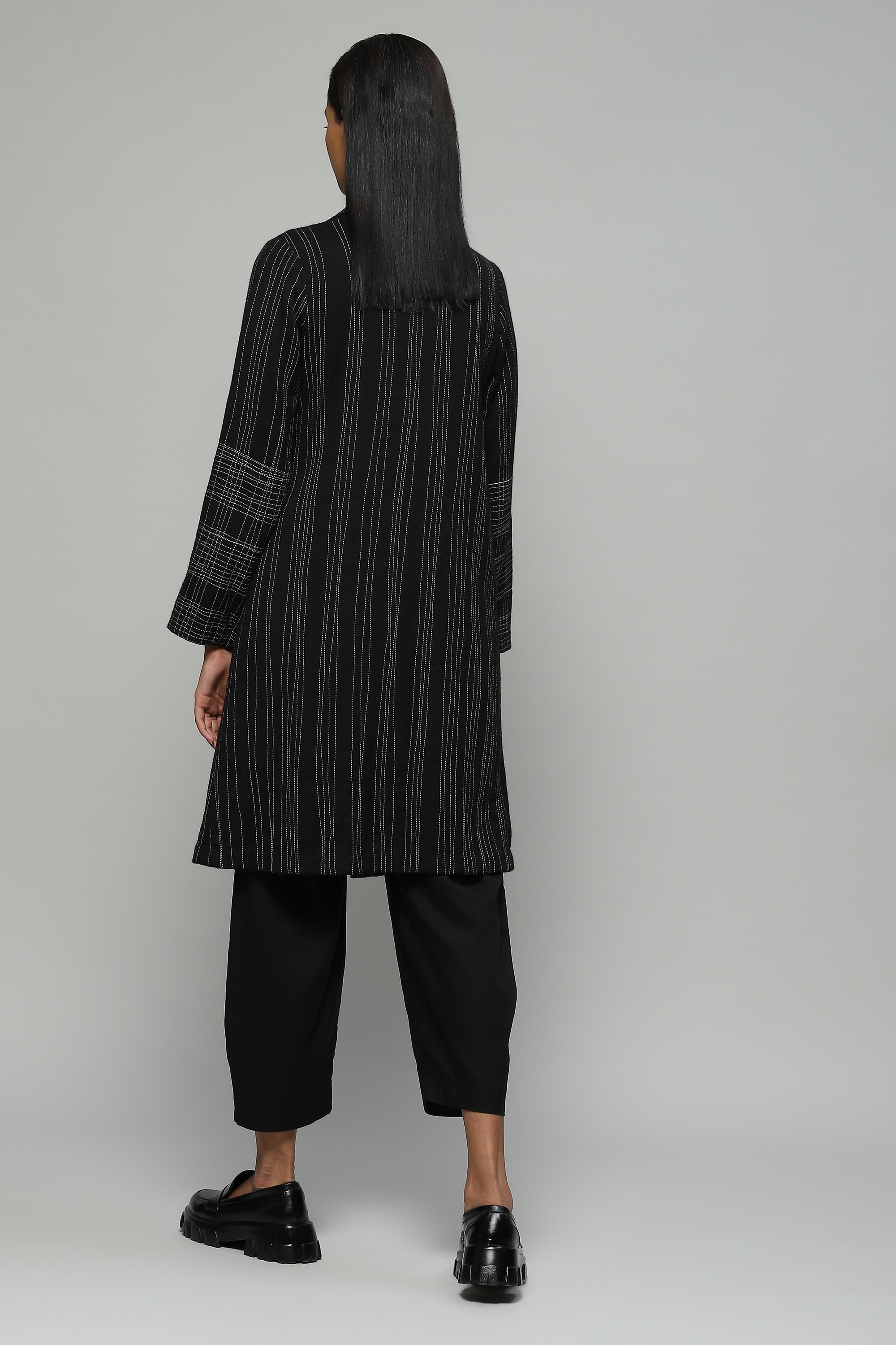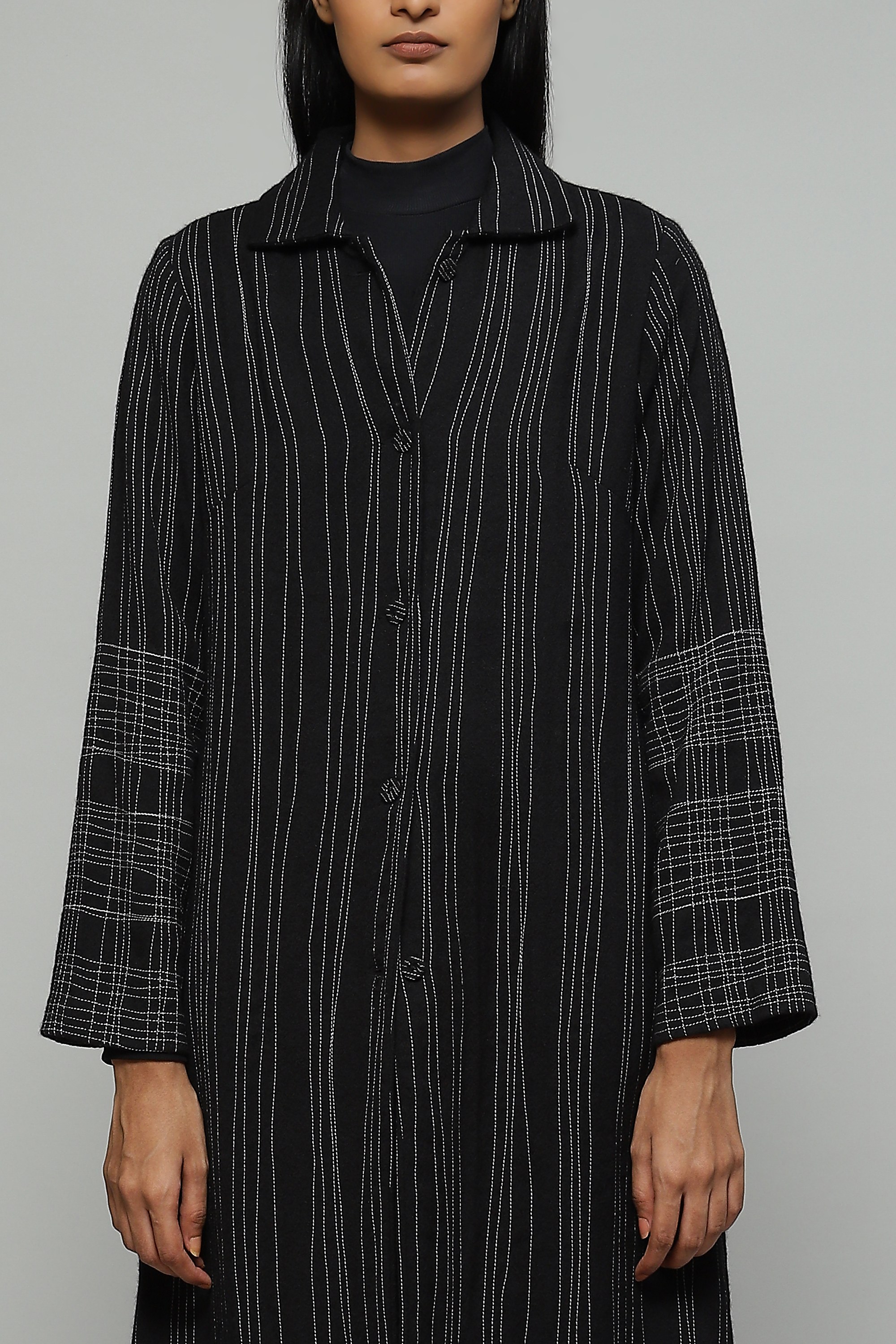 A black coat crafted in wool crepe and embroidered with hand-done stitching