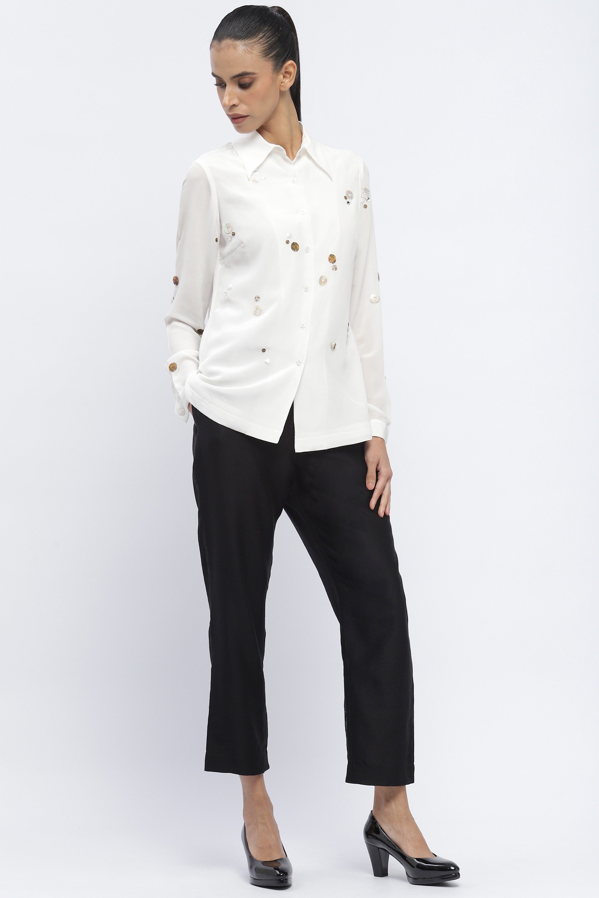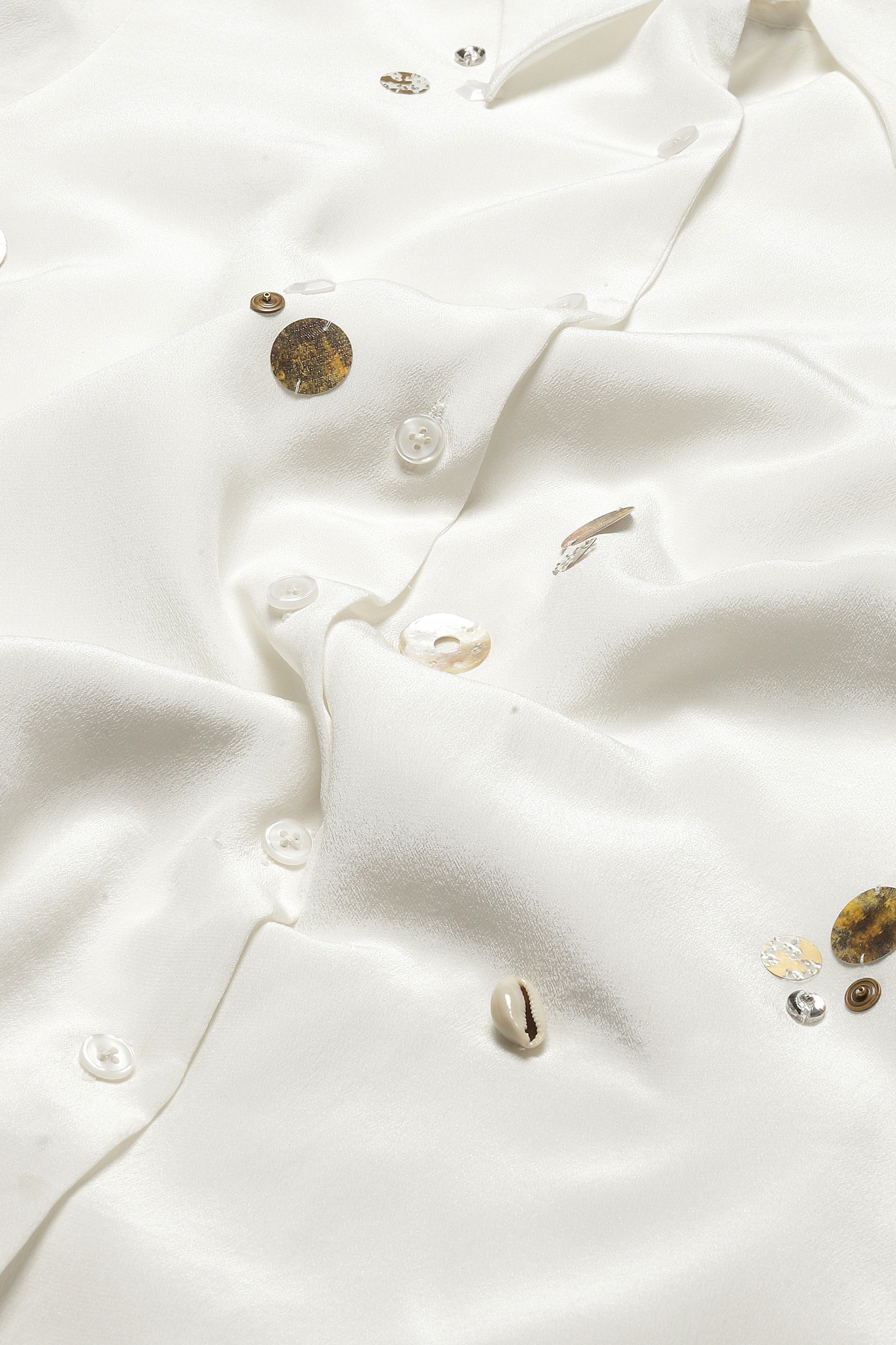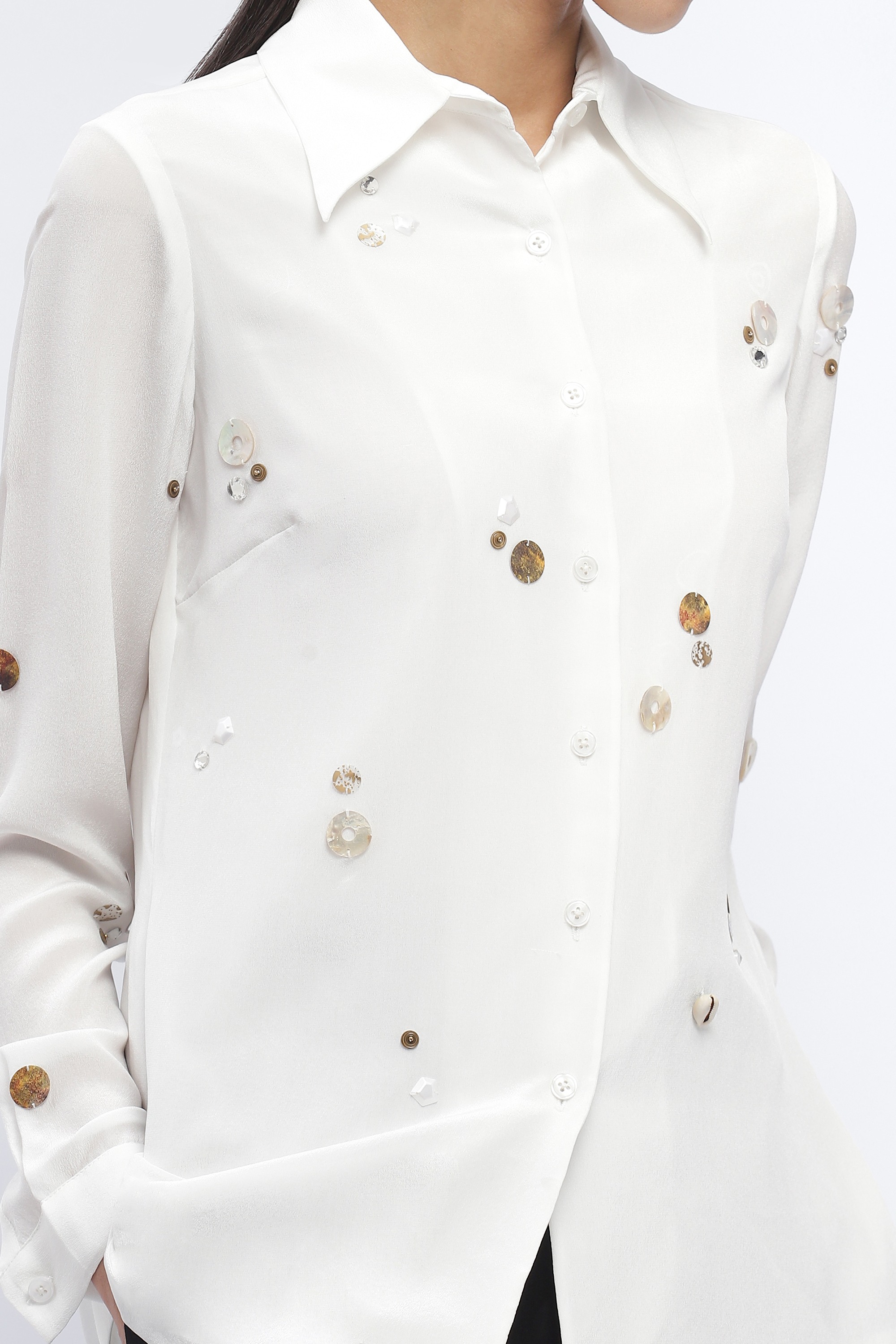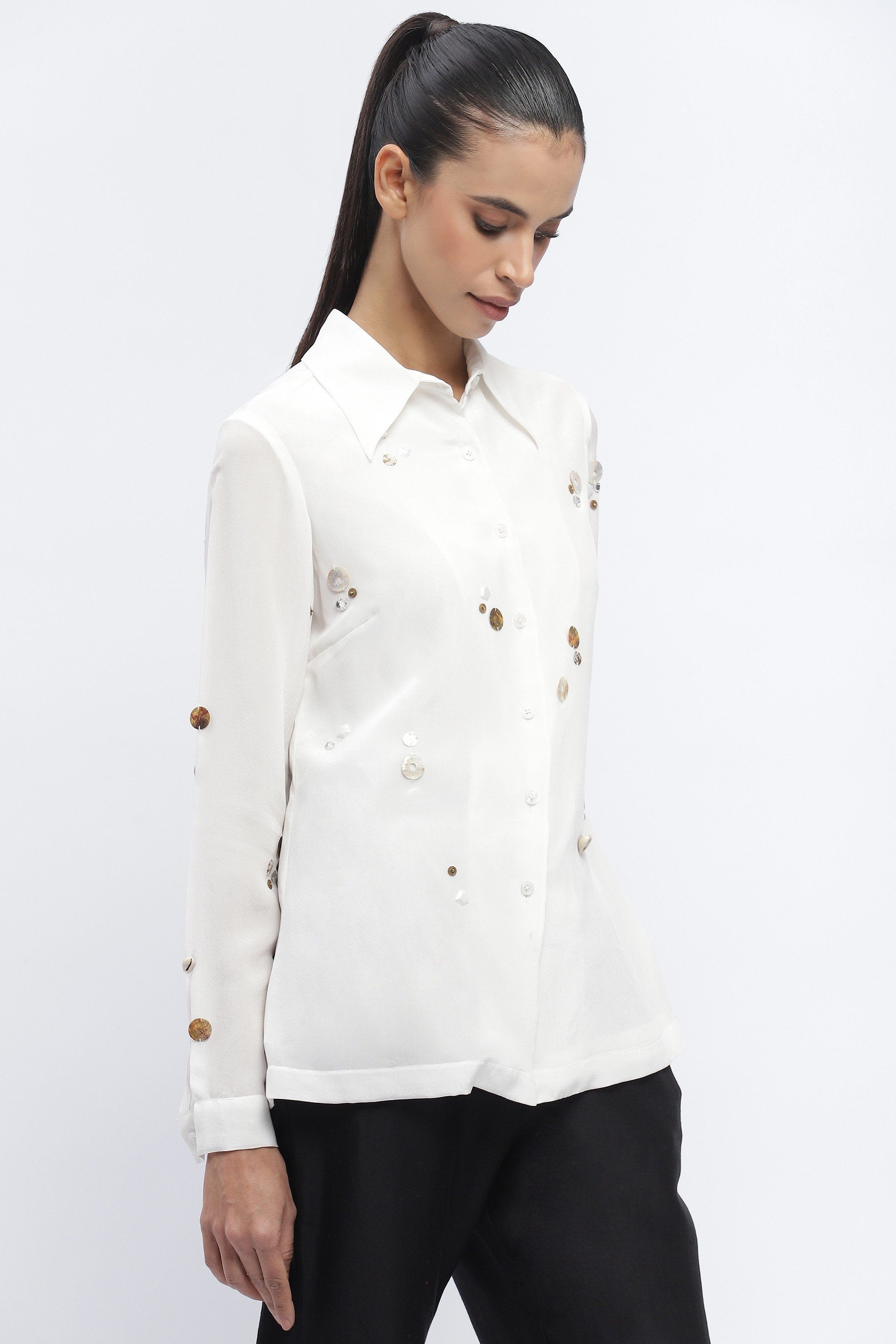 Ideal for a bop, this ivory shirt is crafted in fluid crepe. Rhinestones, sequins and pearls evoke ample inspiration.