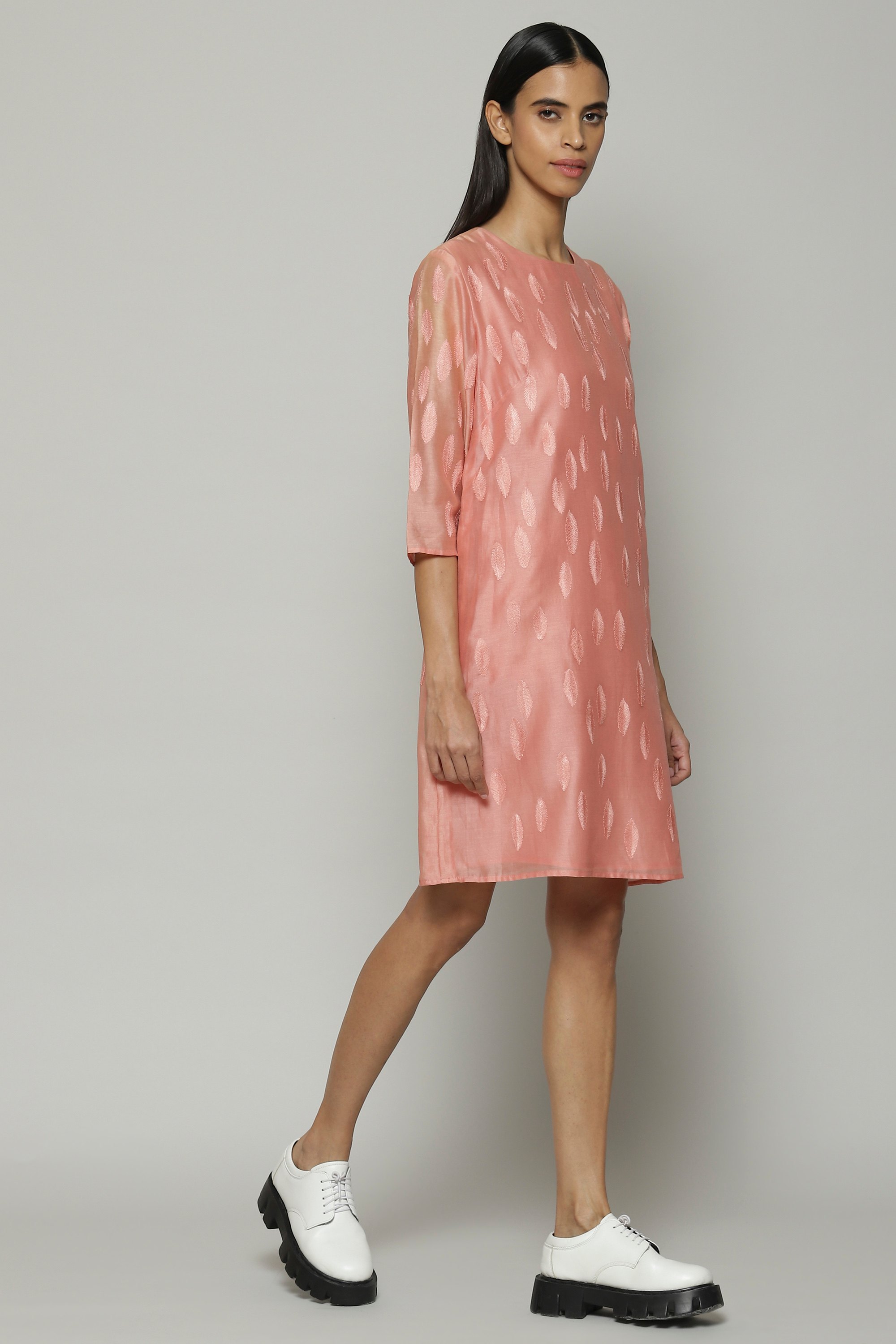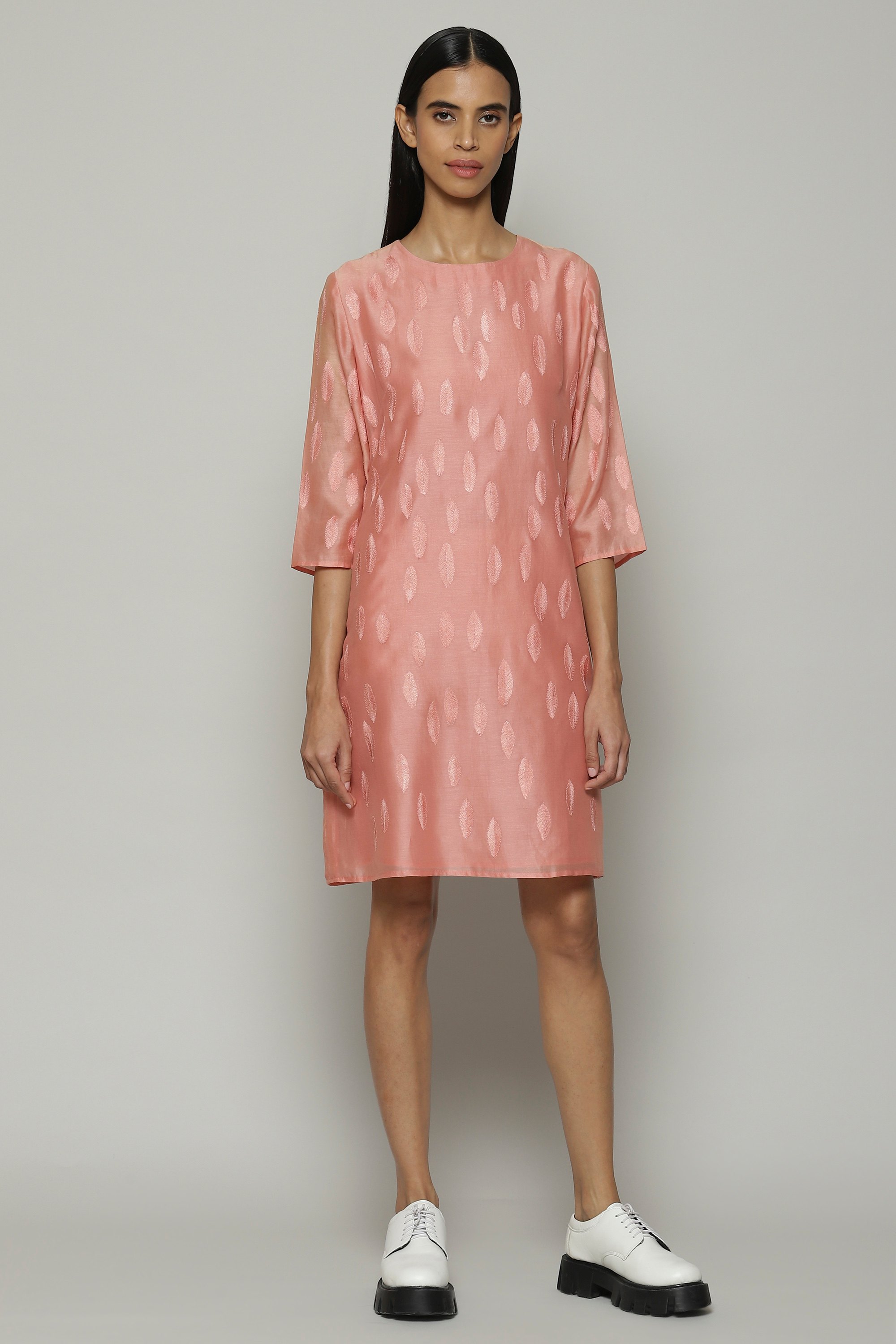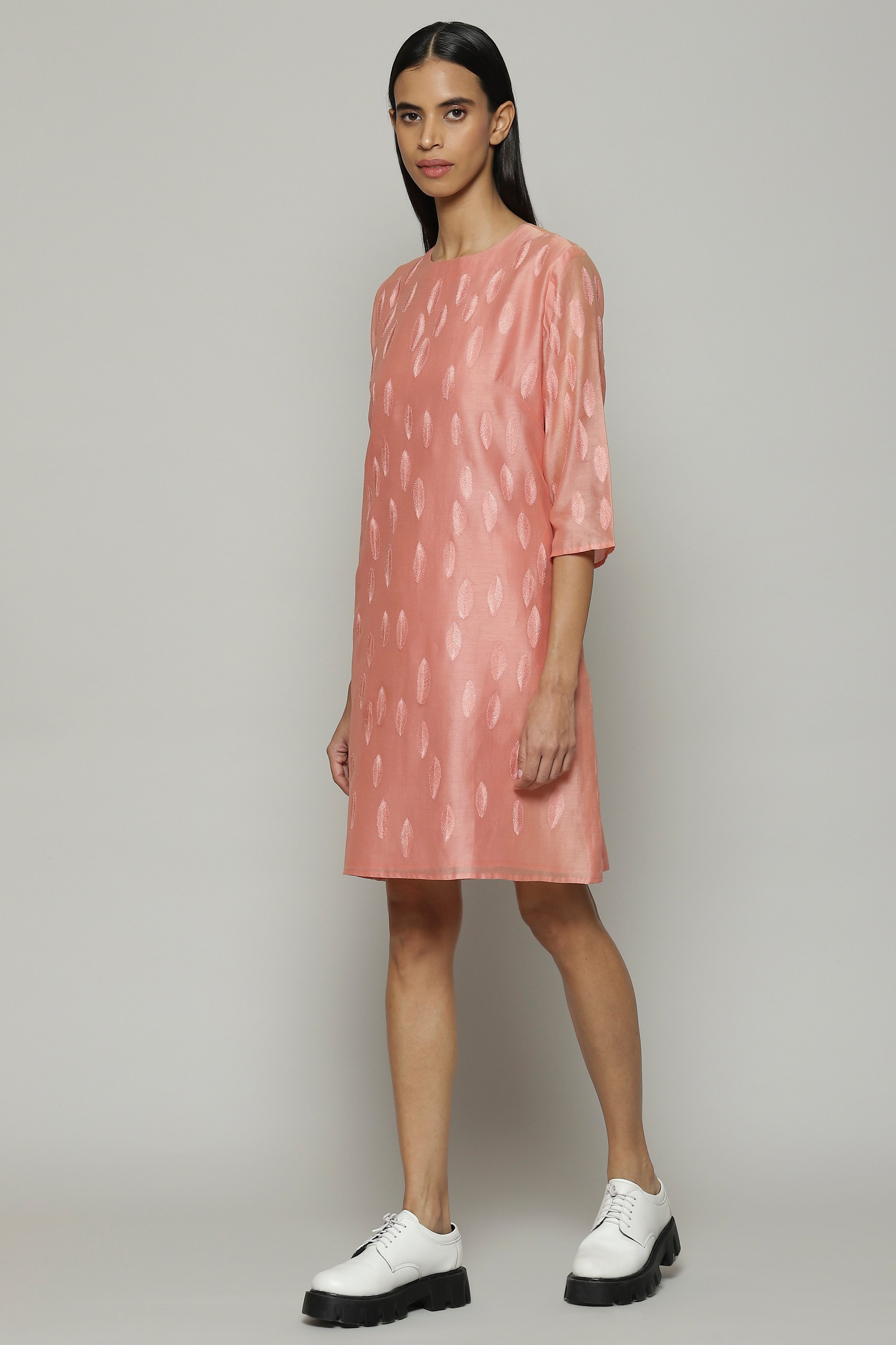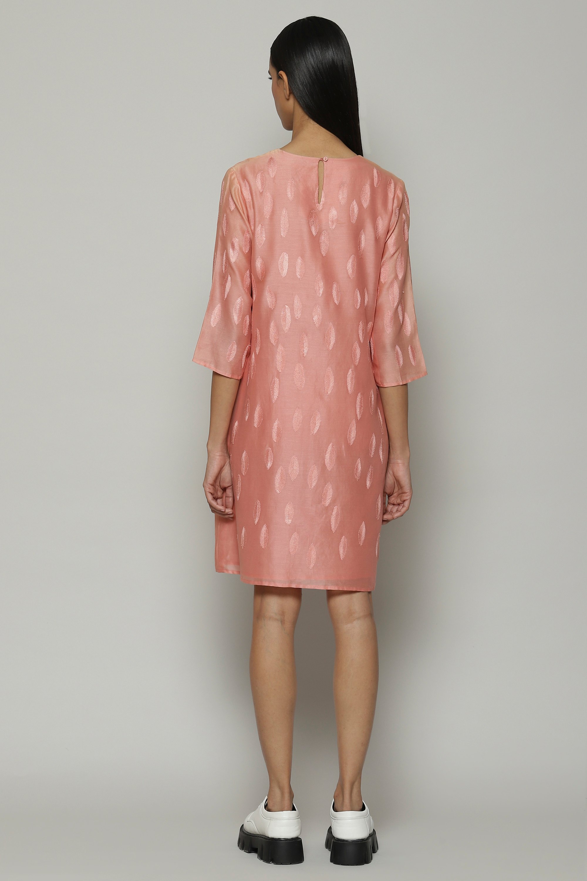 A lemonade pink kurta embroidered with scattered leaf motifs. Crafted in lightweight chanderi, this garment is constructed In silk and cotton. Silken yarn embroidery has been used to create the intricate design. Ideal with lace-up Oxford's for a city sunset.