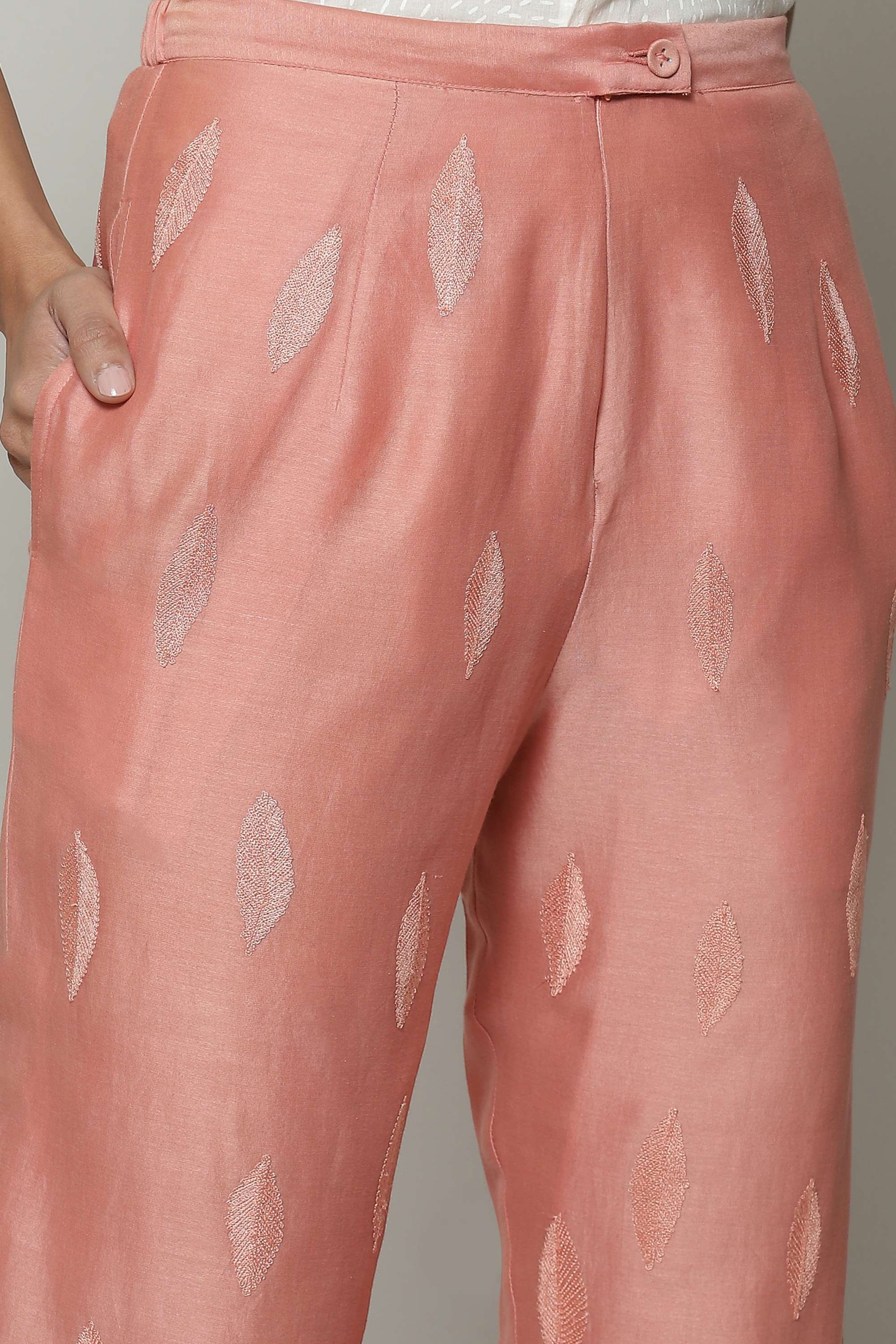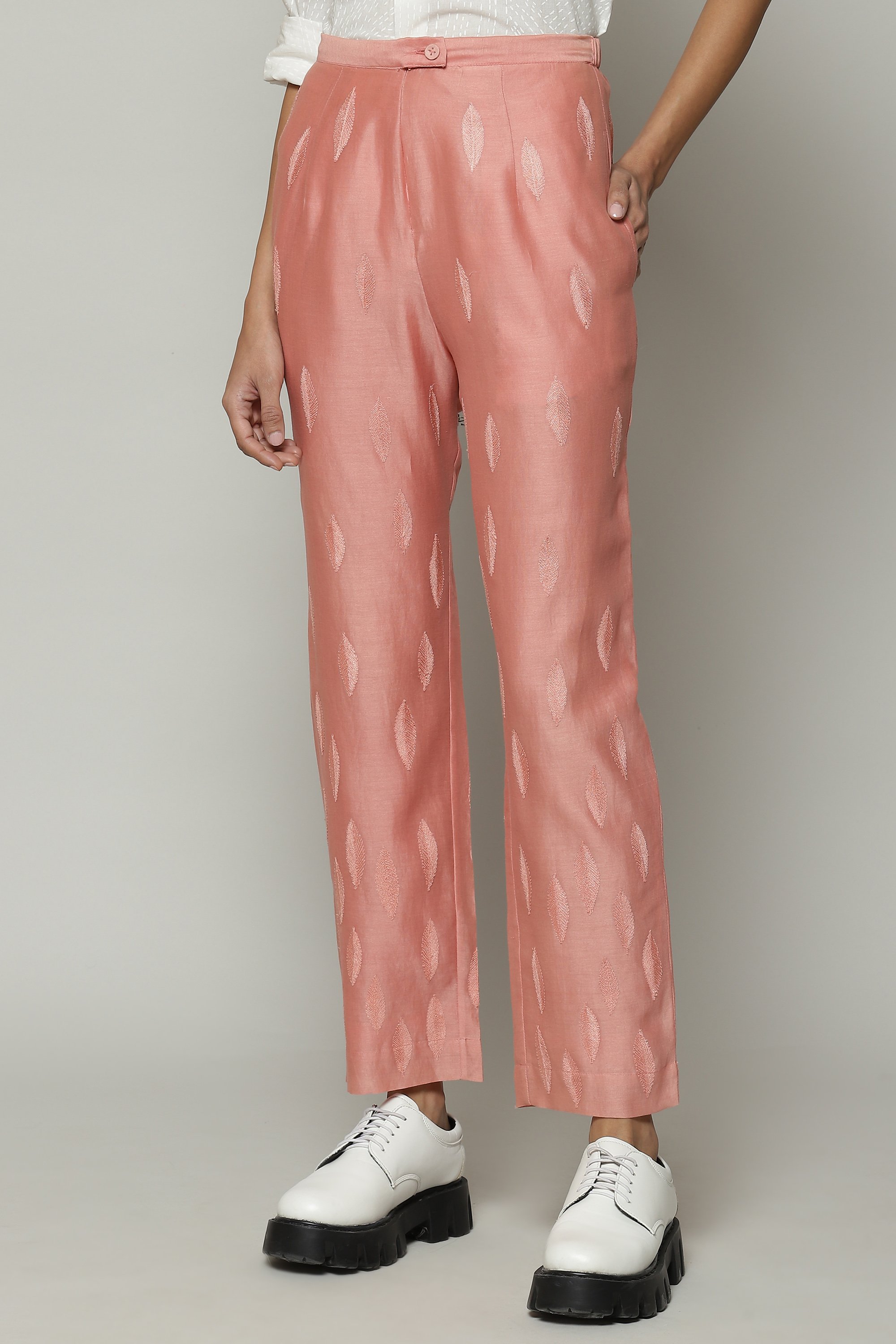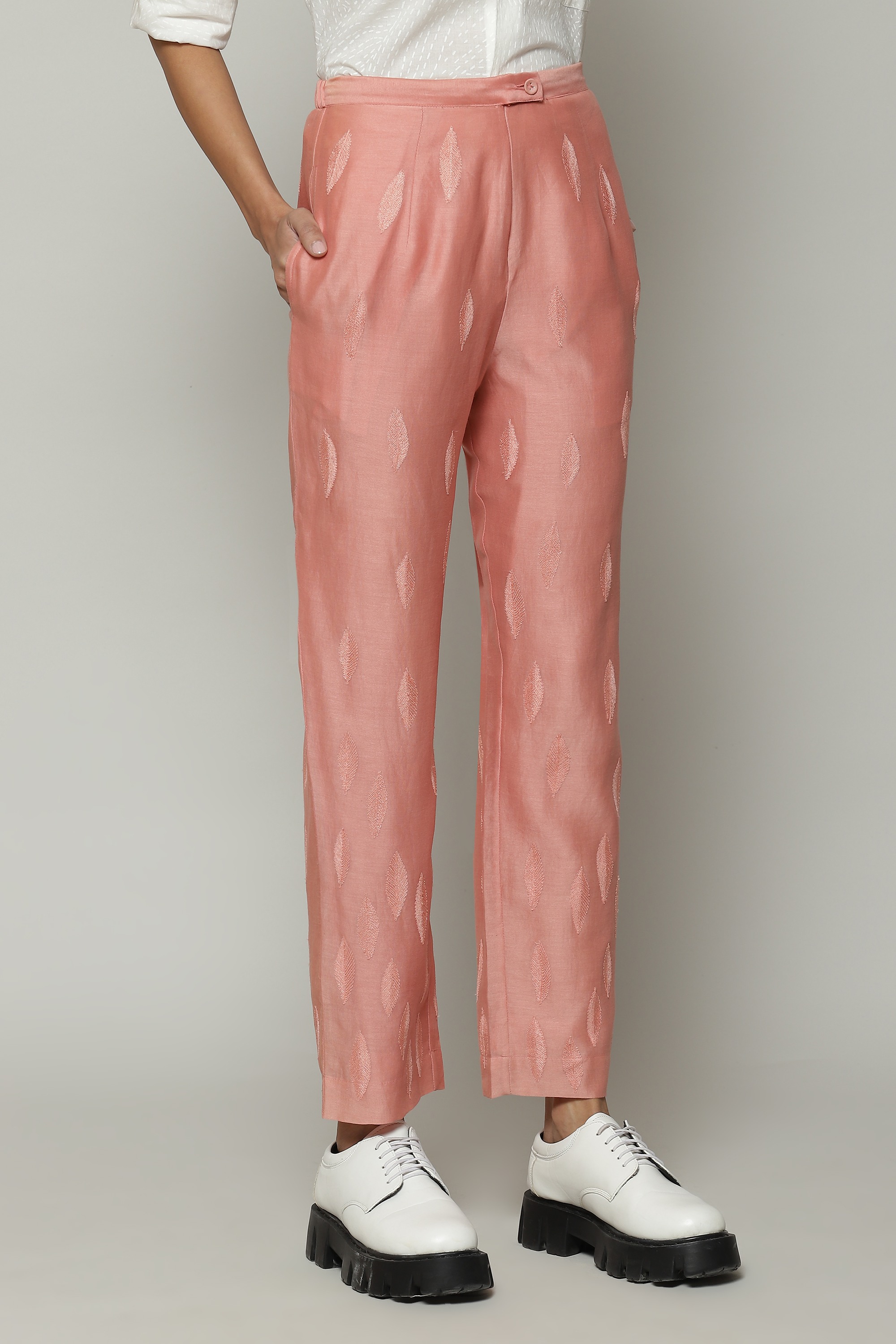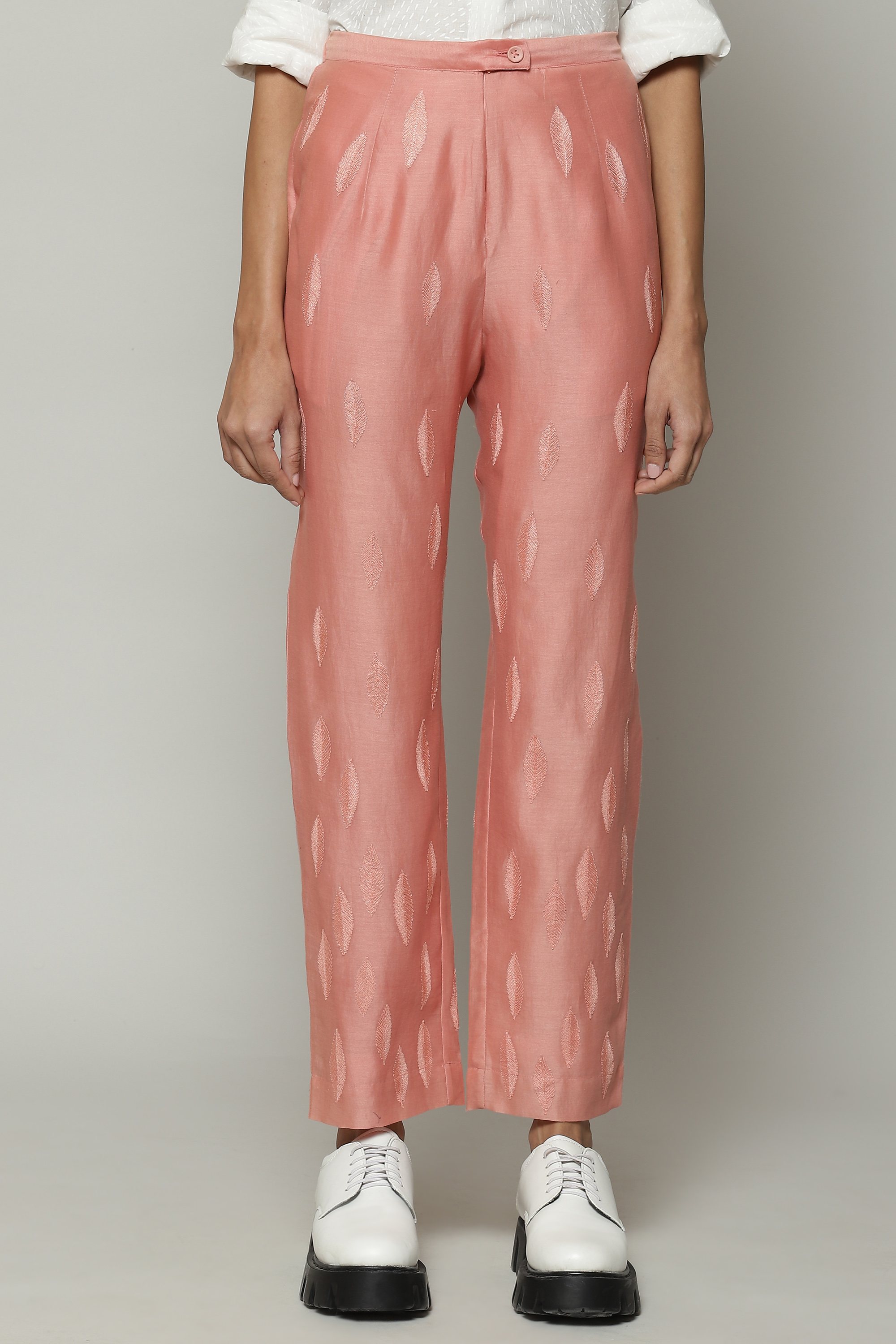 Lemonade pink trousers embroidered with a scattered leaf motif in a shade of the same, bright hue. Crafted in lightweight cotton and silk chanderi fabric, this features delicate silken embroidery. Ideal for a an evening under the moon.