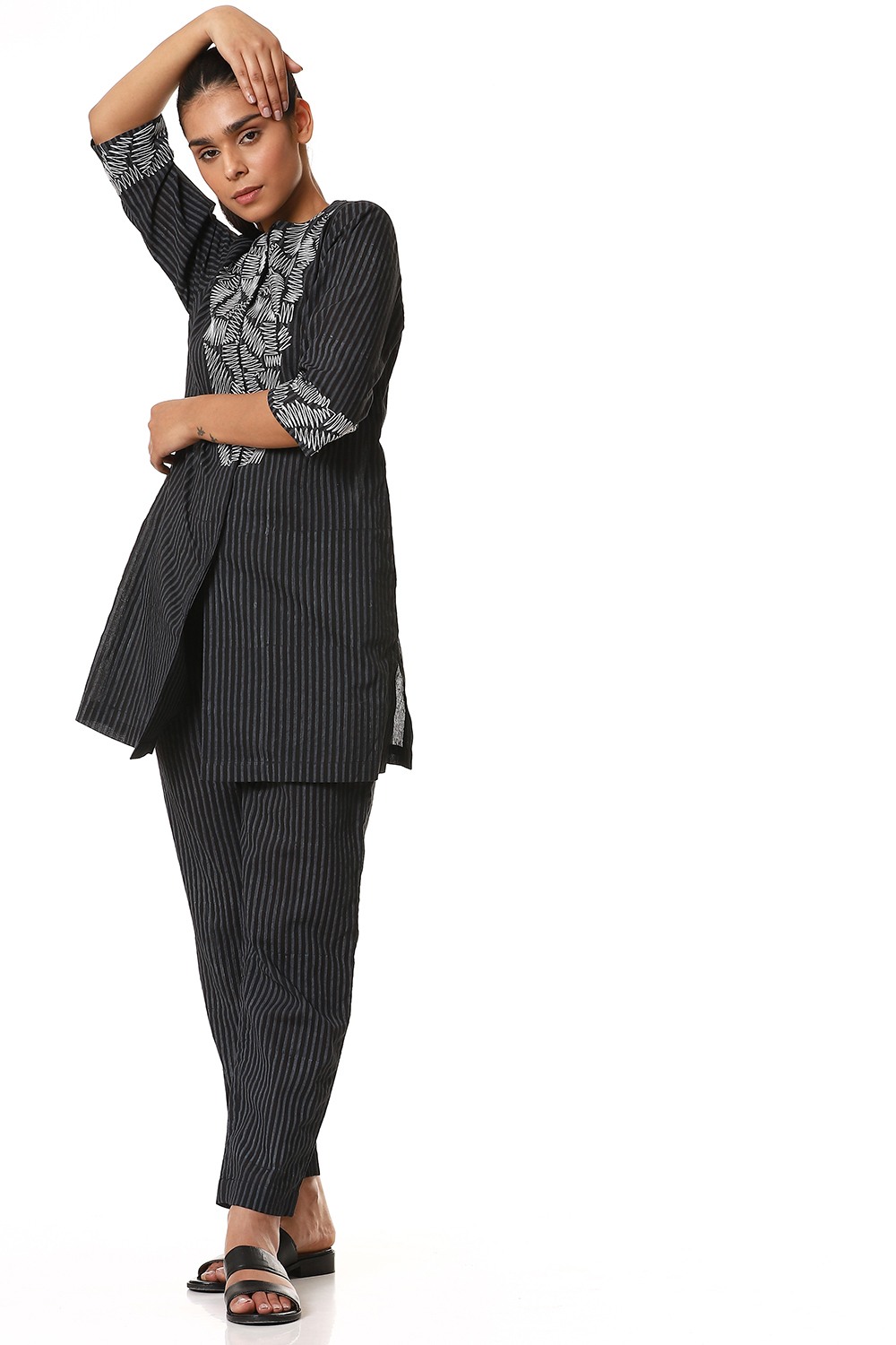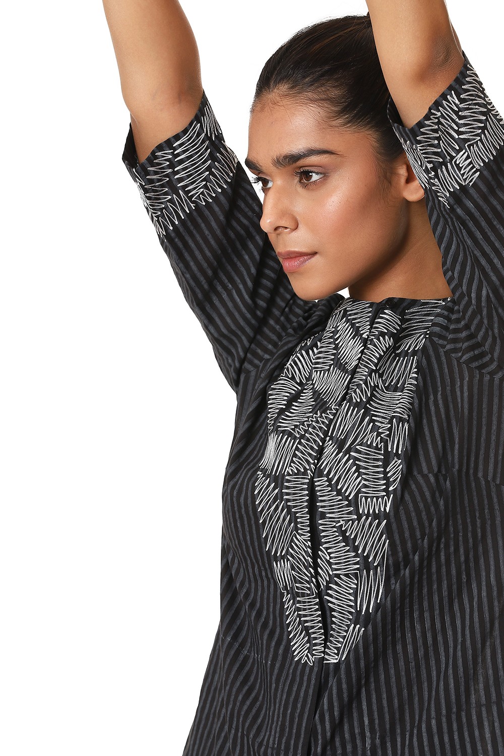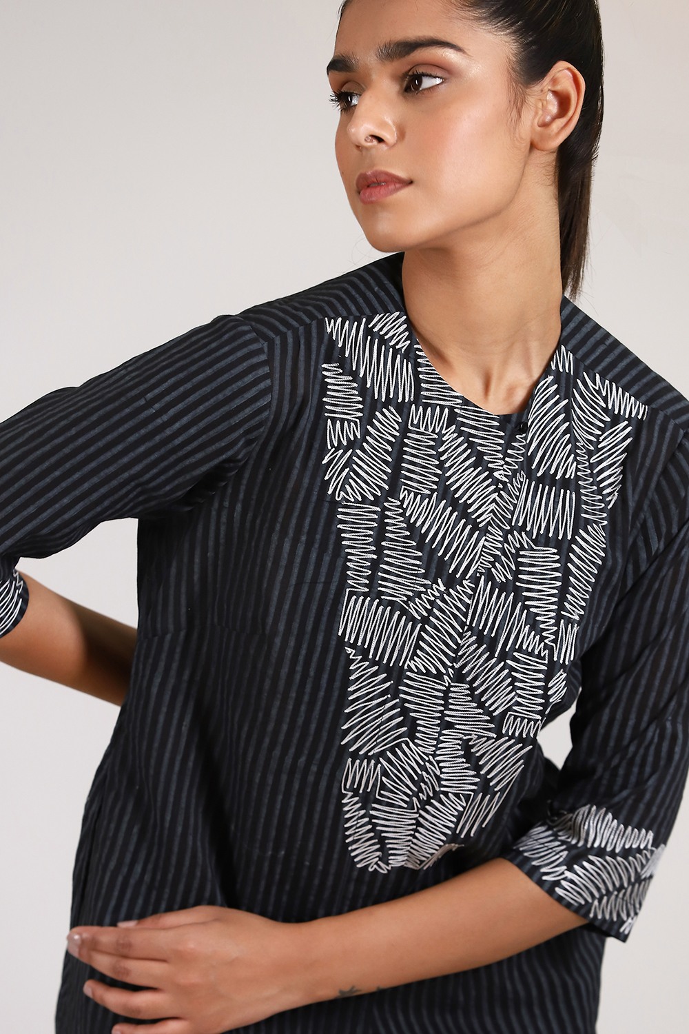 Smart and cool shirt crafted out of soft hand block printed cotton cambric, detailed with scribble ivory aari embroidery on the yoke and cuffs on black self stripe ground. Specially created for your everyday needs and handcrafted with love.