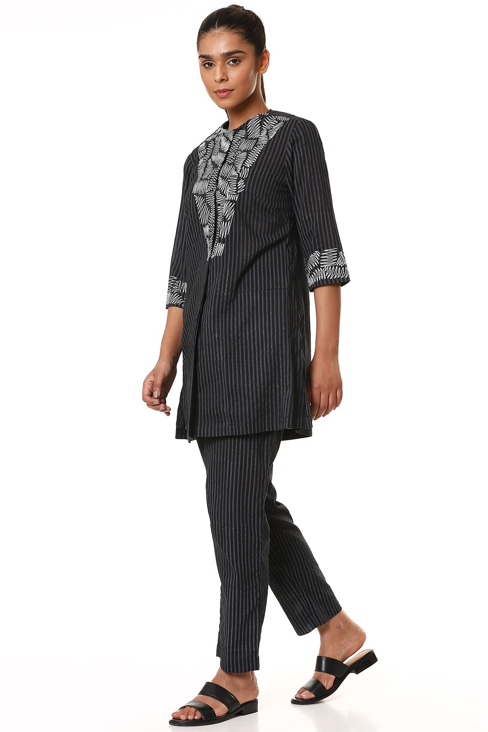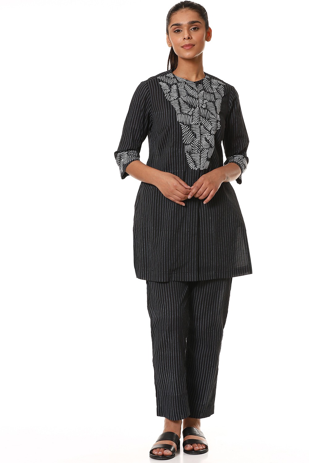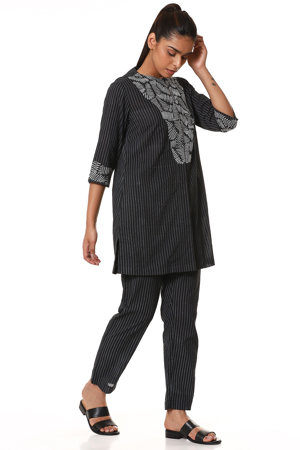 Smart and cool shirt crafted out of soft hand block printed cotton cambric, detailed with scribble ivory aari embroidery on the yoke and cuffs on black self stripe ground. Specially created for your everyday needs and handcrafted with love.