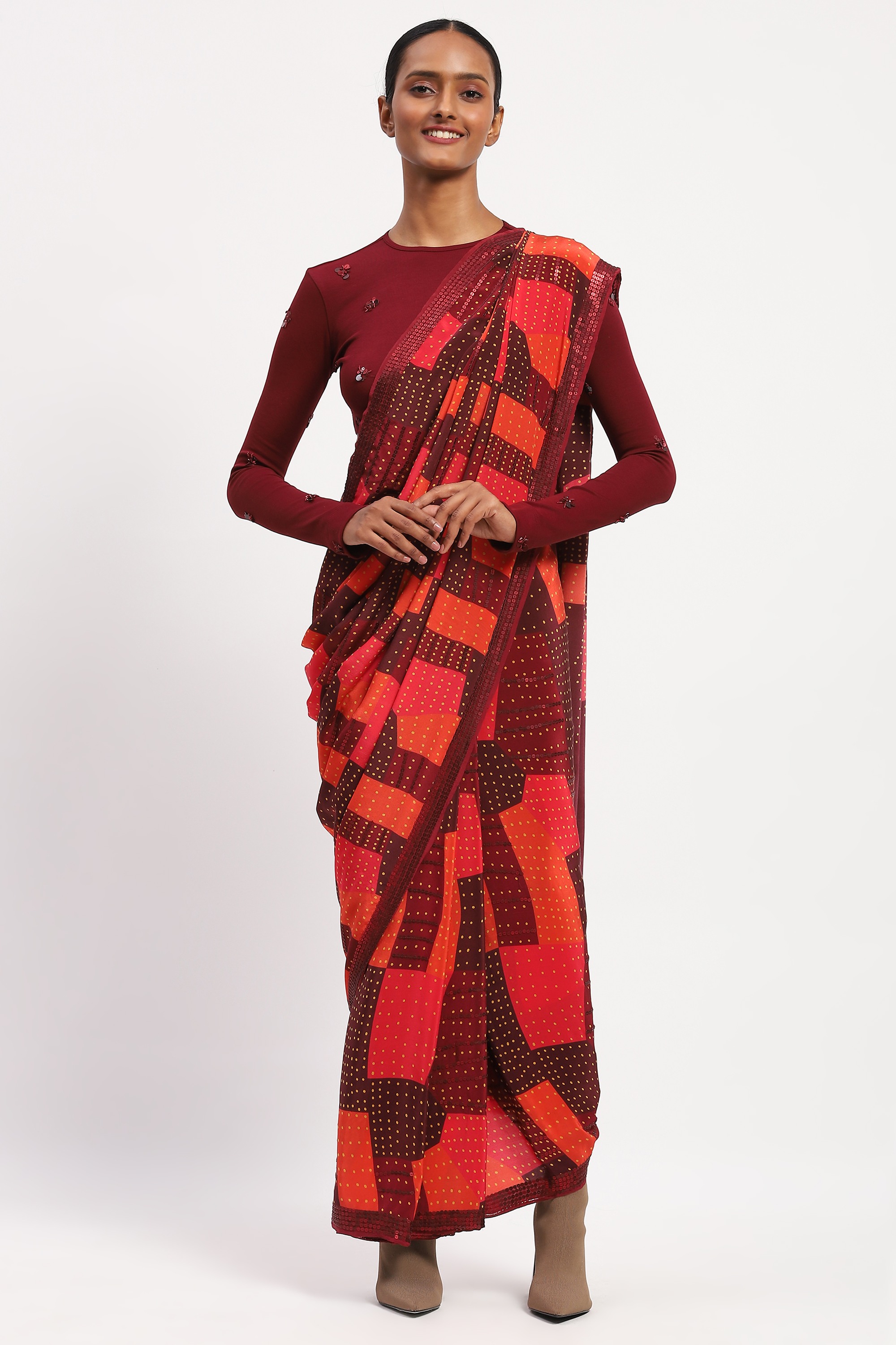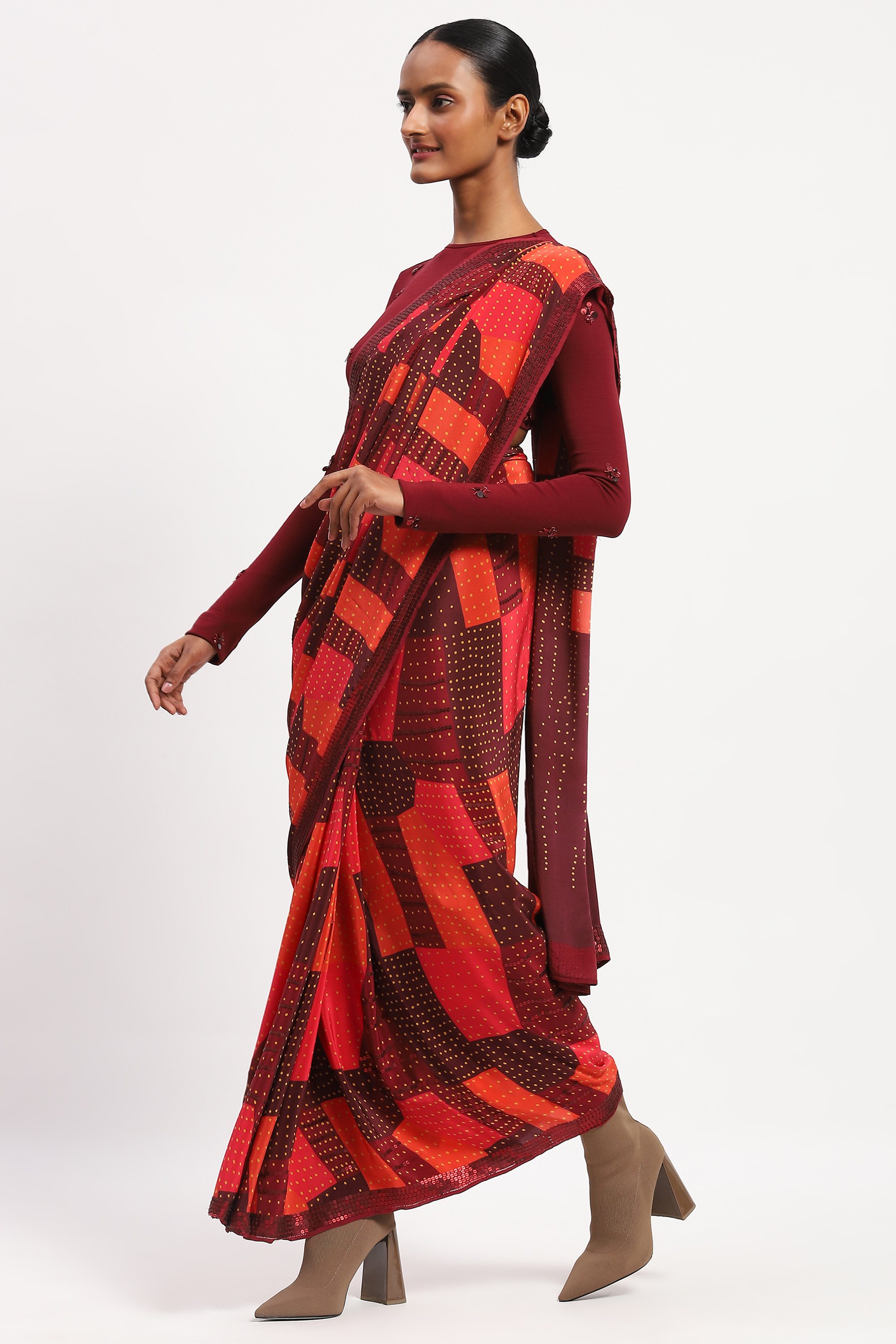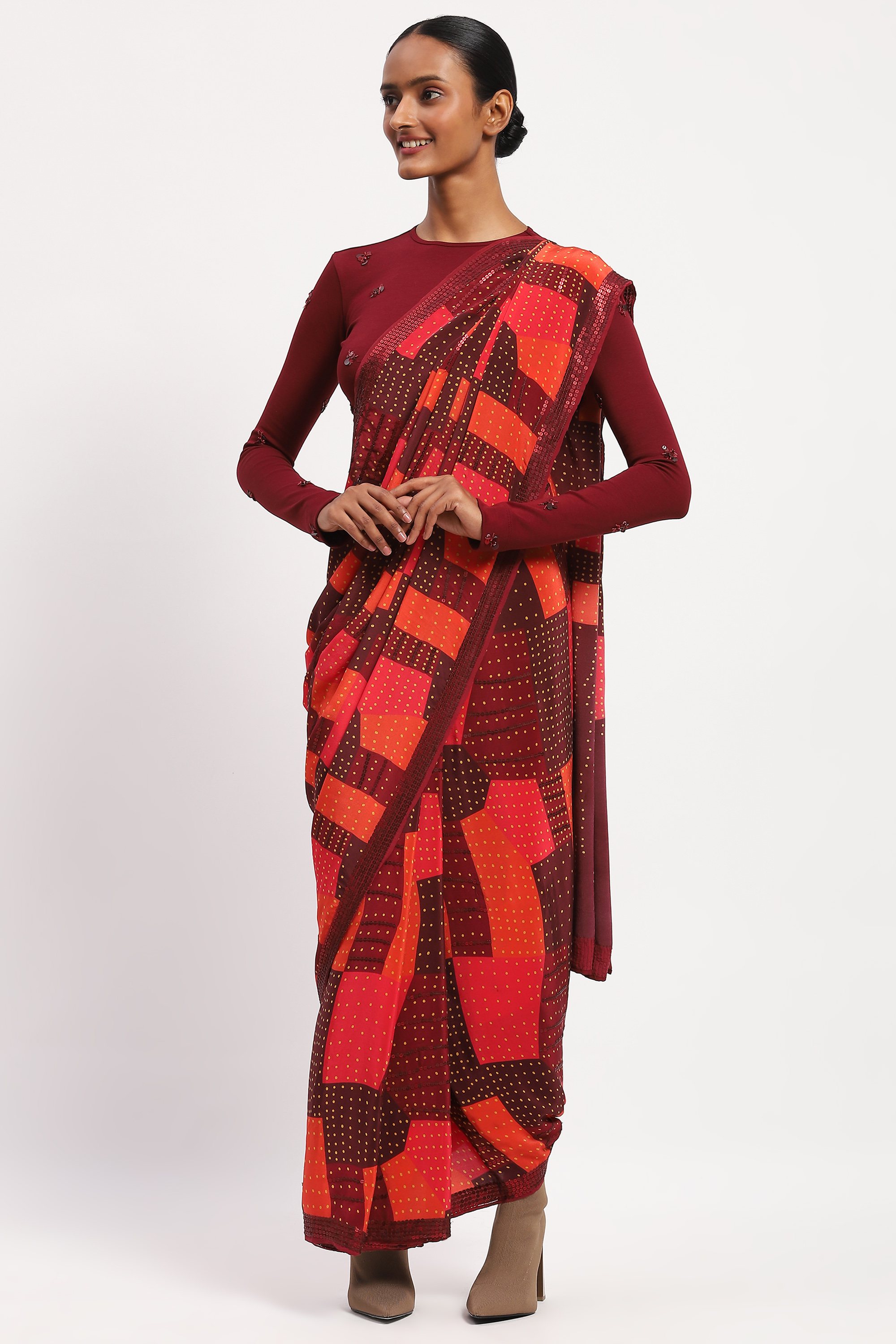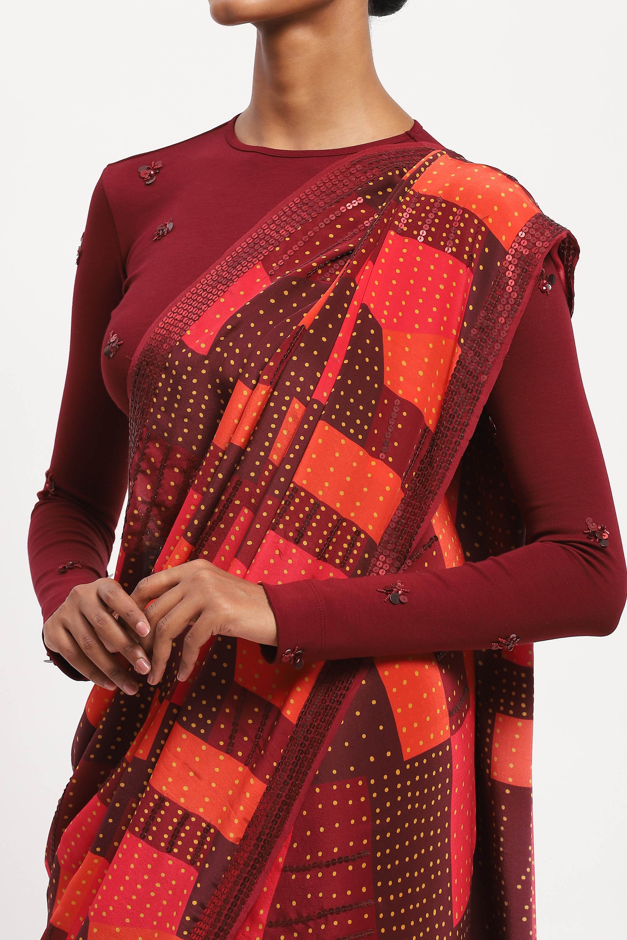 Best paired with a handcrafted playlist, this saree is crafted in soft silk habutai. Its digitally printed pattern is embellished with a grid of sequins.