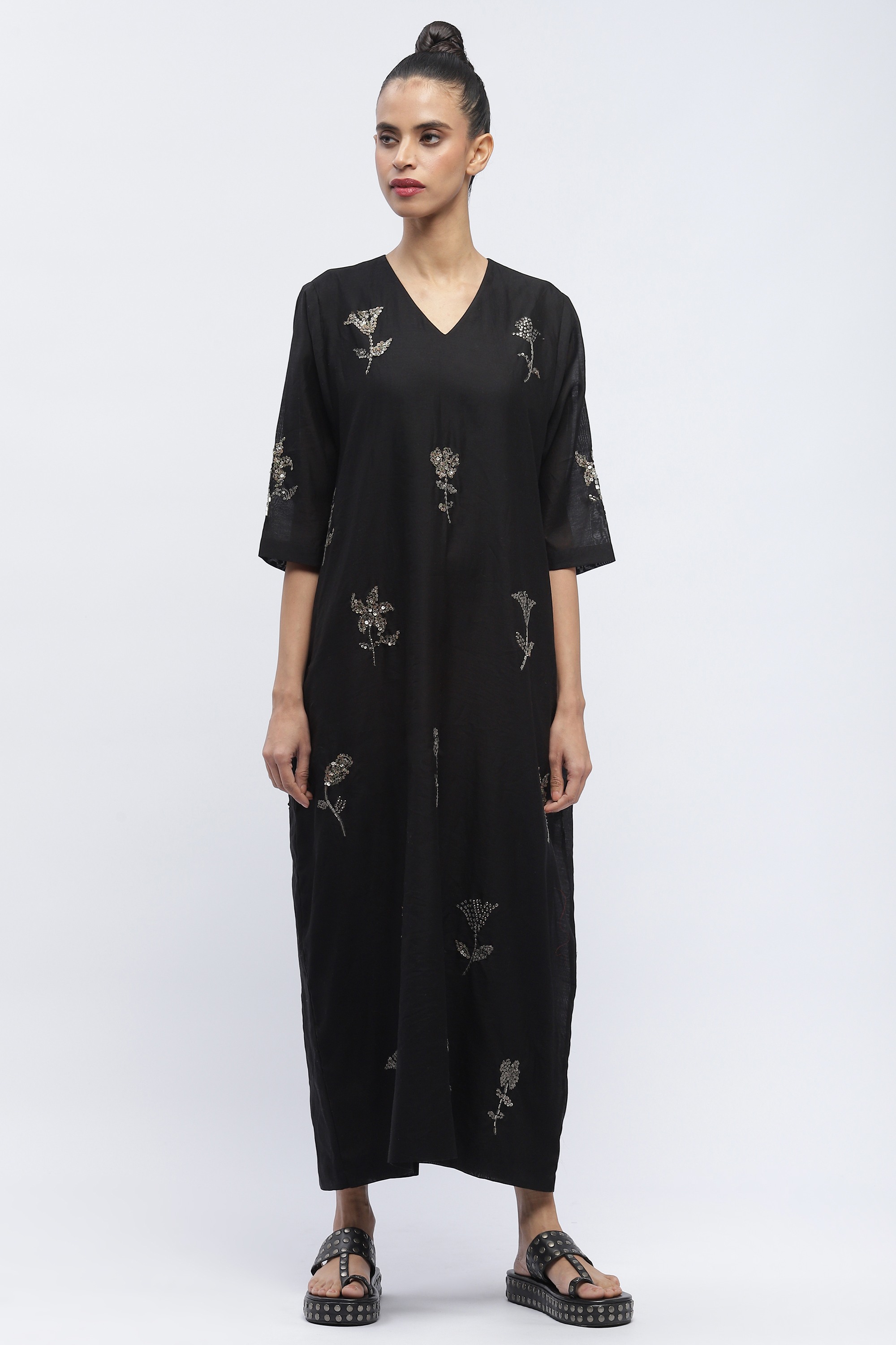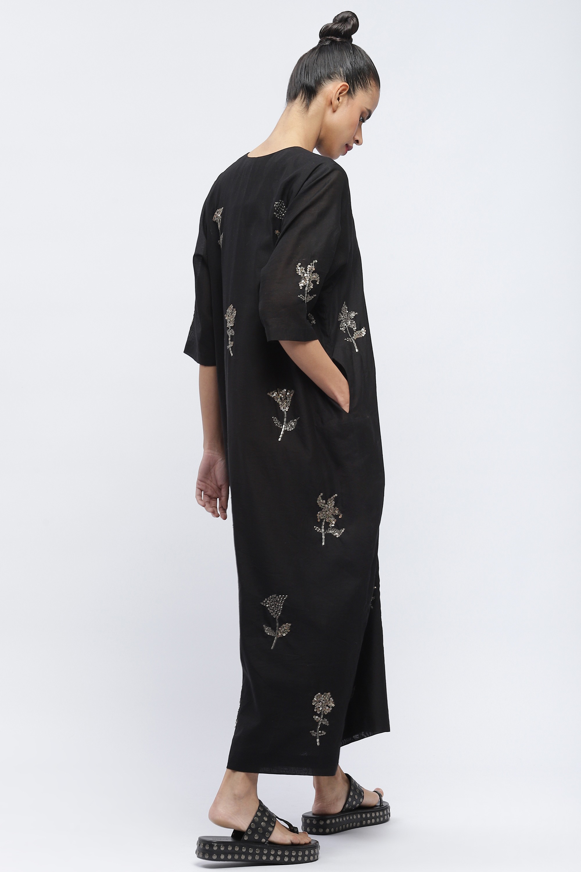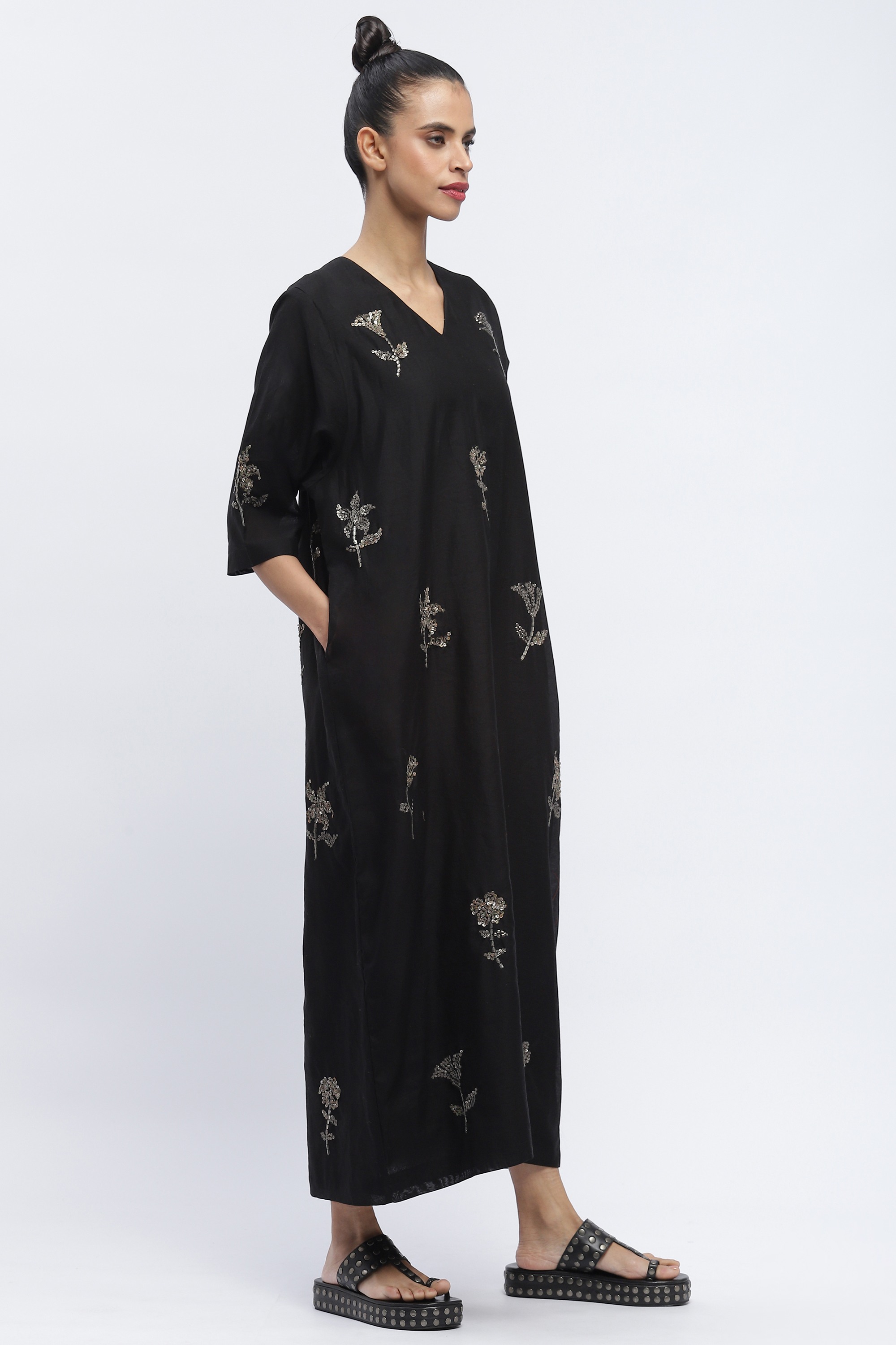 Ideal for an unplanned rendezvous, this black kaftan is crafted in fluid crepe. Buta sequins embroidered in floral patterns evoke reasssurance and warmth.