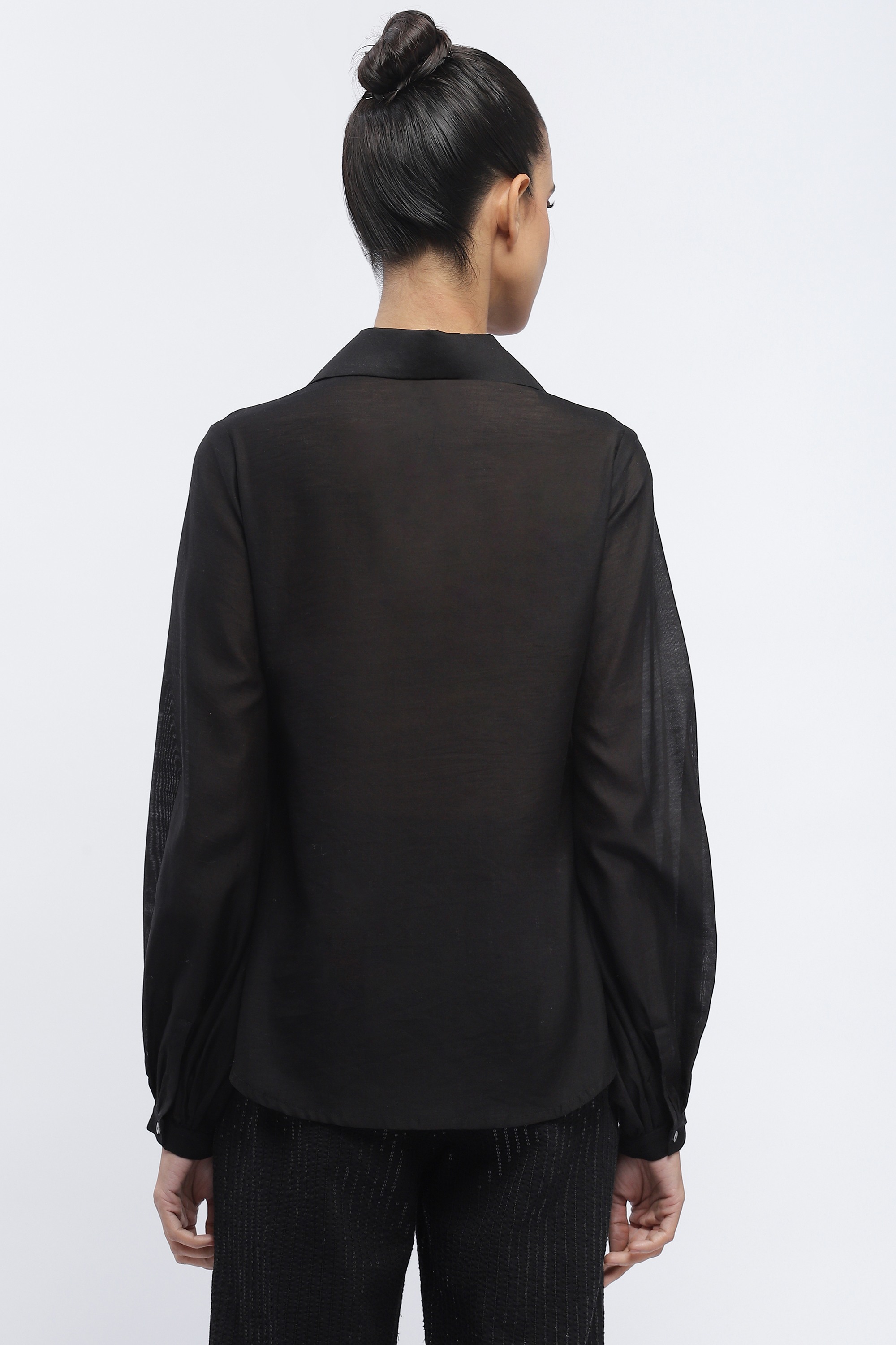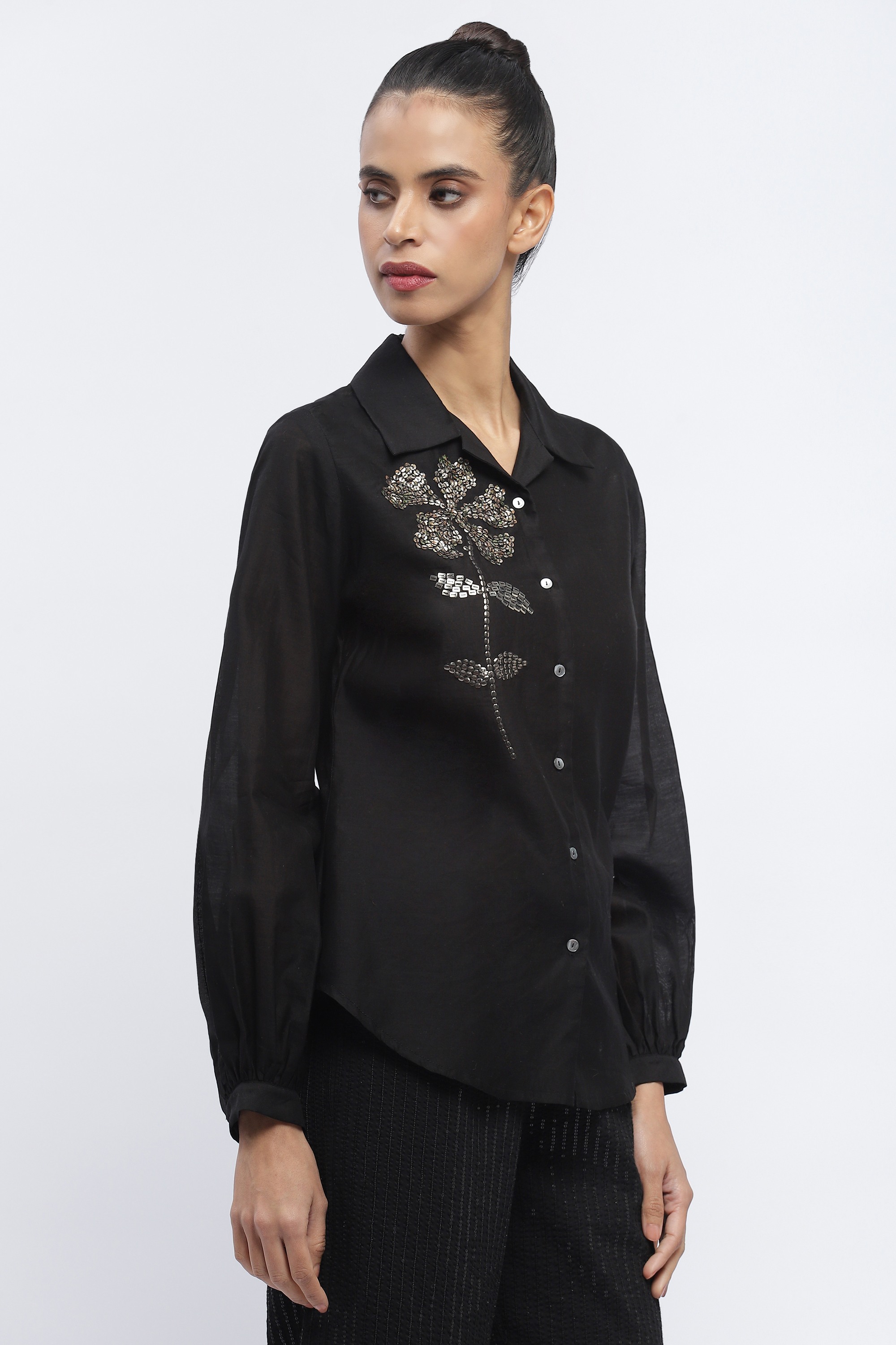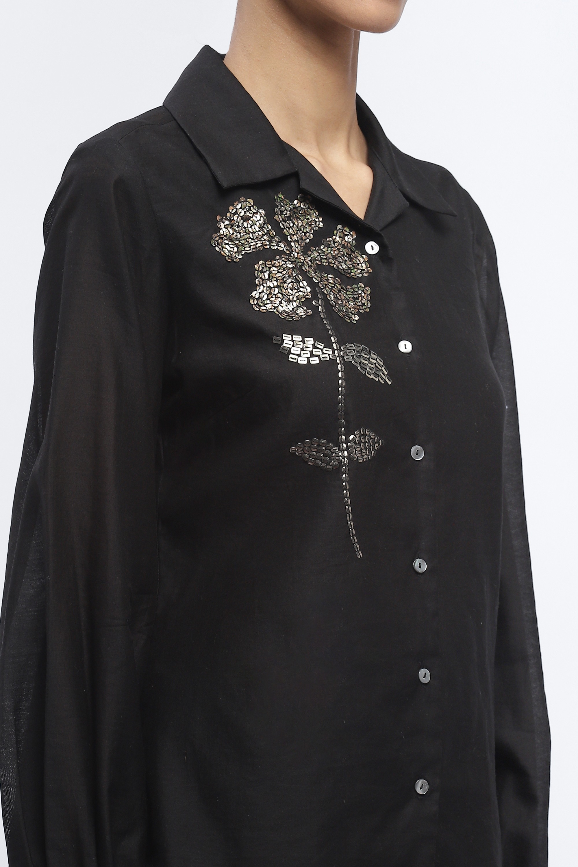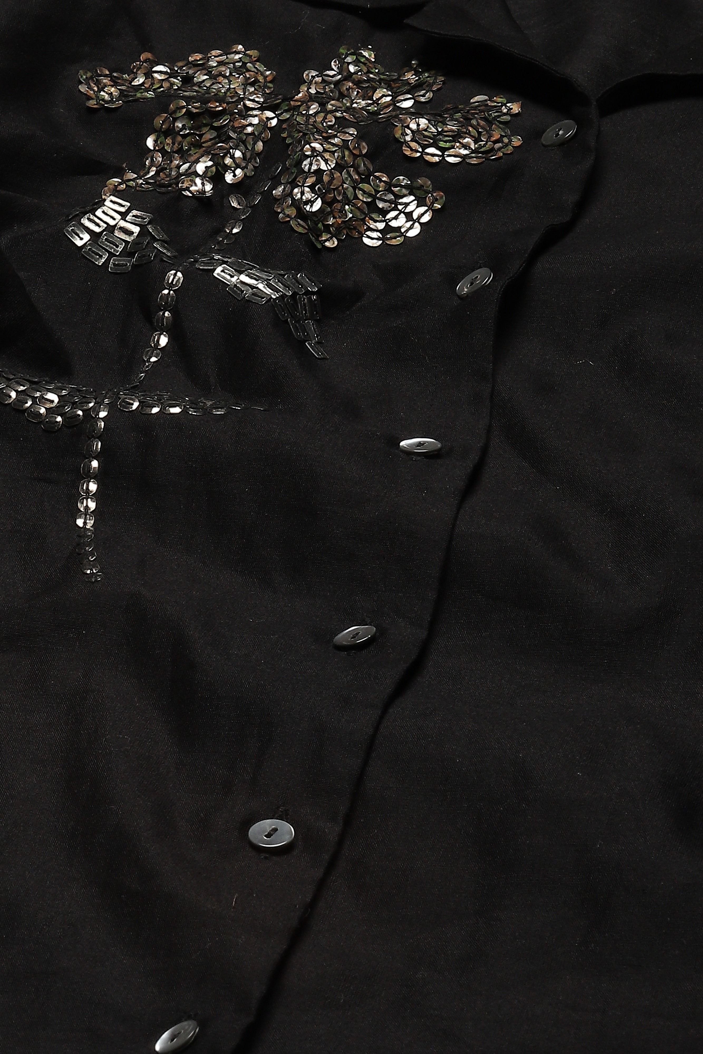 Ideal for an unplanned rendezvous, this black shirt is crafted in fluid chanderi. Buta sequins embroidered in floral patterns evoke reasssurance and warmth.