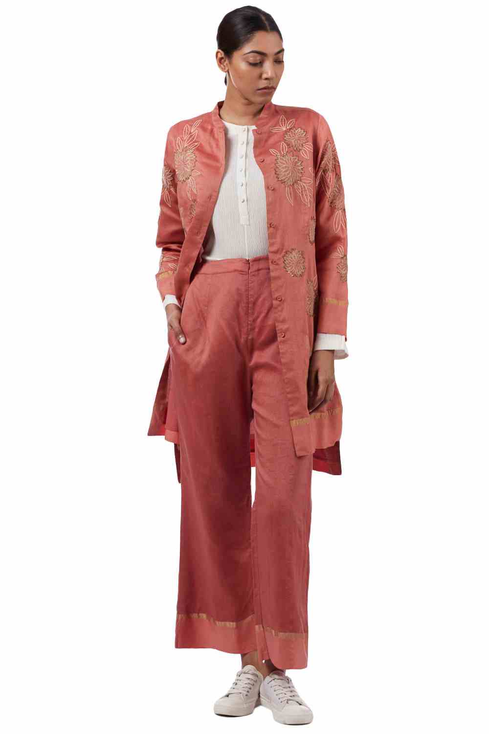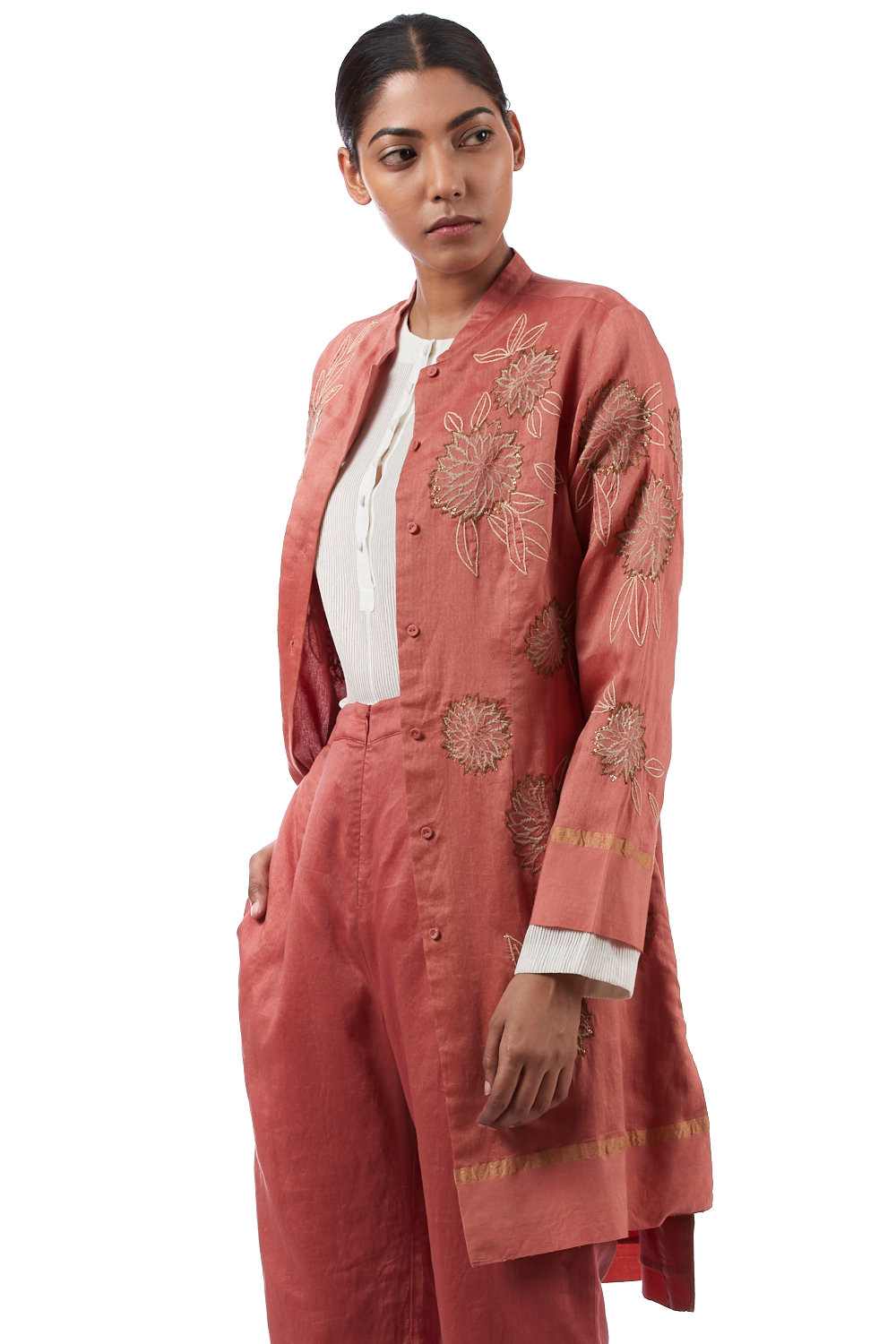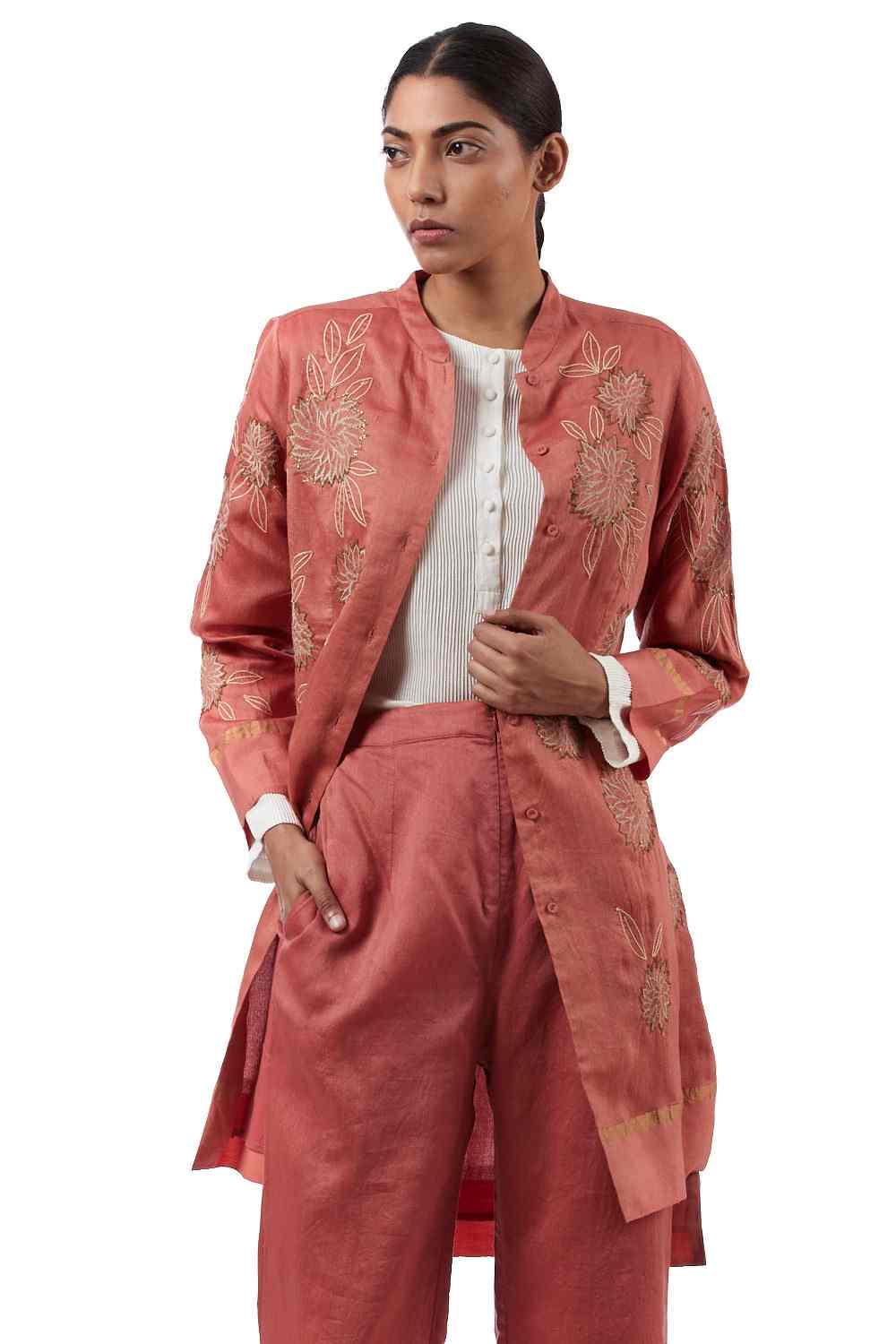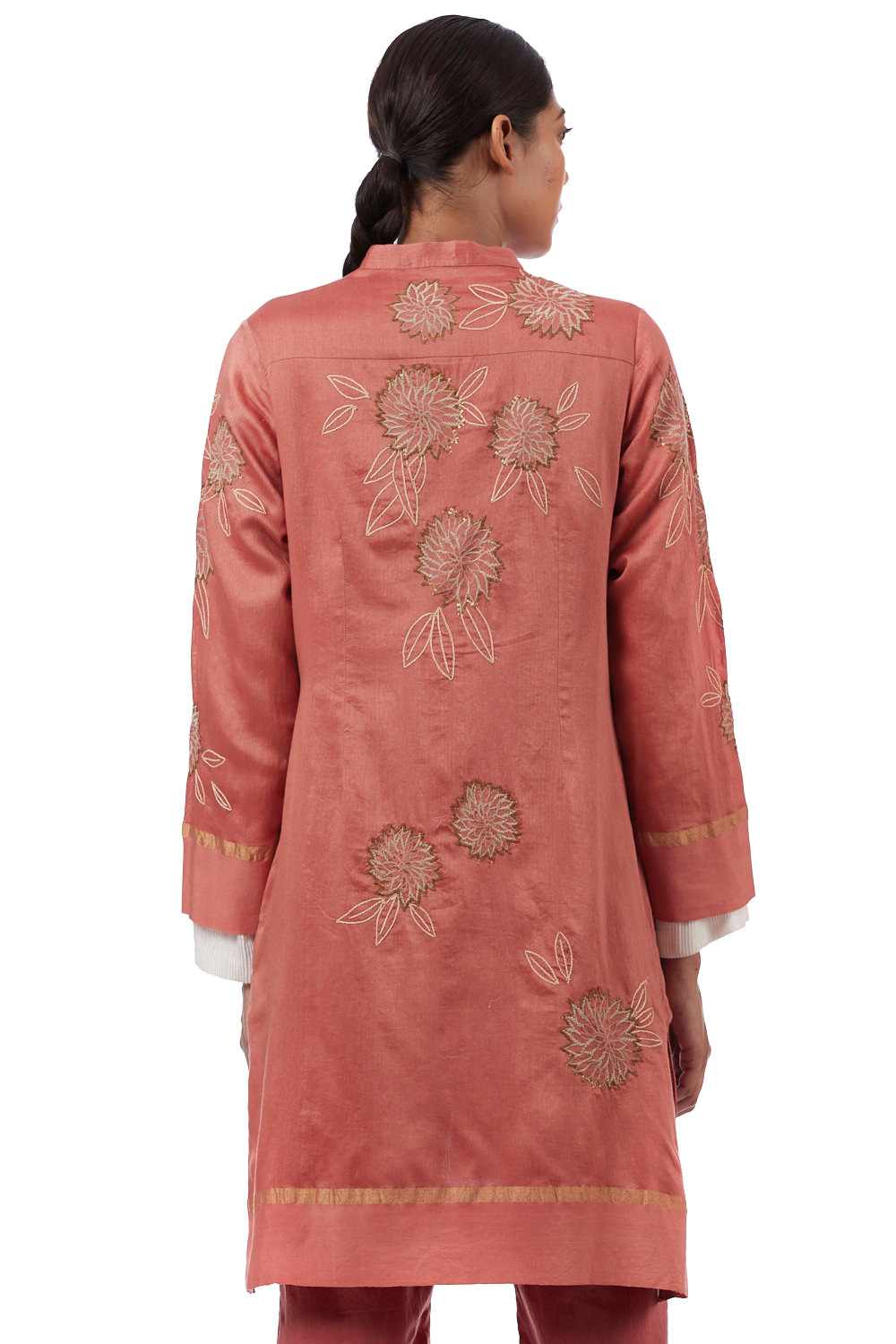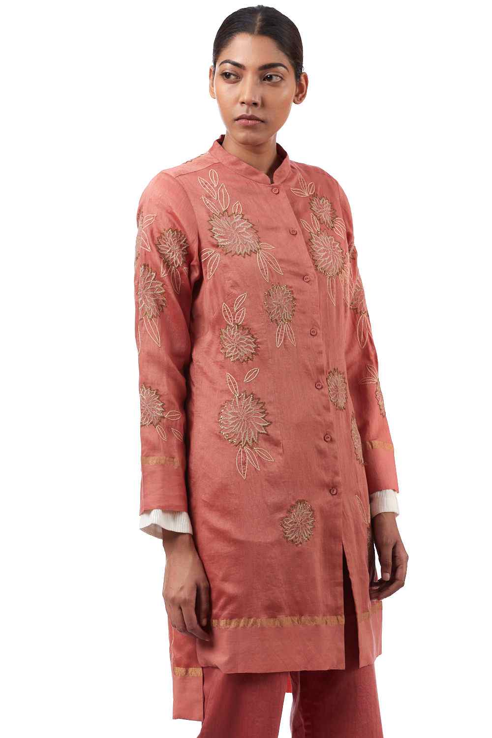 Sequin Embroidered Floral Maheshwar Shirt SALMON