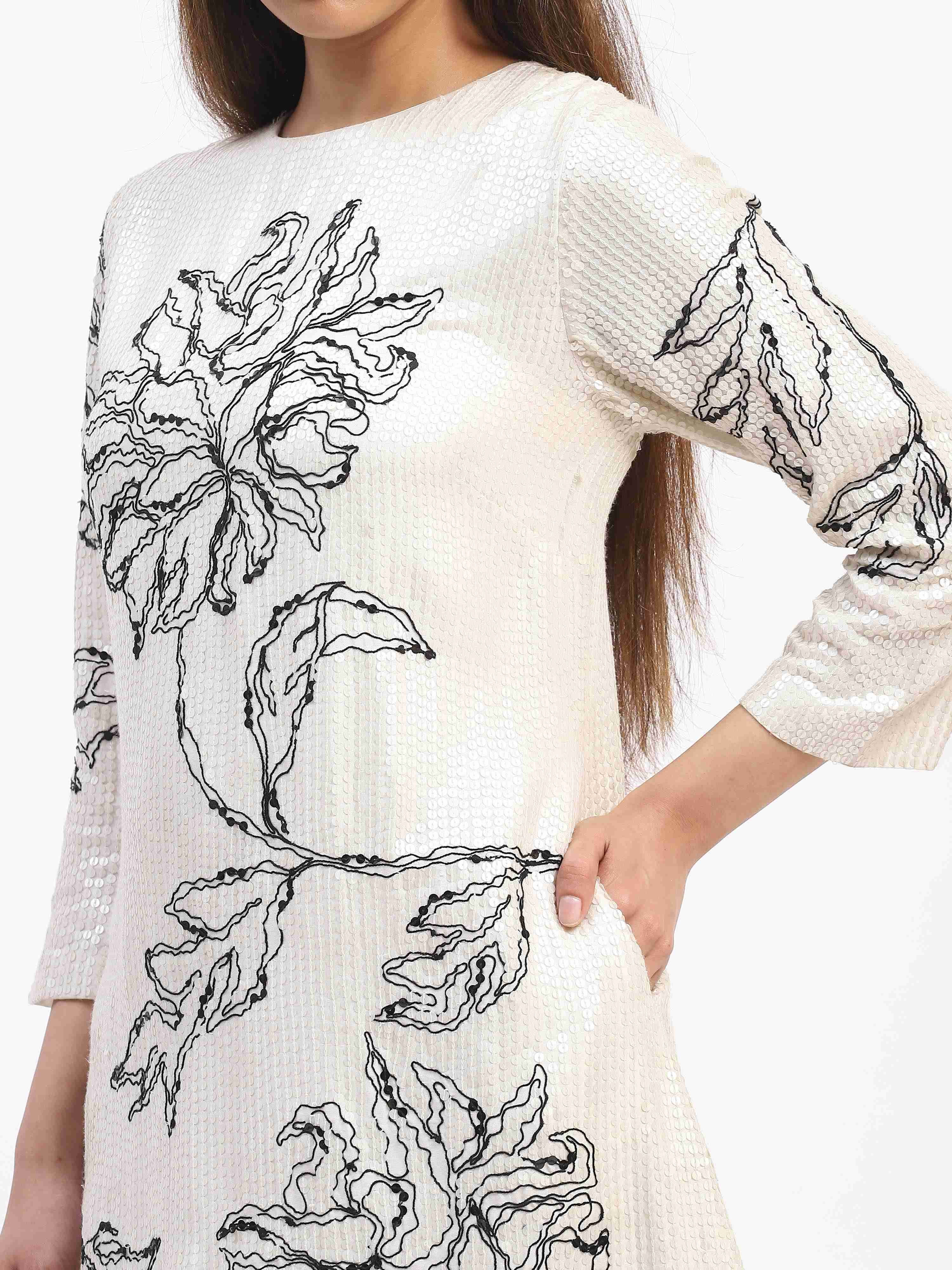This limited edition piece has been made using a crepe fabric base and embellished with a mix of hand done seqiuins and cord embroidery in an oversized floral motifs.