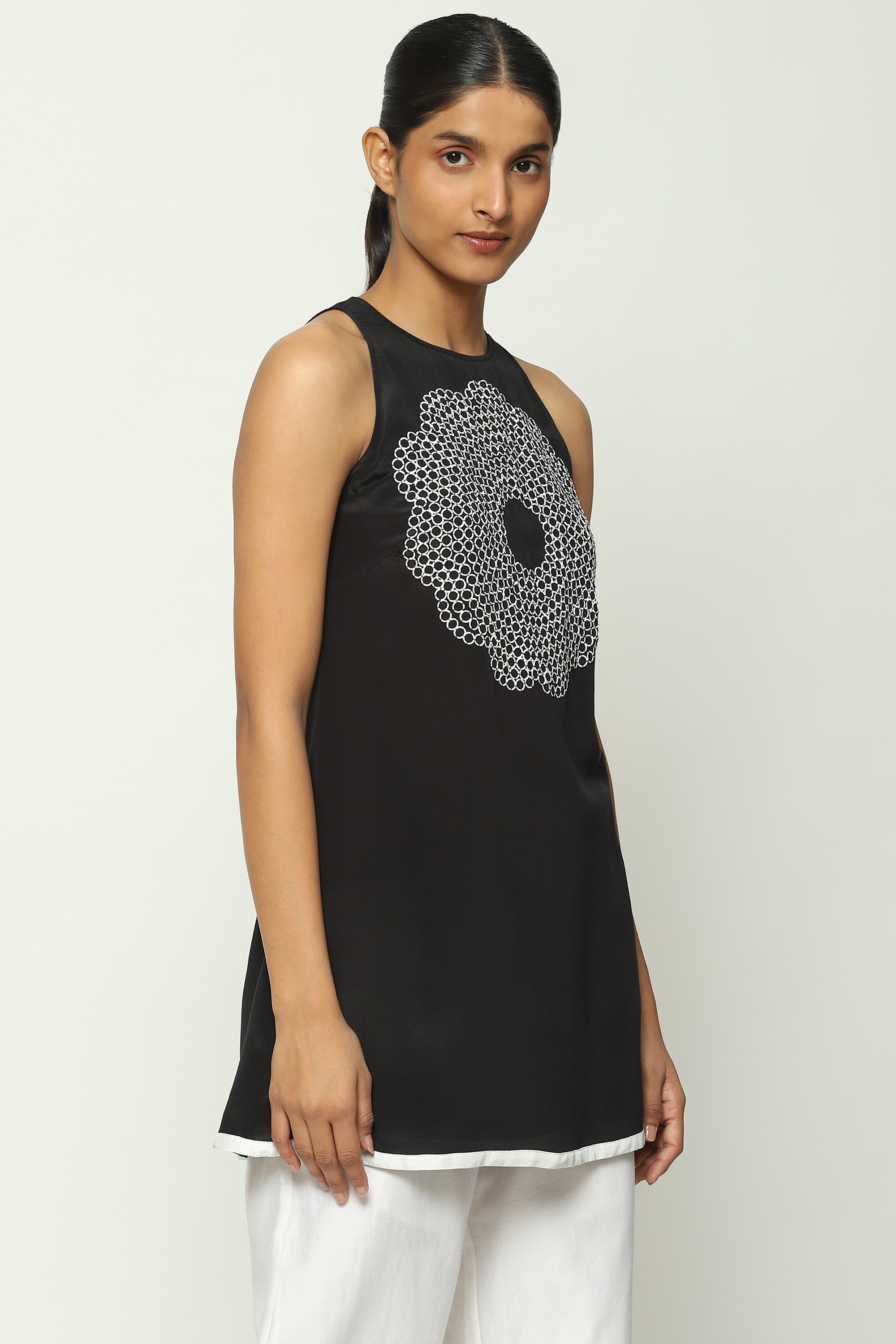 Body Language — the latest edit from Abraham & Thakore — explores humanity's connection with nature. Crafted from semi-sheer crepe de chine. Hand adda is used to embroider the floral motifs.