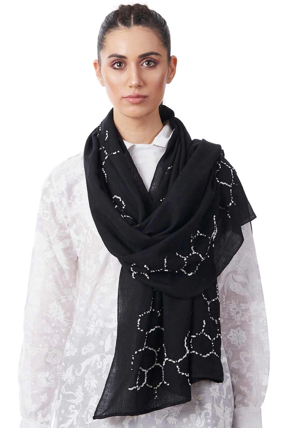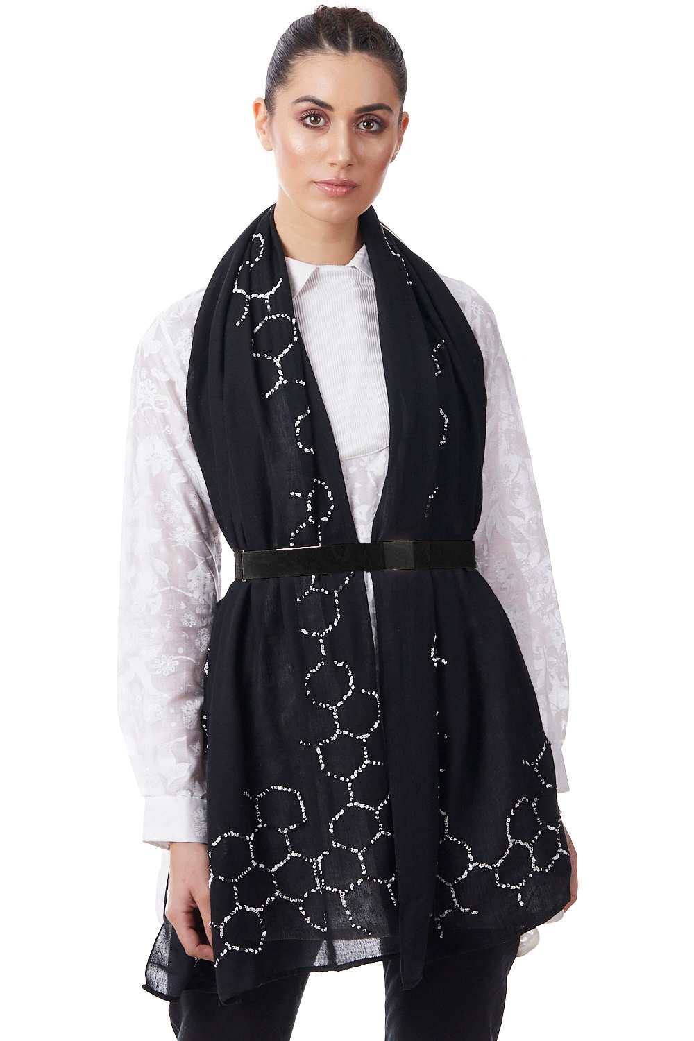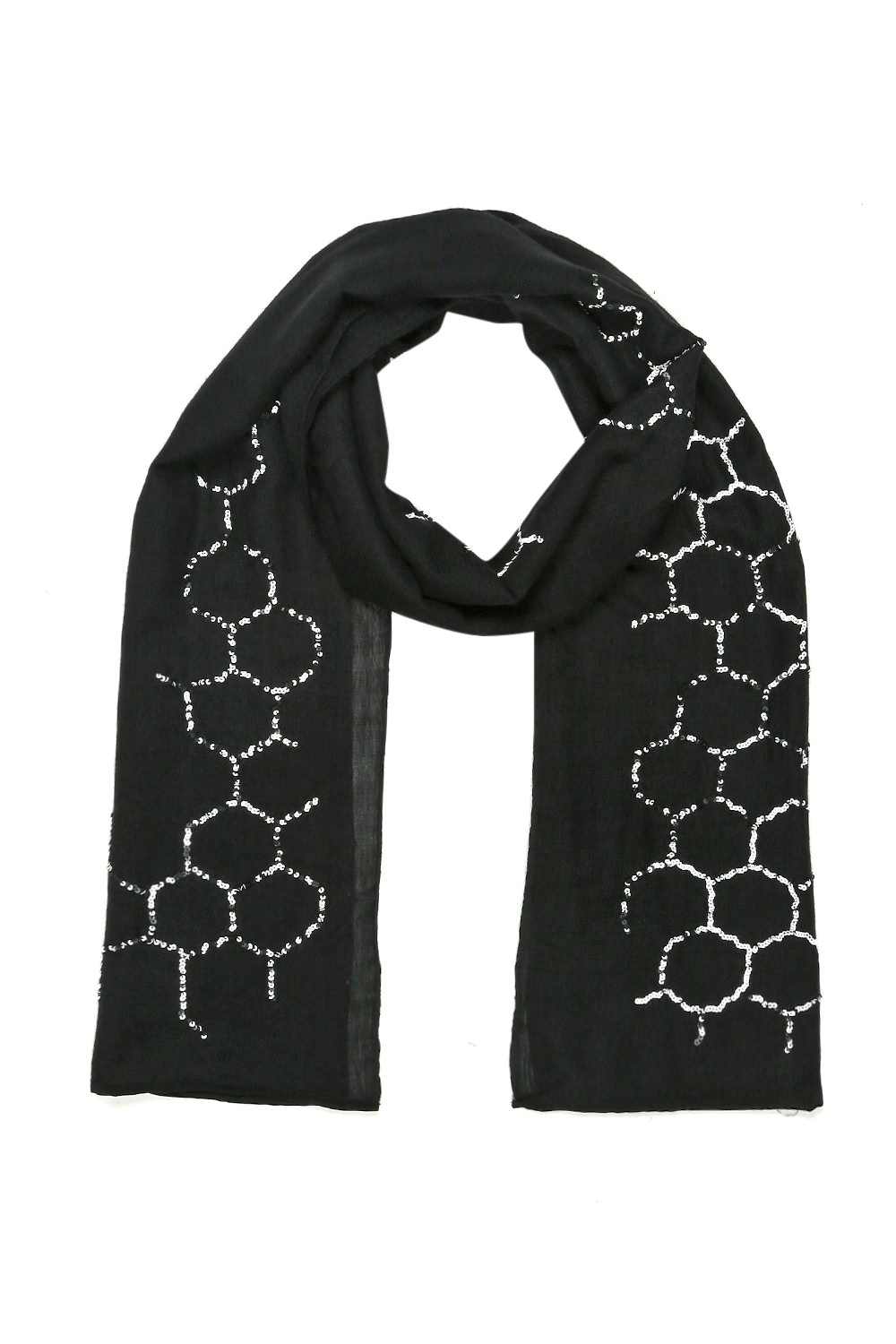 Hand Embroidered Sequinned Silk Wool Geometric Pattern Scarf. Abraham And Thakore Scarves Are Handcrafted And Exclusively Designed, Produced In Very Limited Editions. Up Your Style Game By Pairing Our New Scarf Styles And Refreshed Classics In Infinite Ways.