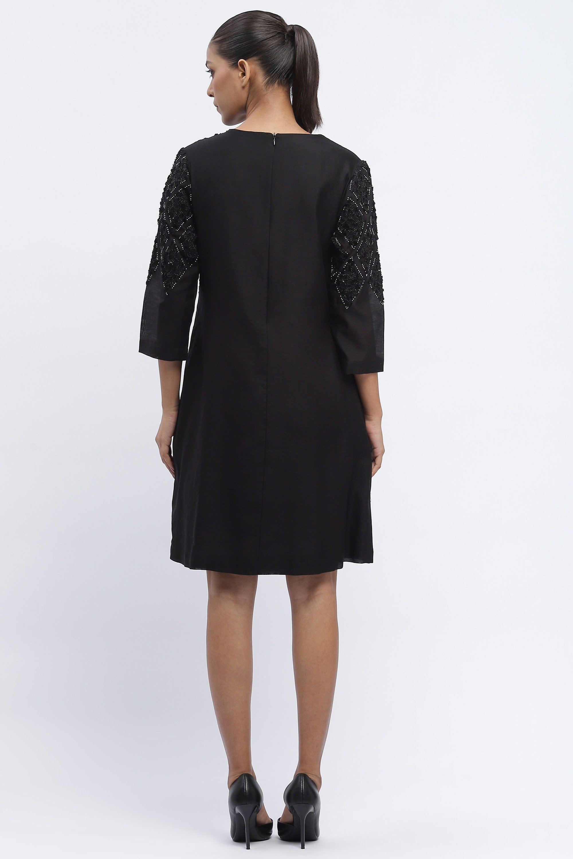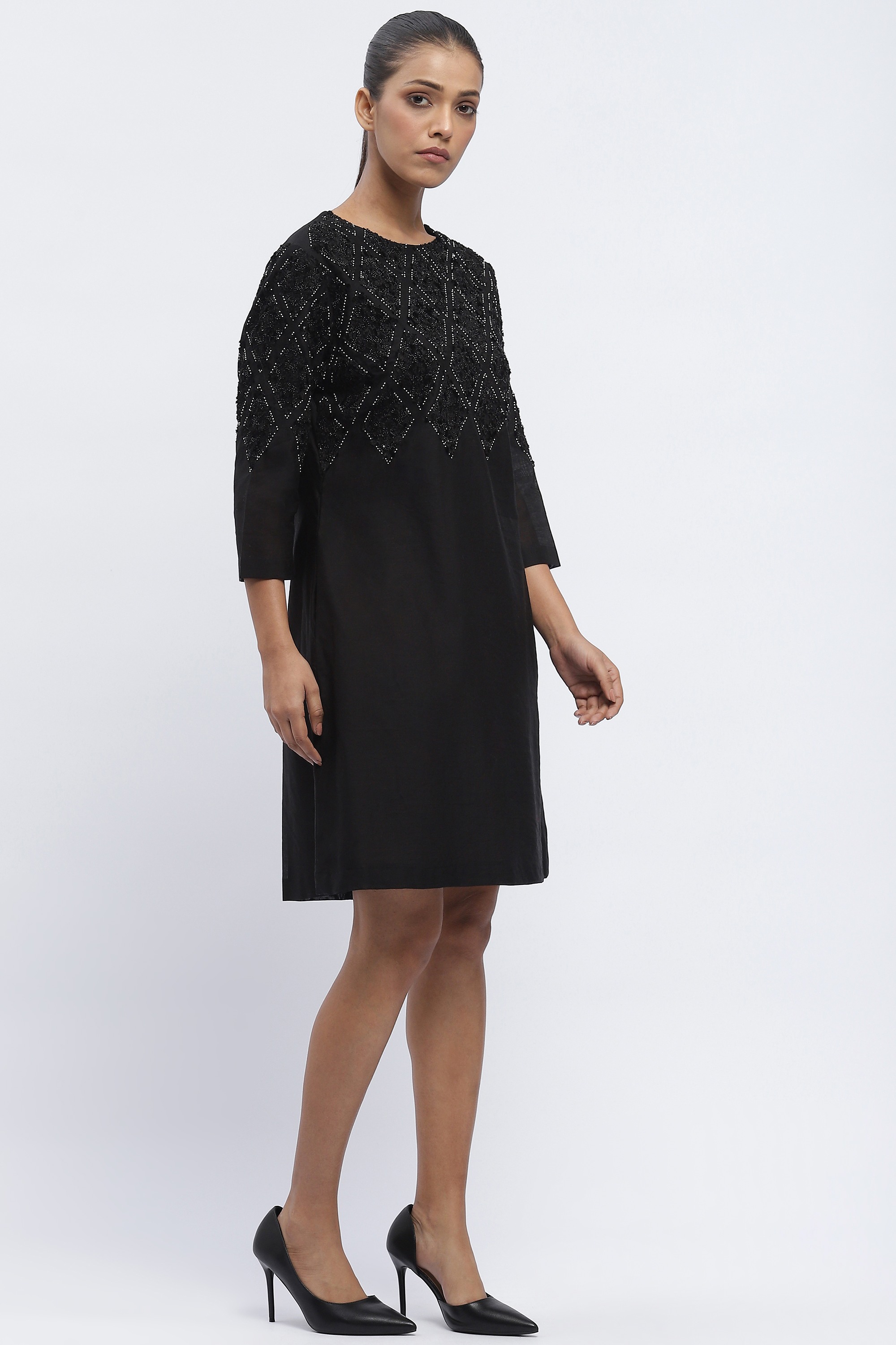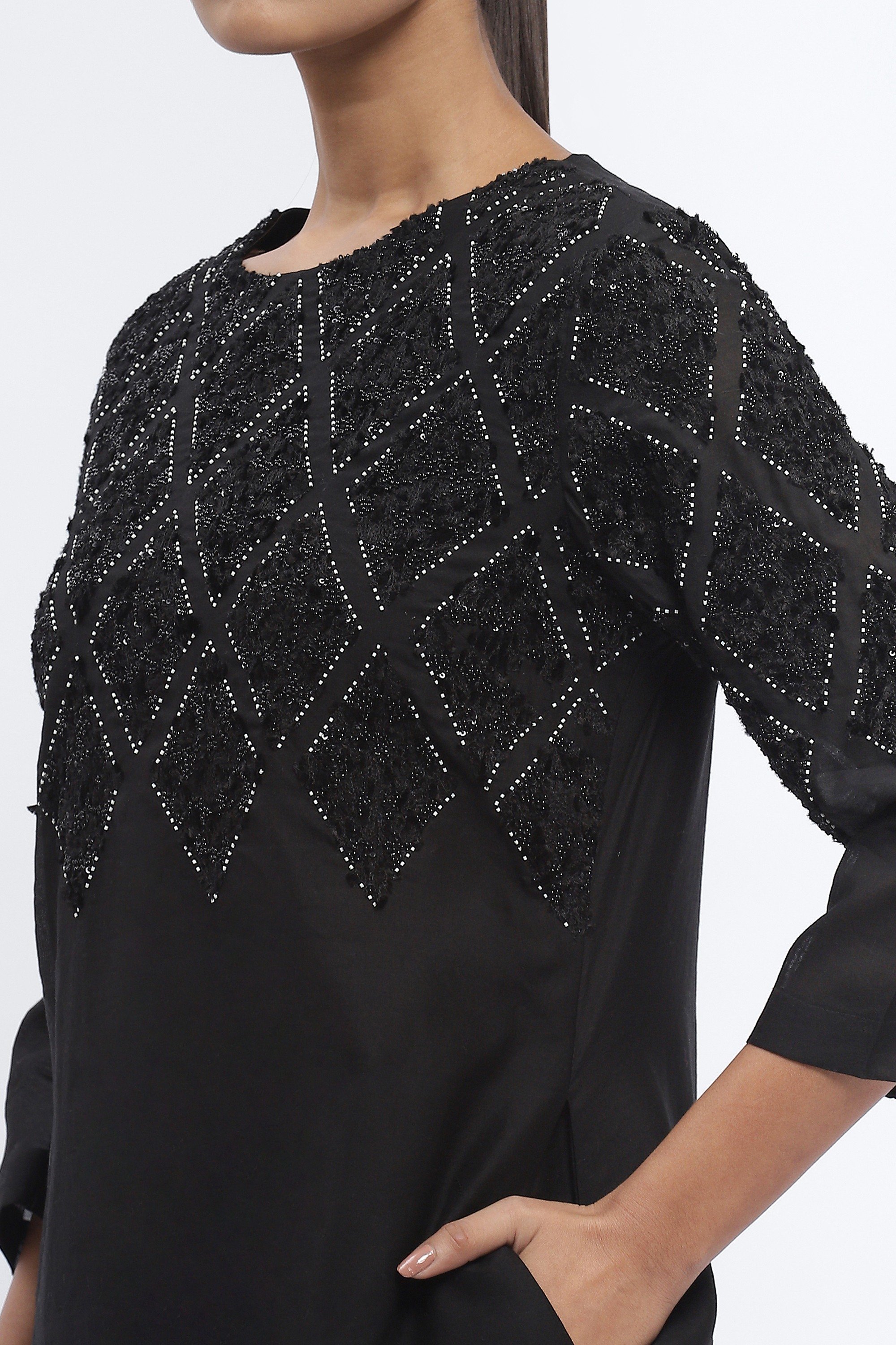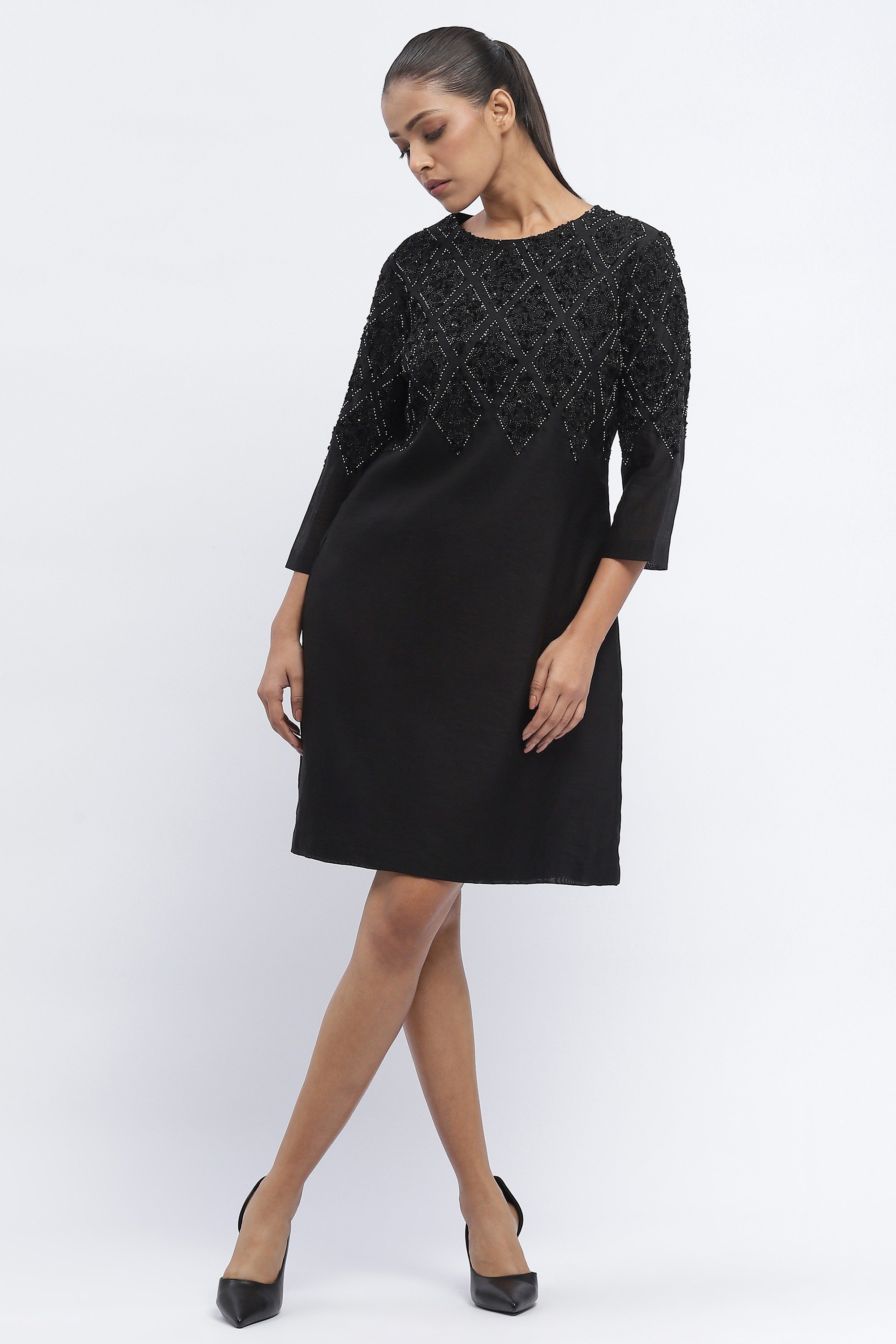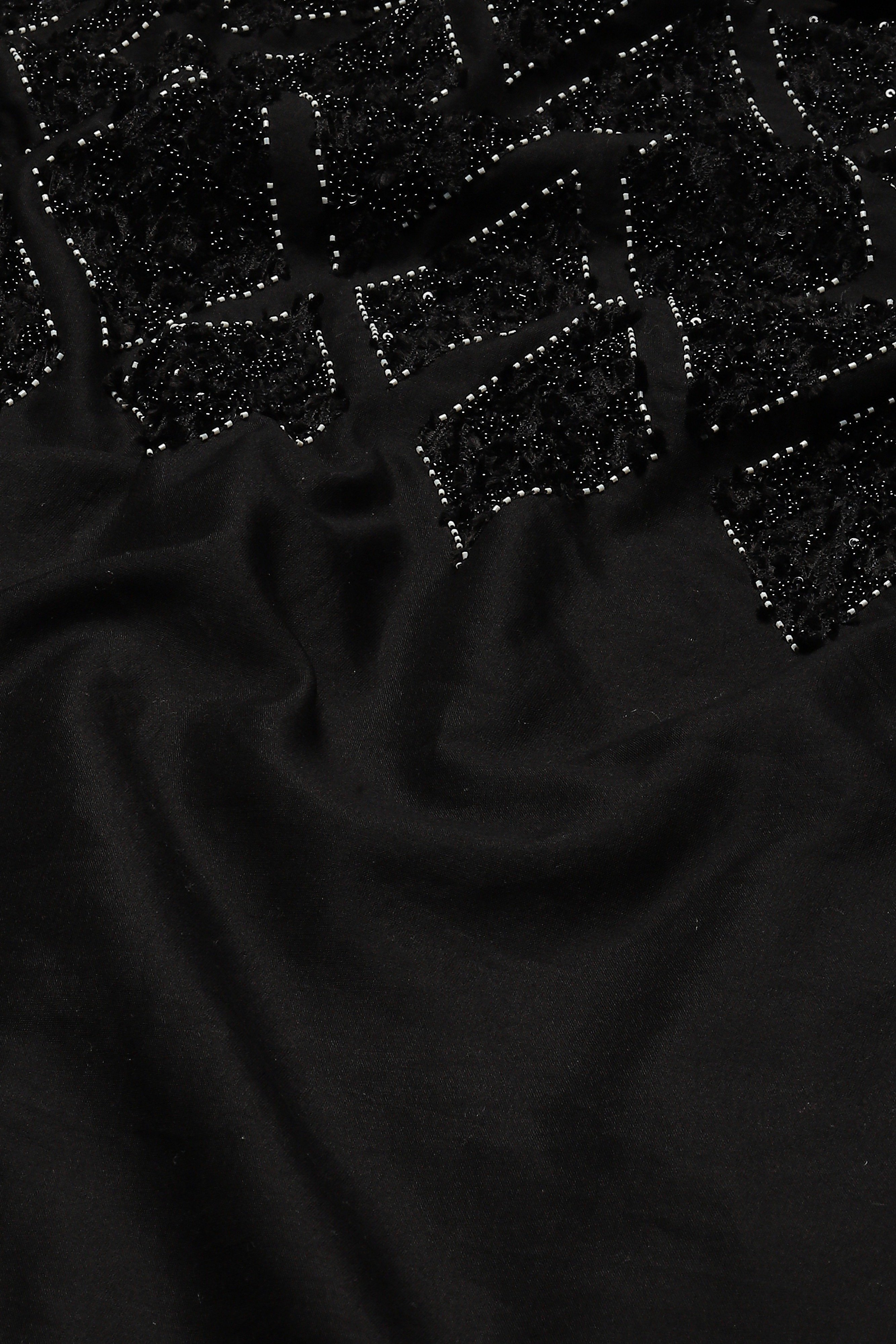 Best paired with mischief, this black dress is crafted in fluid chanderi. Sequins embroidered in harlequin patterns evoke roguish delight.