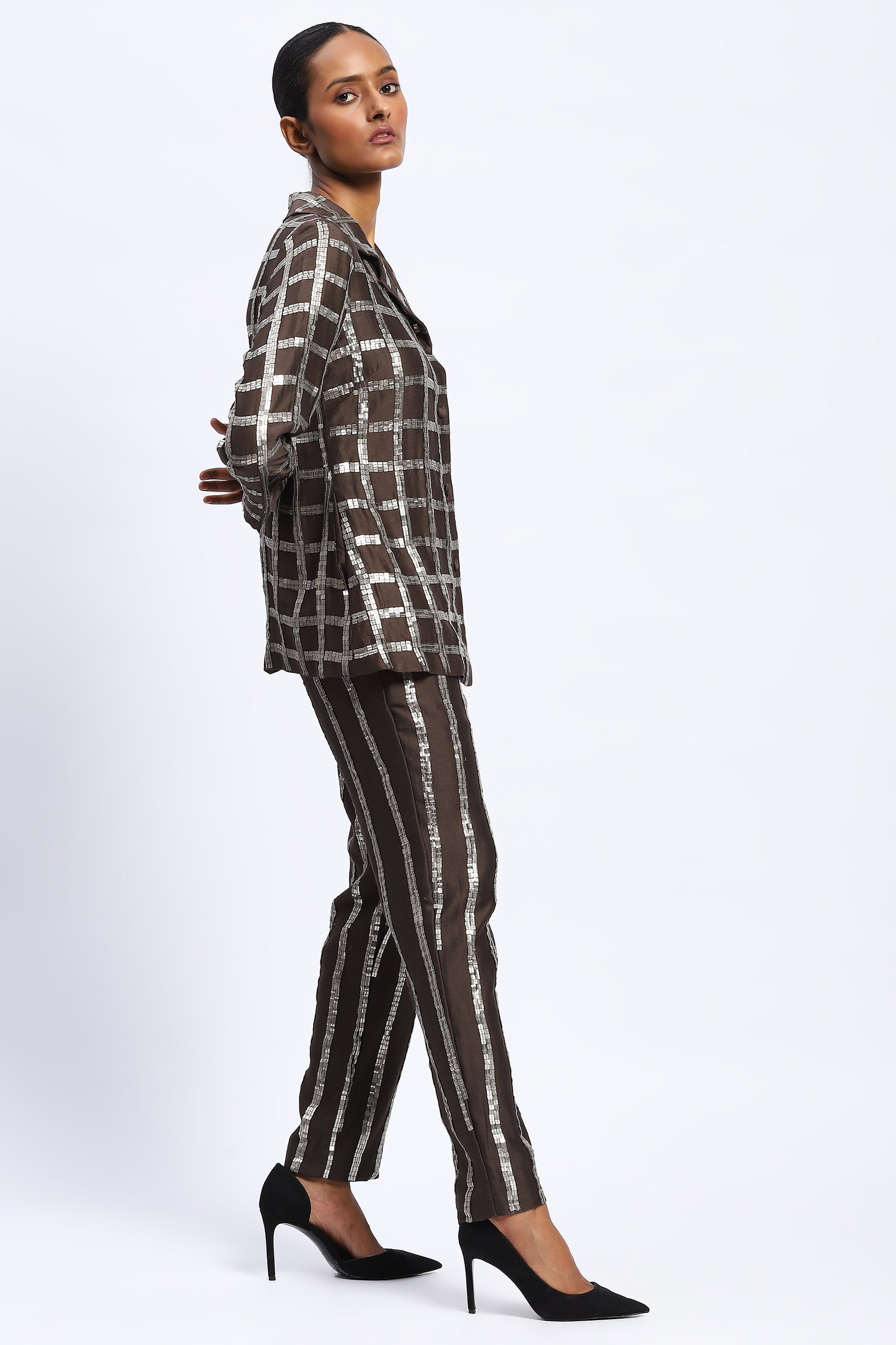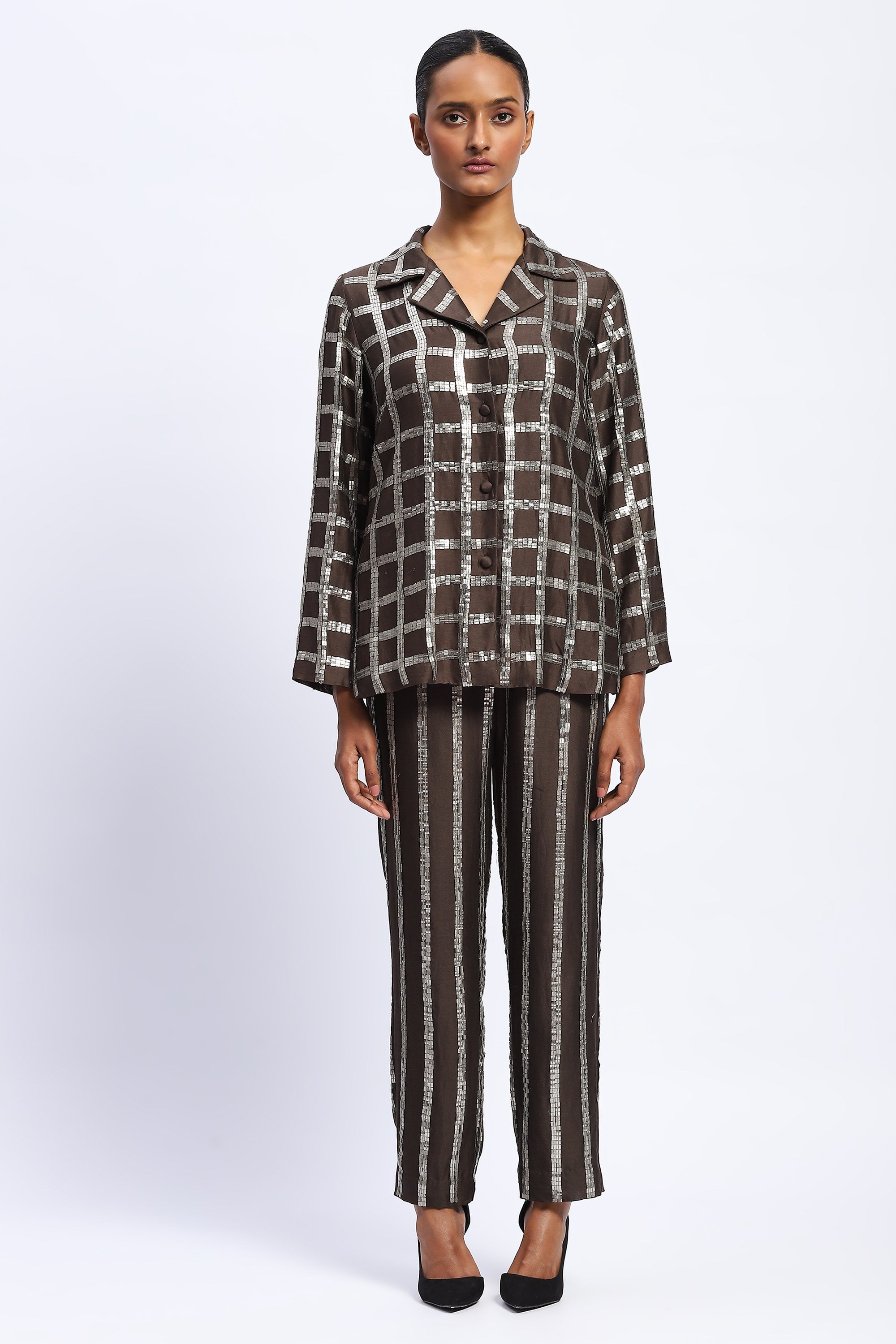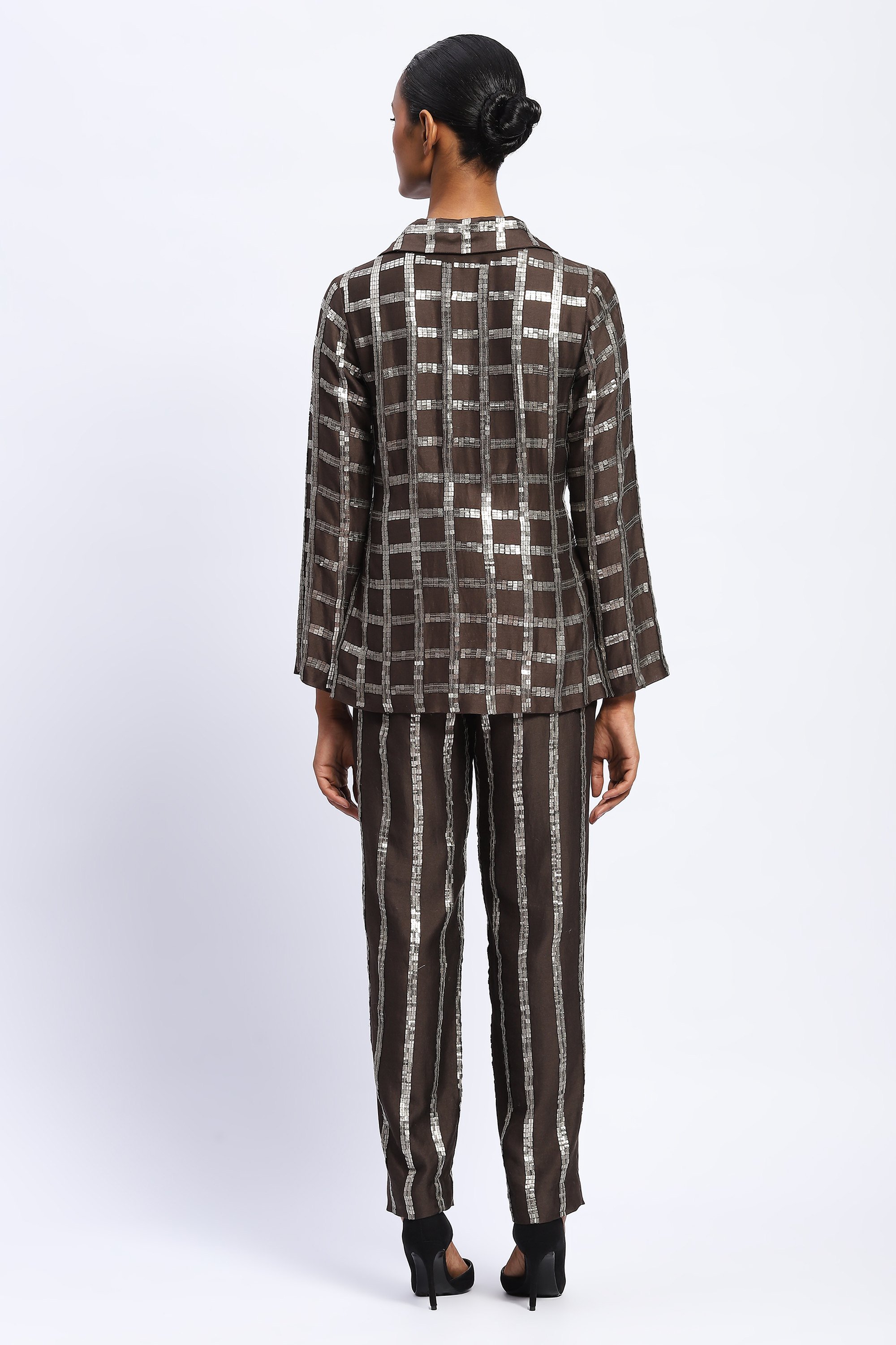 This limited edition piece has been made using fine silk x cotton fabric embellished with sequins in a modern graphic windowpane check pattern.