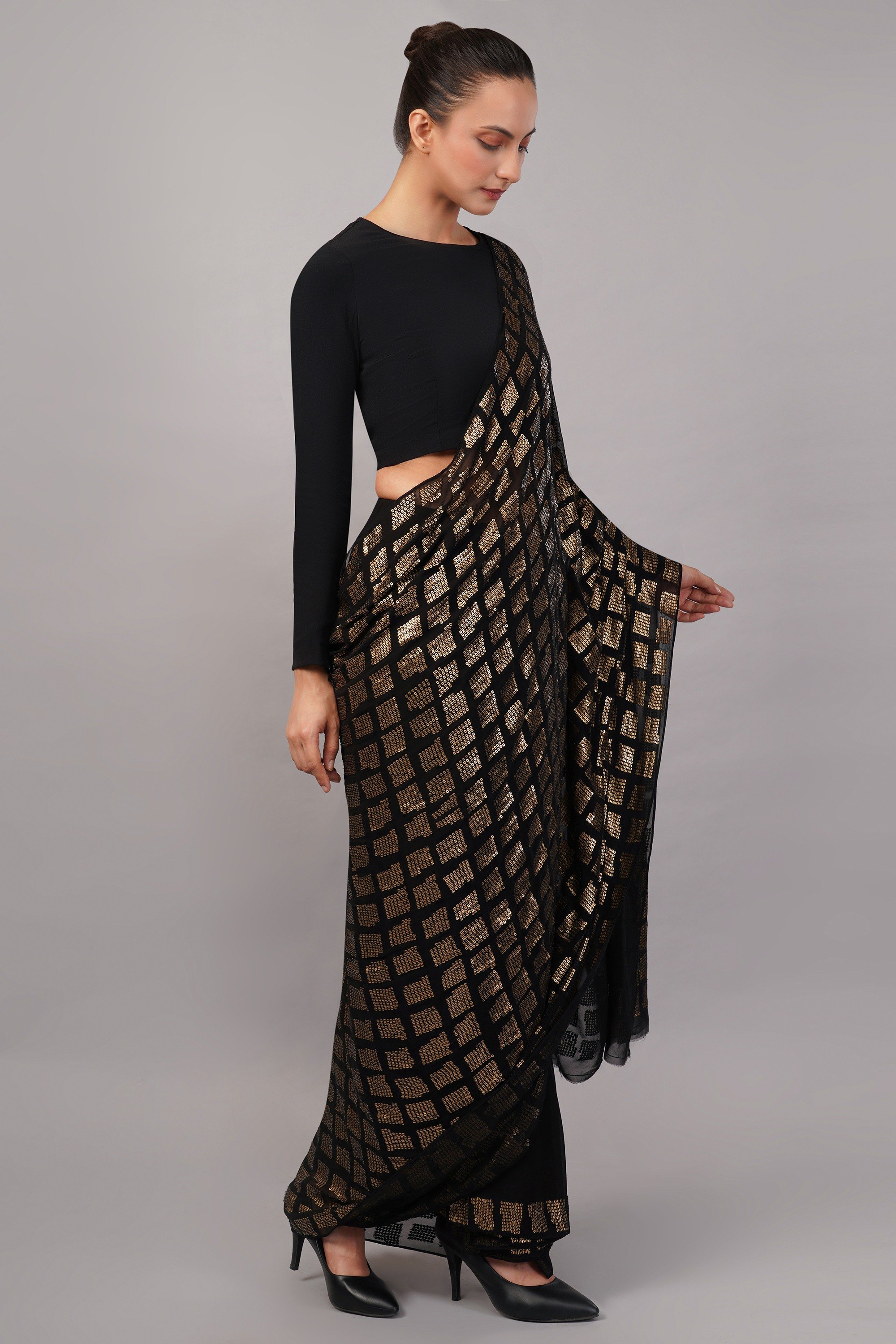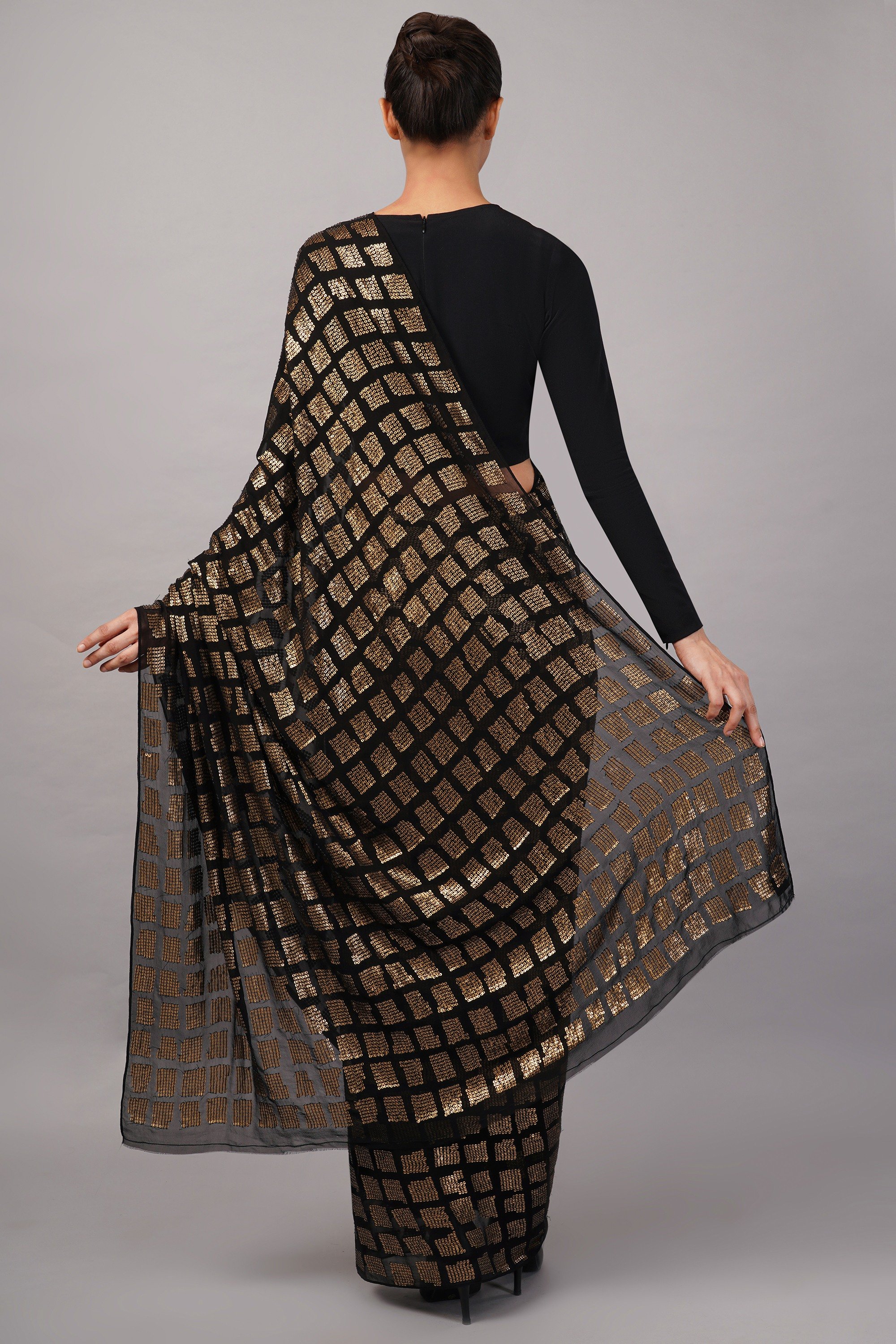 This limited edition saree has been made using a georgette fabric which has been hand embroidered with an allover sequinned mosiac pattern. Ideal for adding sparkle to any evening occasion.