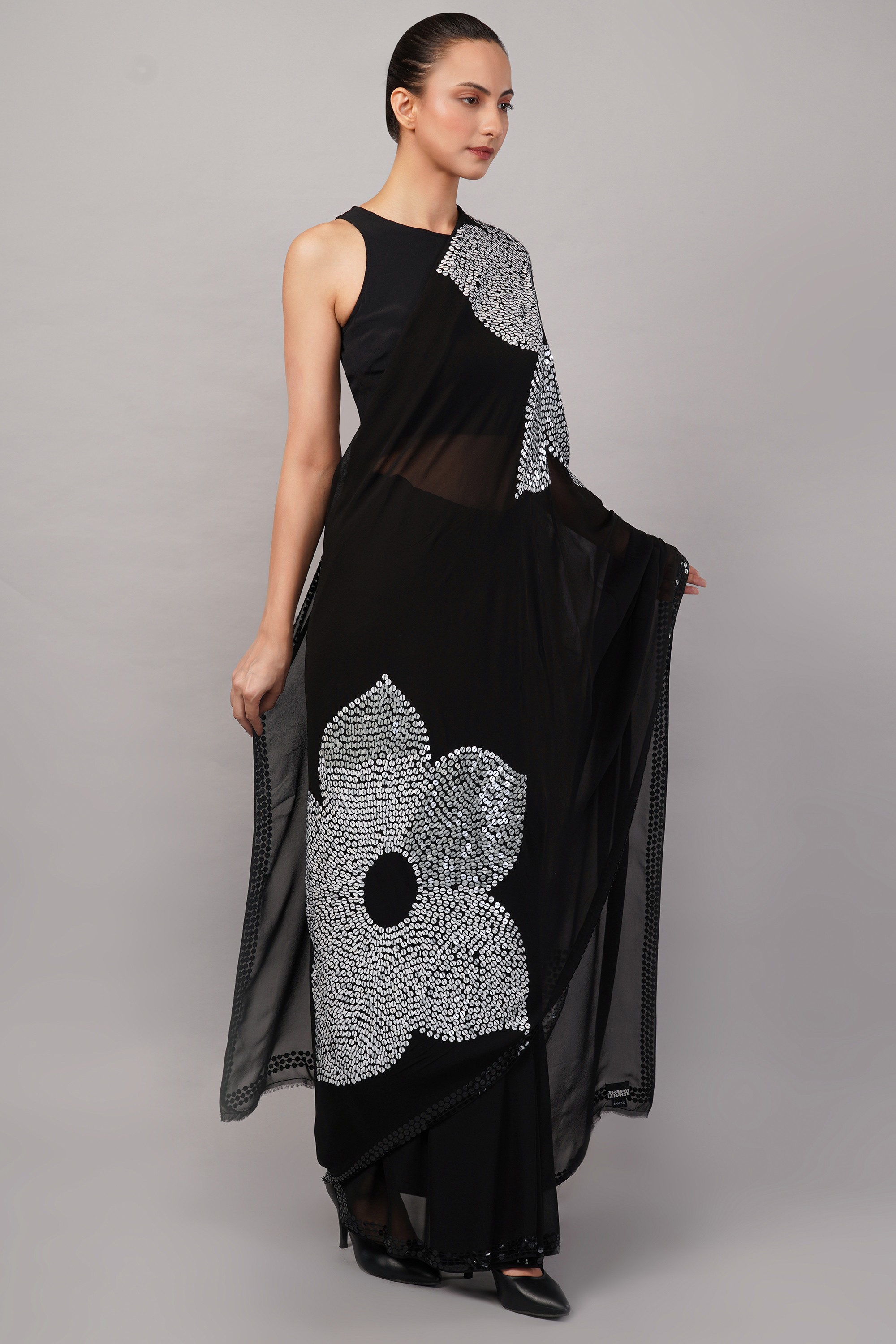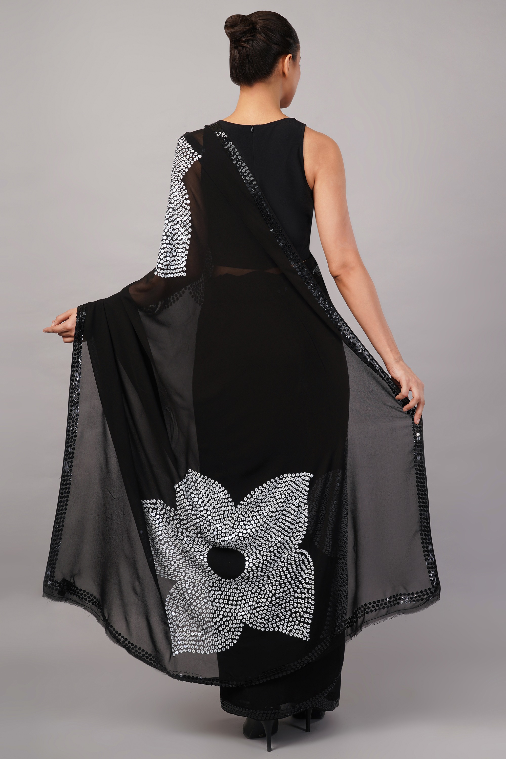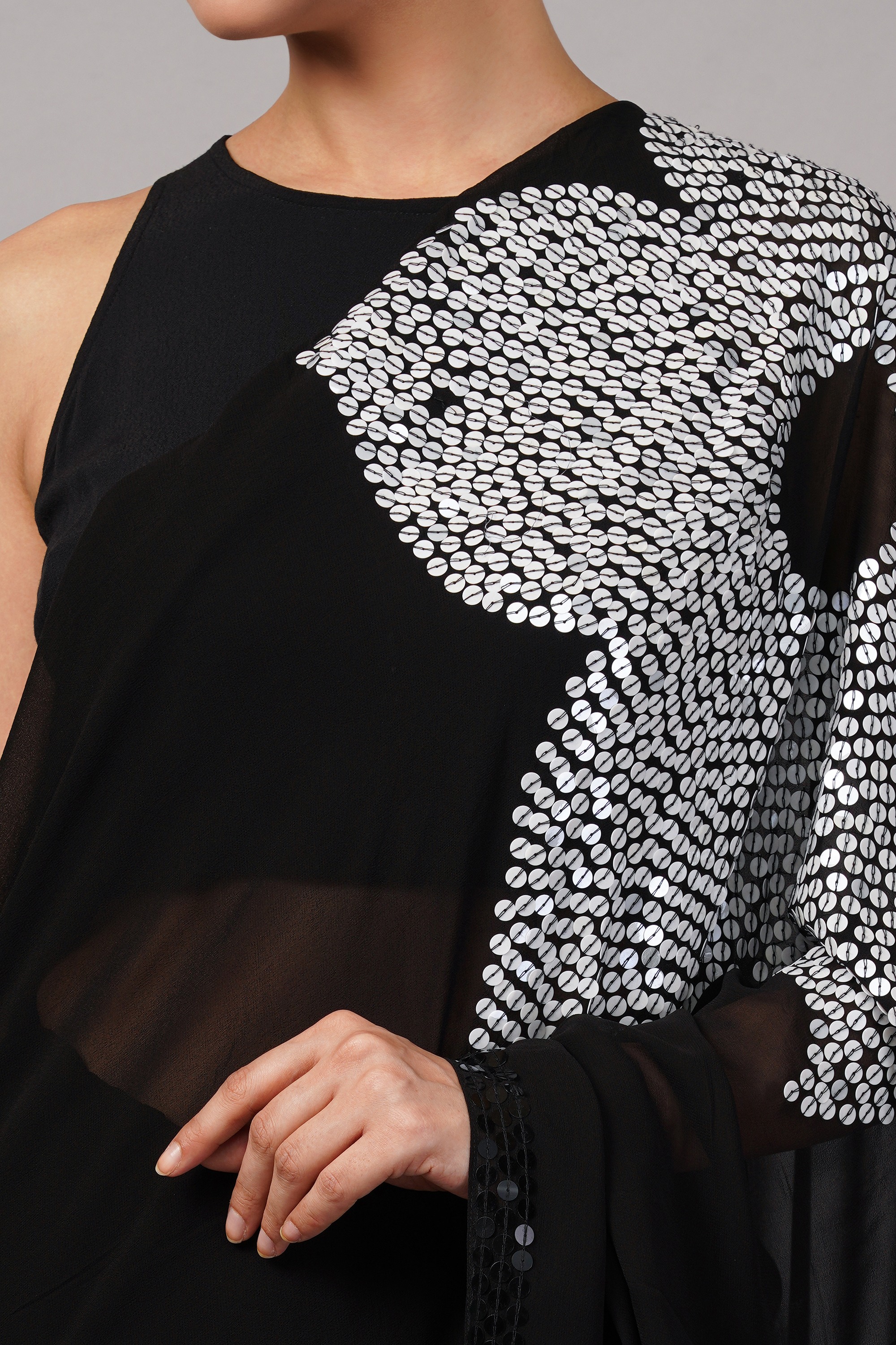 This limited edition piece has been made using a georgette fabric textured with an all over tweed print and embellished with hand done large sequin flowers that make a fashion statement.