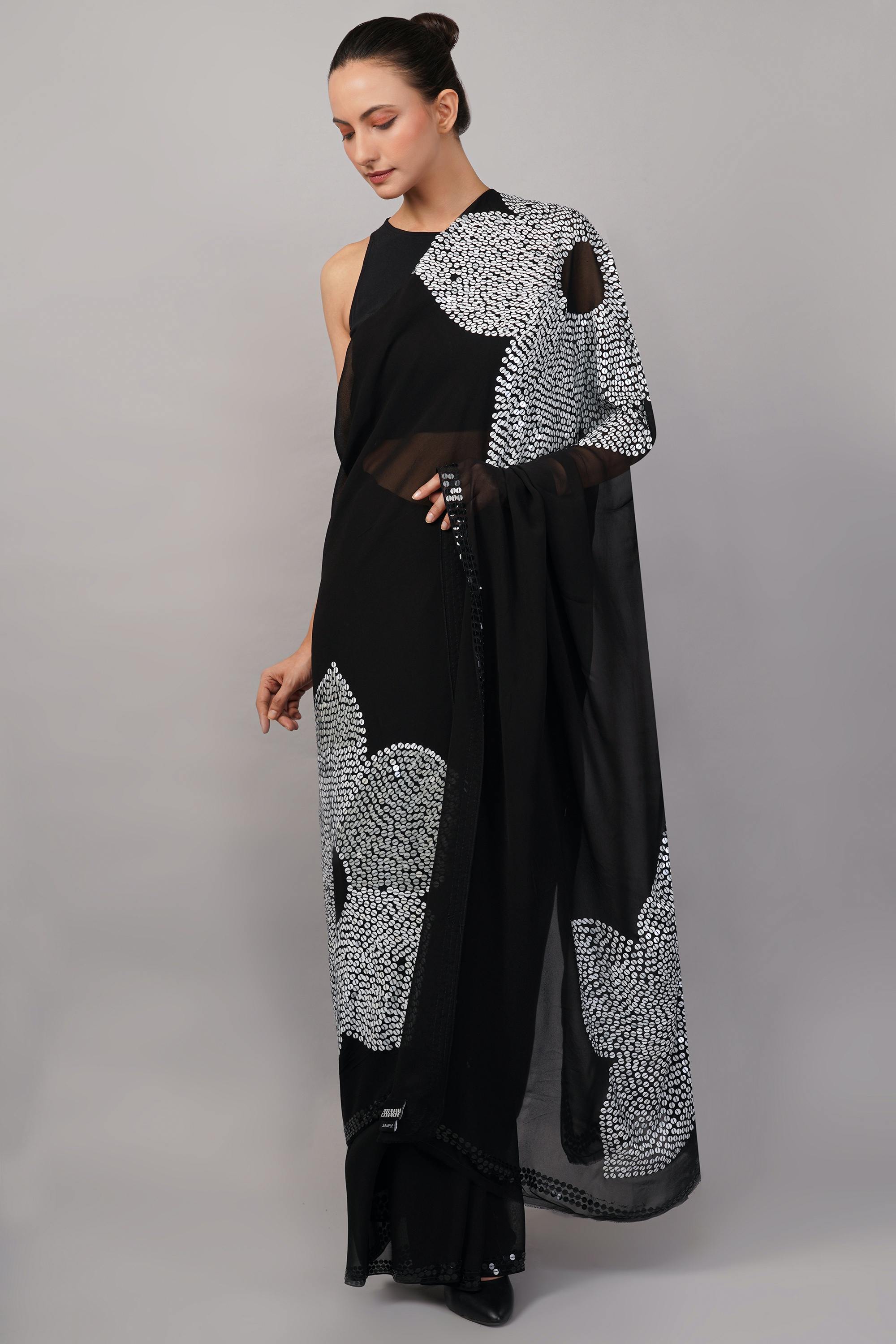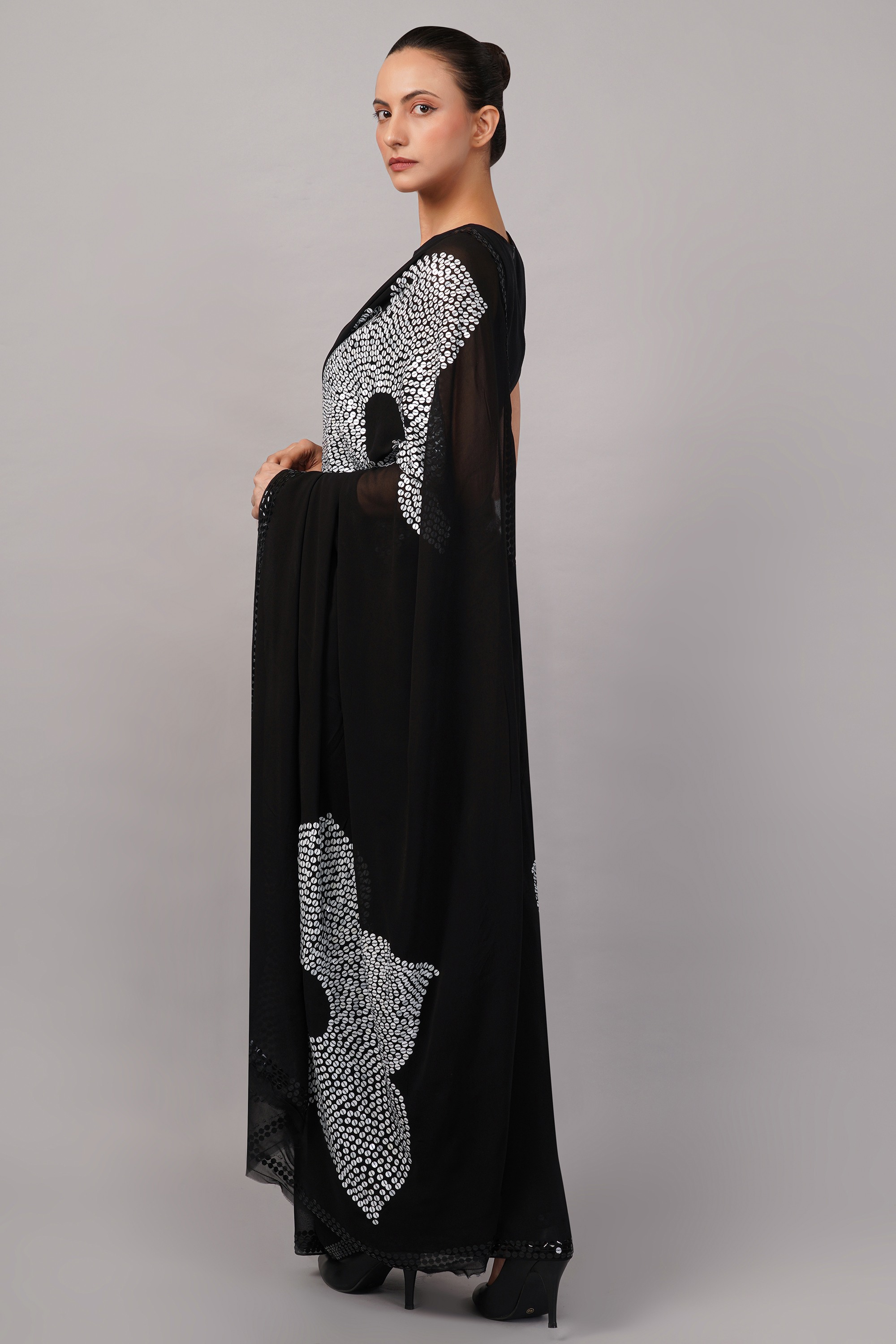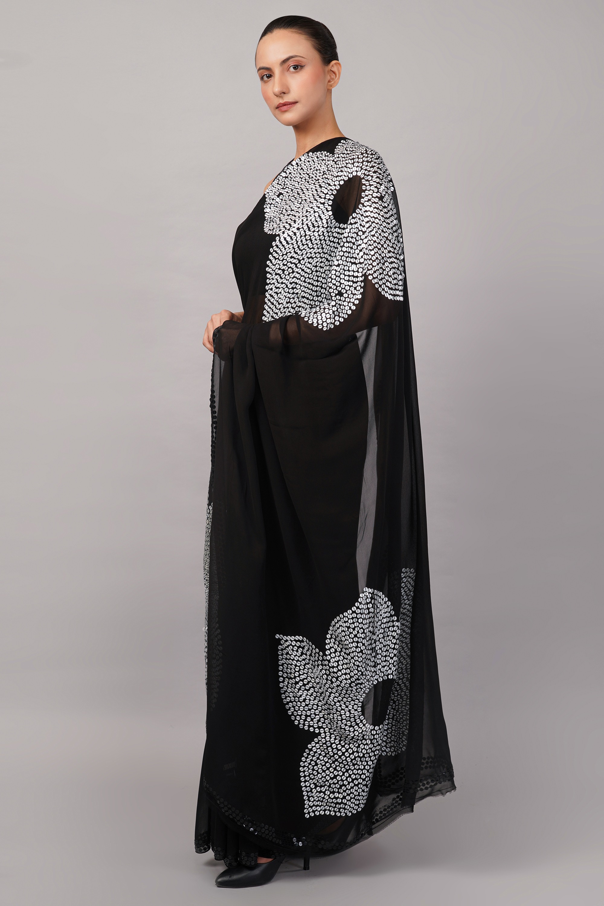 This limited edition piece has been made using a georgette fabric textured with an all over tweed print and embellished with hand done large sequin flowers that make a fashion statement.
