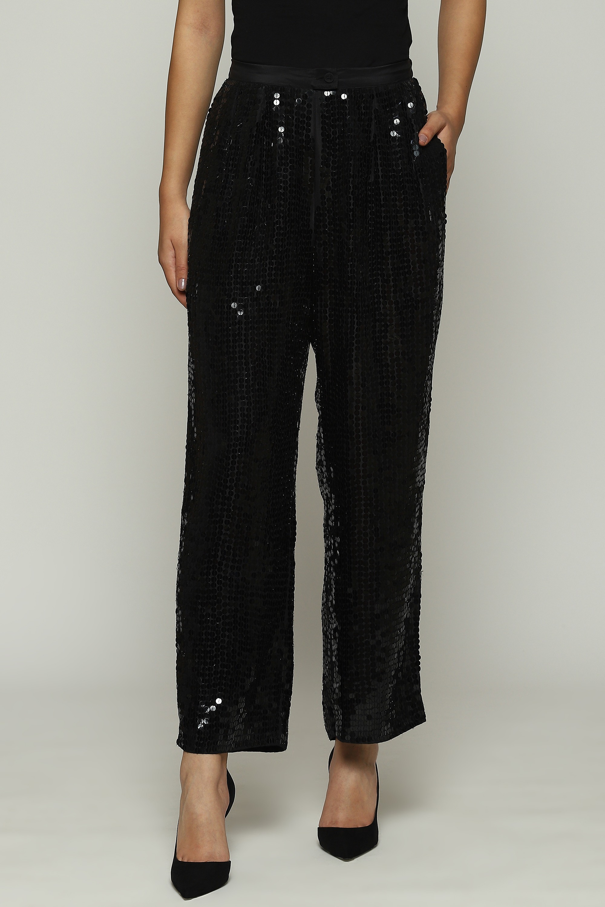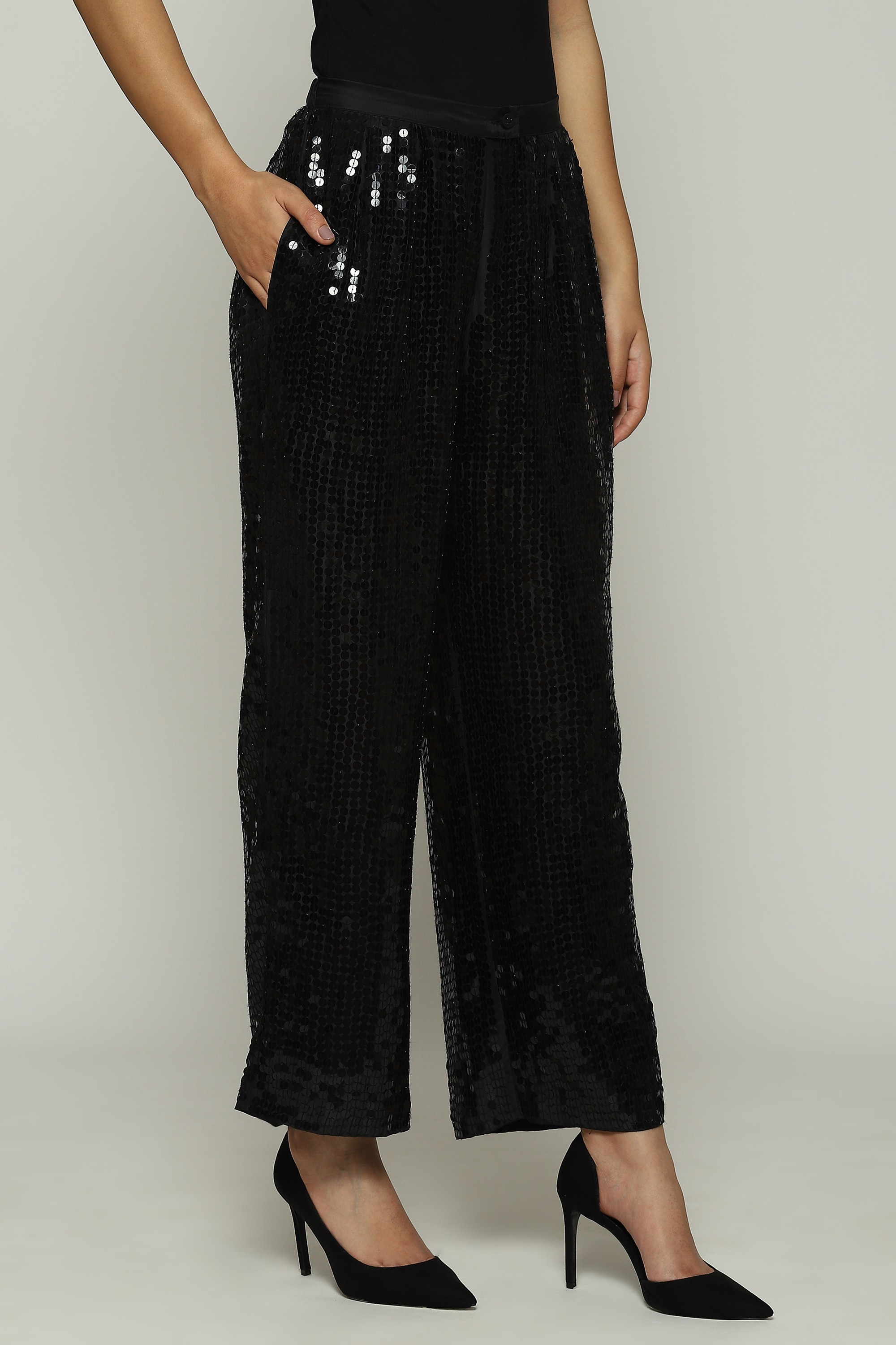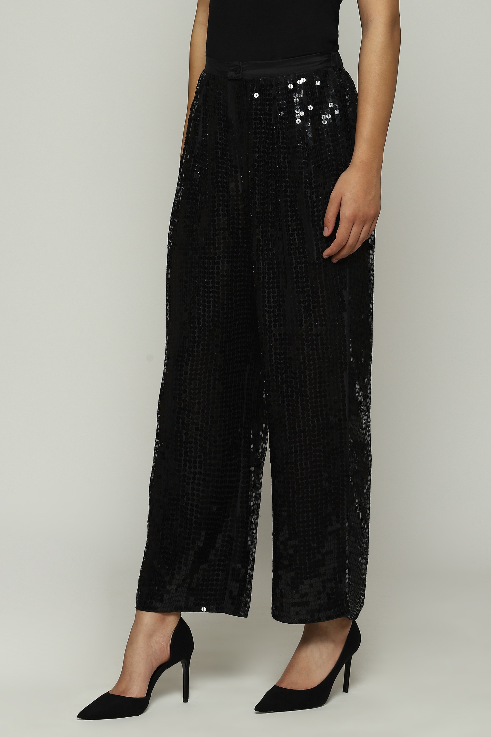 A pair of black straight pants hand-embellished with sequins, metal strips, pearls and beads.