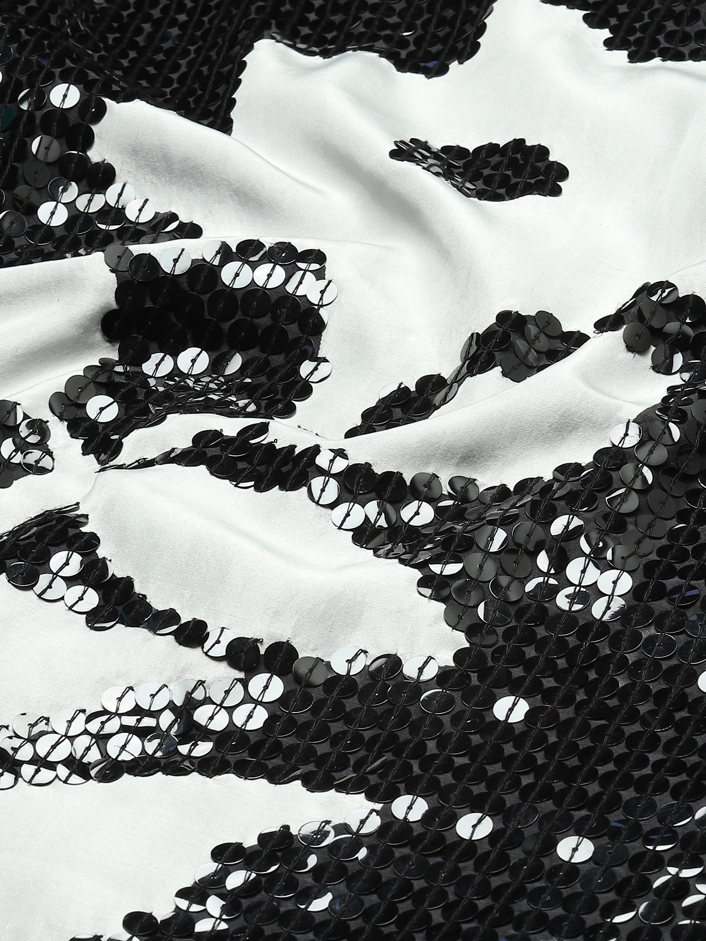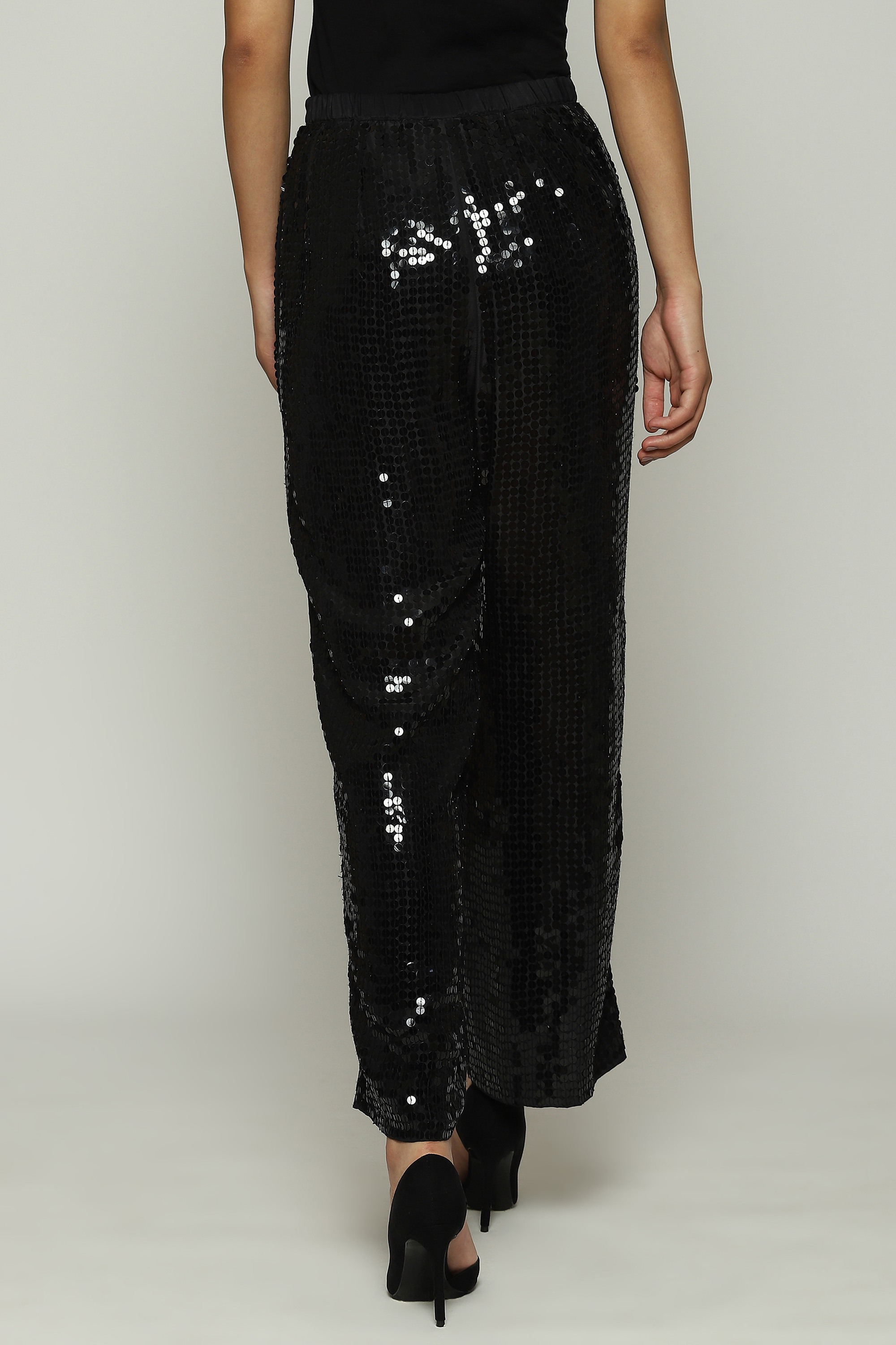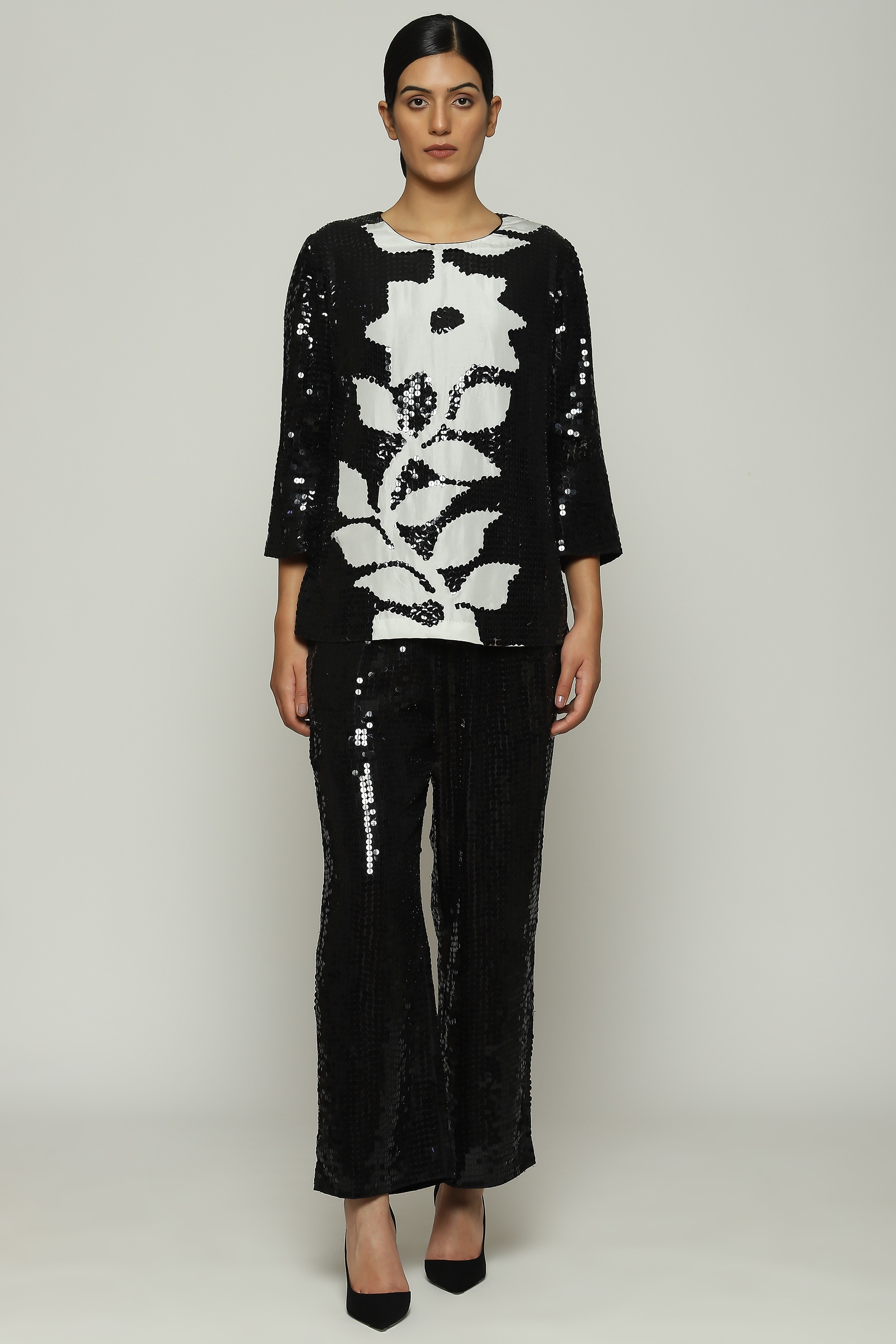 A pair of black straight pants hand-embellished with sequins, metal strips, pearls and beads.