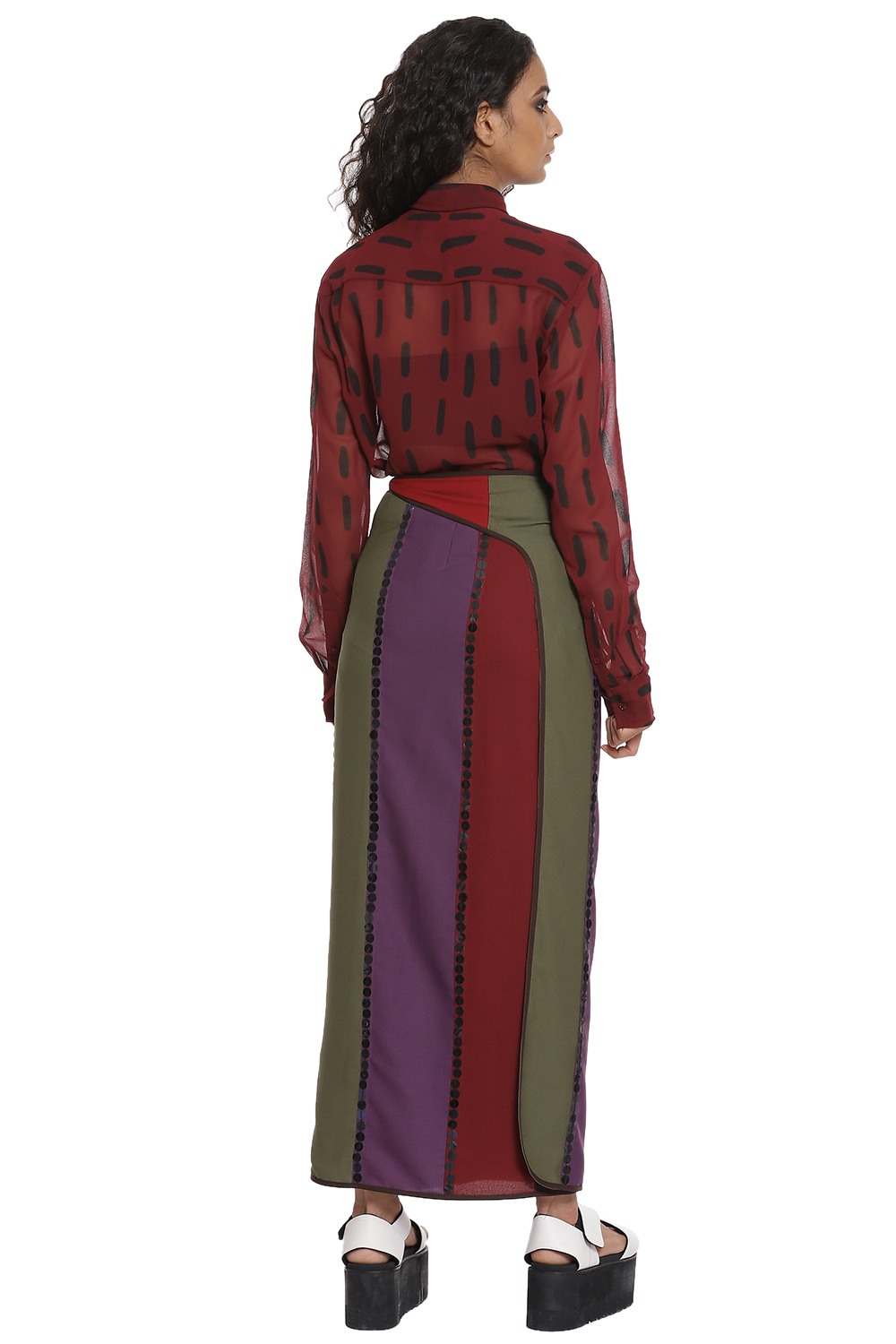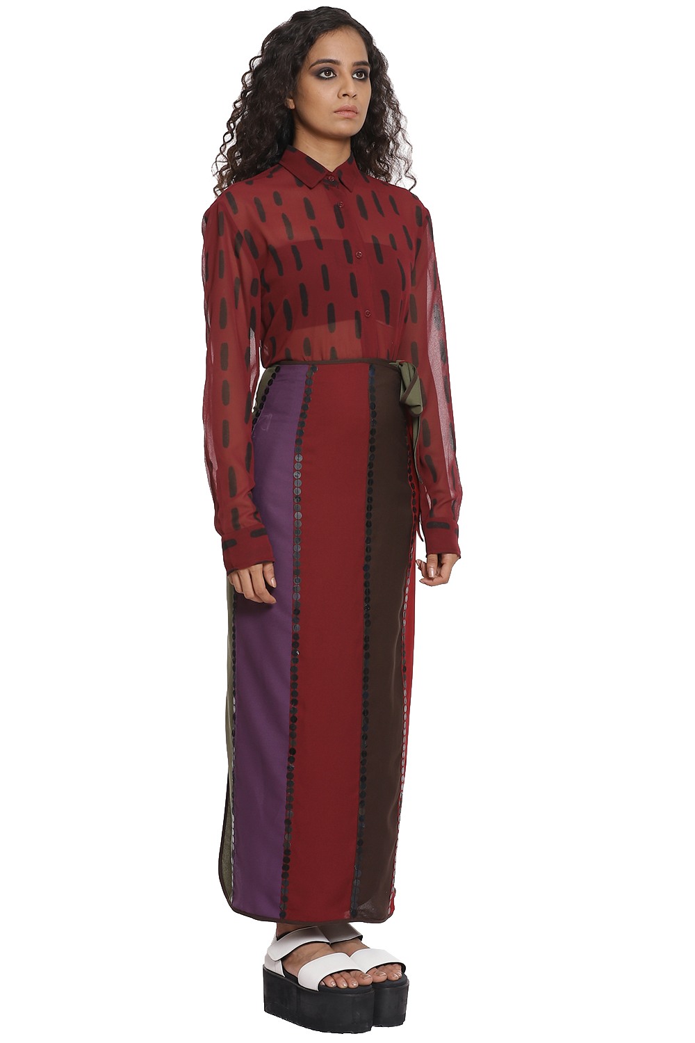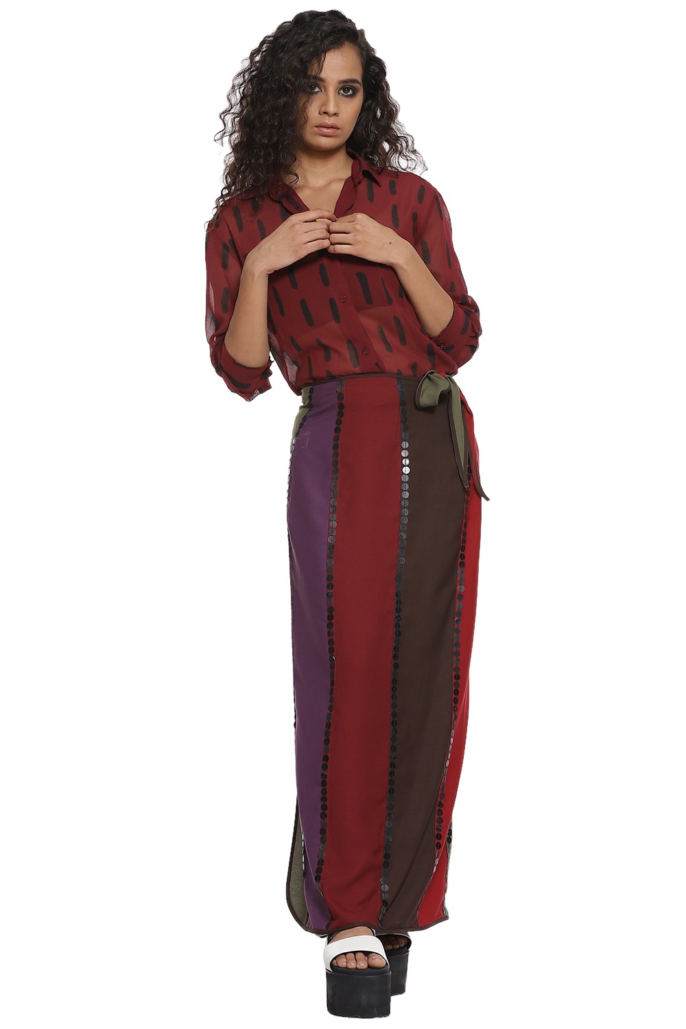 Kantha large print shirt in burgundy and black. Crafted from R-ELAN green gold fabric in a georgette structure. Teamed with multicolour stripe wrap skirt in coffee, wine, black and seagrass detailed with sequins from discarded X-ray sheet. Crafted from R-ELAN green gold fabric in a crepe structure.