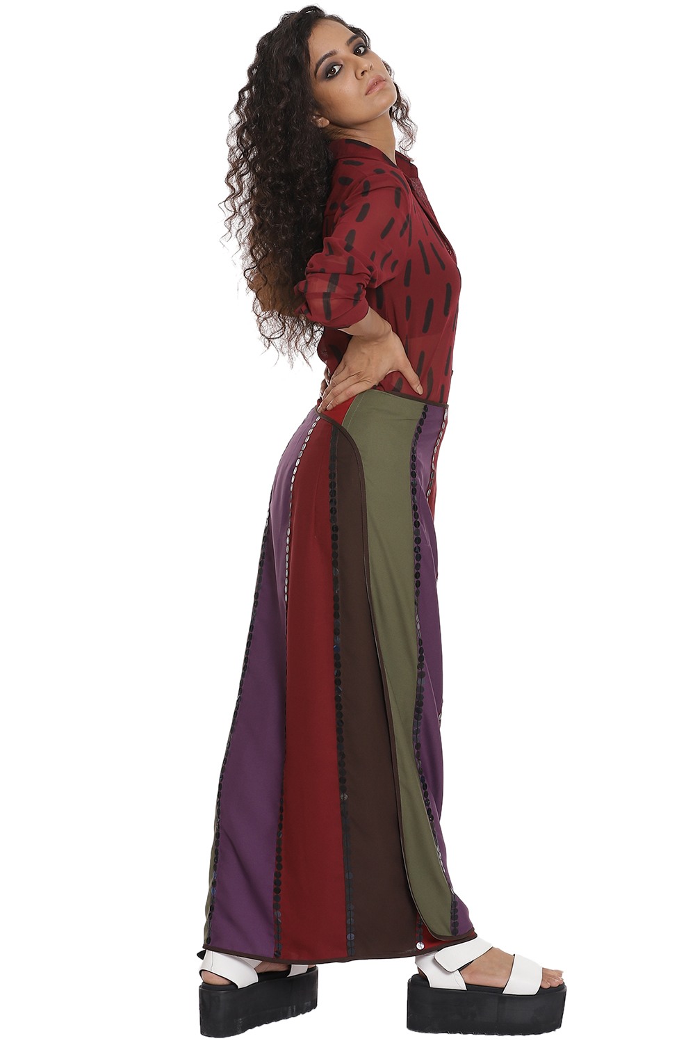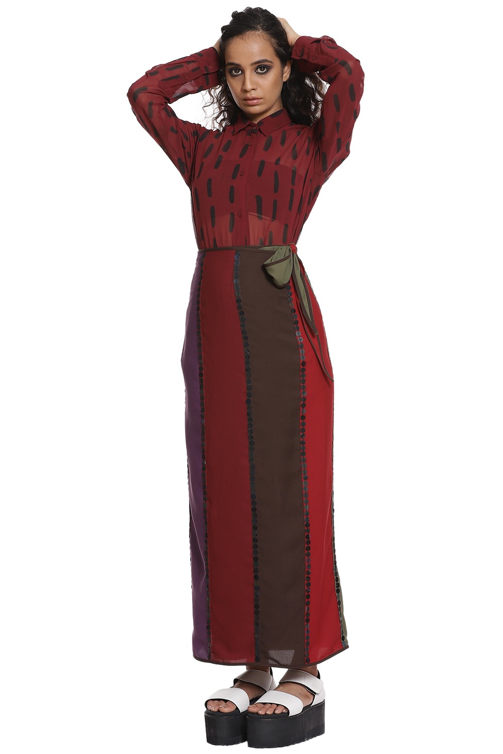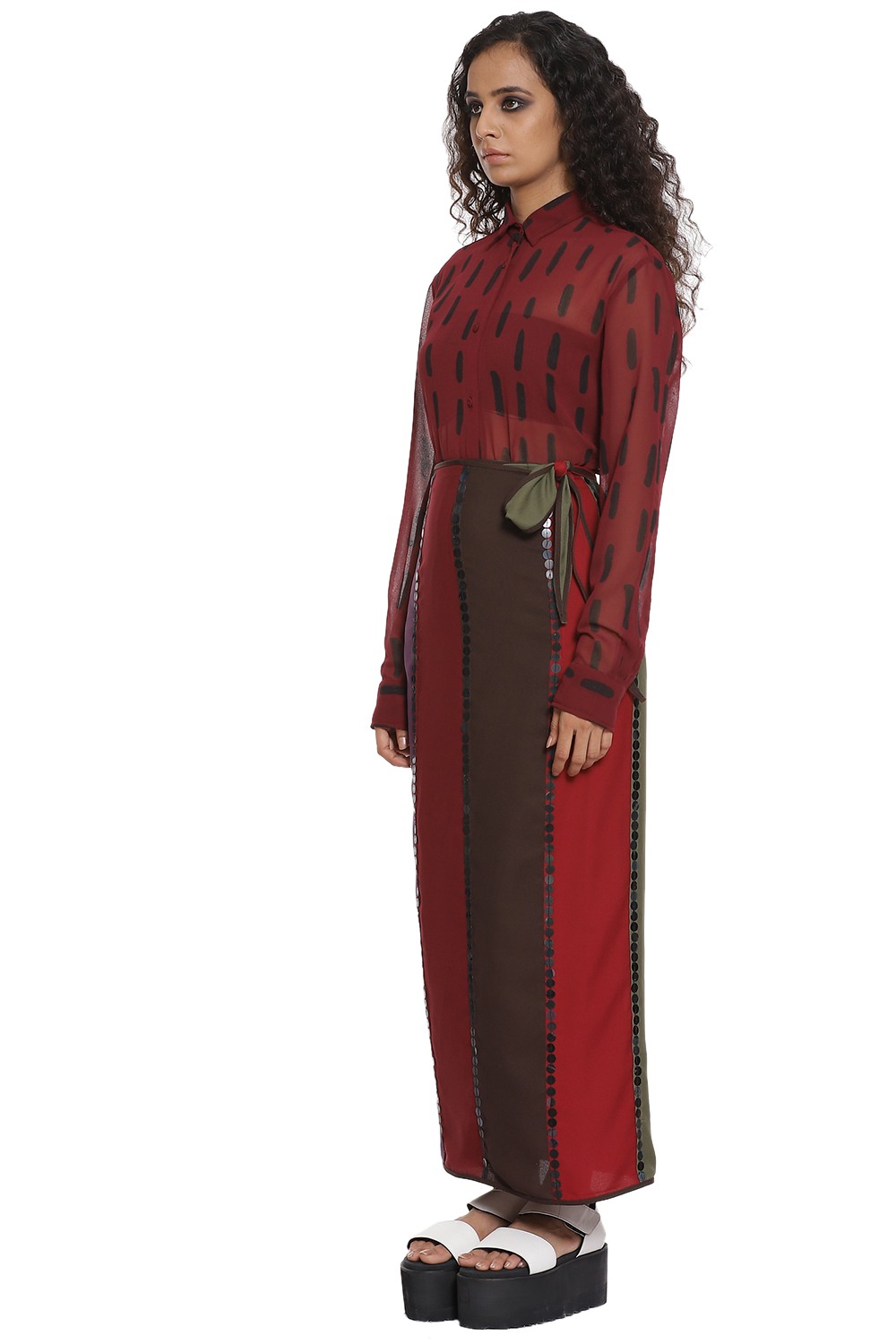Kantha large print shirt in burgundy and black. Crafted from R-ELAN green gold fabric in a georgette structure. Teamed with multicolour stripe wrap skirt in coffee, wine, black and seagrass detailed with sequins from discarded X-ray sheet. Crafted from R-ELAN green gold fabric in a crepe structure.